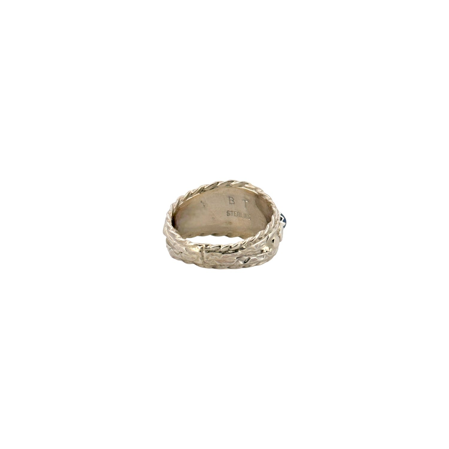 This Navajo handmade ring by Tyrin Begay features deep blue Lapis Lazuli stones set in an intricately crafted sterling silver band. The rich lapis hues contrast beautifully with the bright silver, highlighting the natural depth and character of each stone. Detailed silverwork, including hand-stamped patterns, bead accents, and twisted wire borders, showcases Begay’s refined craftsmanship. Its tapered design provides both comfort and a bold, sculptural presence on the hand. A striking blend of traditional artistry and vibrant gemstone color, this ring is a standout example of Navajo silversmithing.