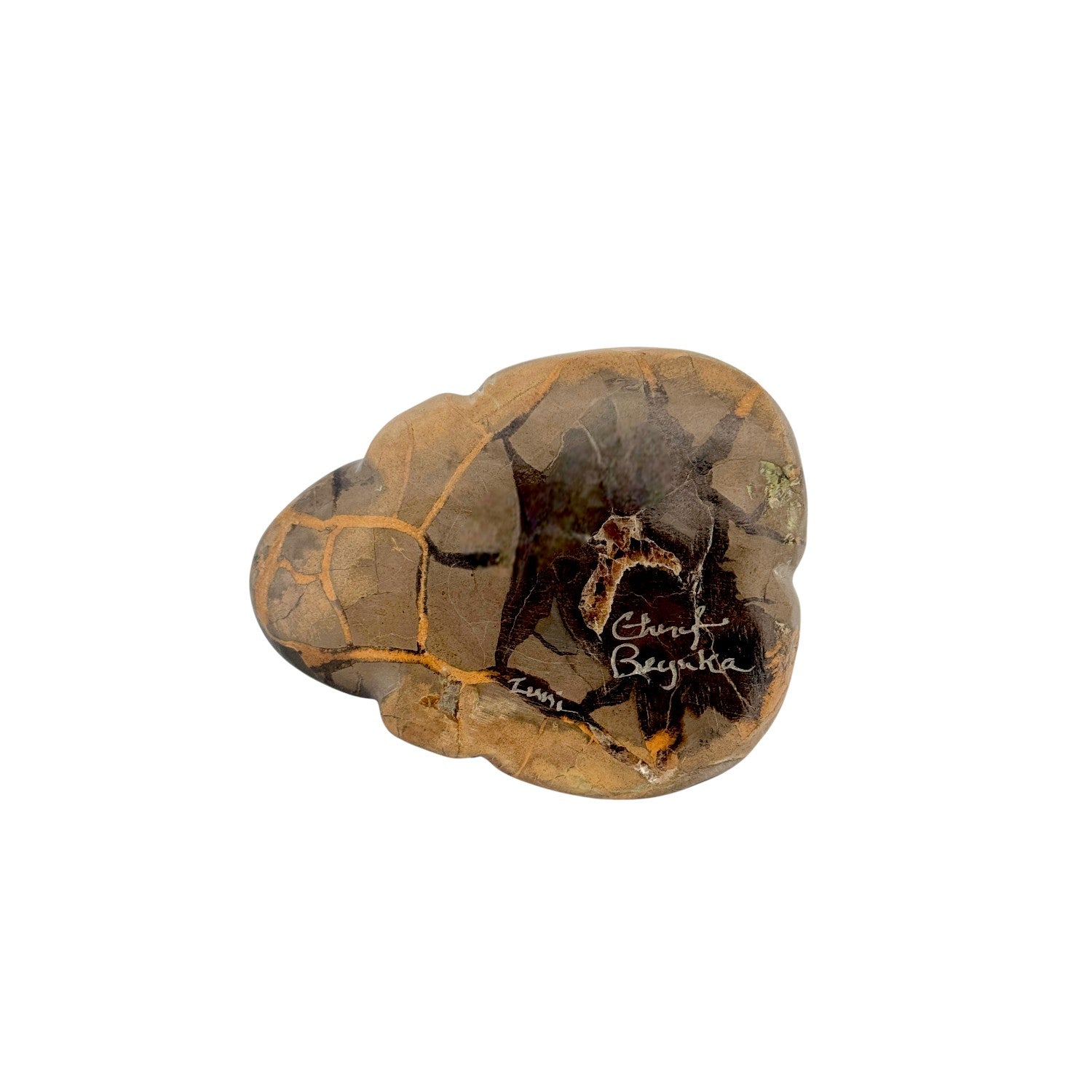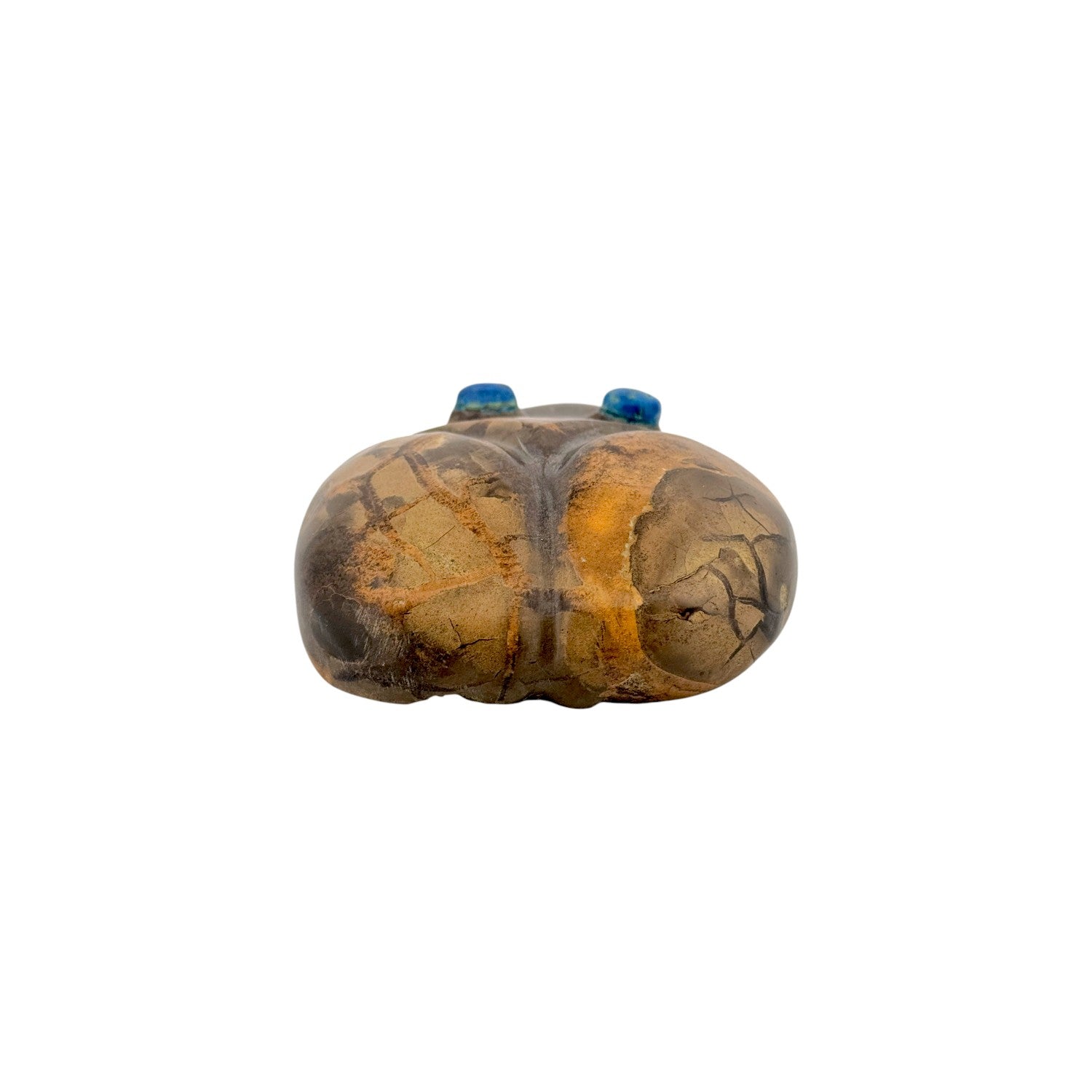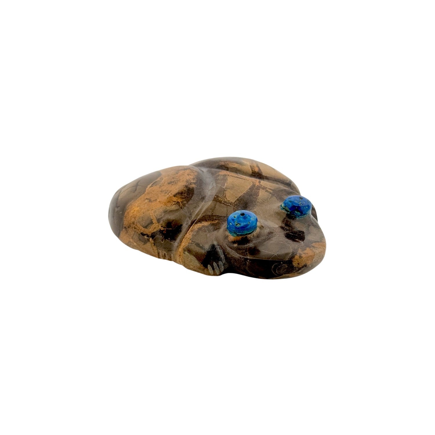This Zuni hand-carved Frog Fetish by Cheryl Beyuka is sculpted from richly patterned jasper, displaying earthy browns and warm golden tones throughout the stone. The frog’s smooth, rounded form captures a sense of calm and grounded presence. Lapis lazuli inlaid eyes provide a bold pop of deep blue, creating striking contrast against the natural jasper surface. Subtle carving details along the body enhance the lifelike character while maintaining a clean, contemporary silhouette. Symbolizing renewal, cleansing, and life-giving water, this handcrafted piece is a beautiful expression of Zuni artistry and tradition.