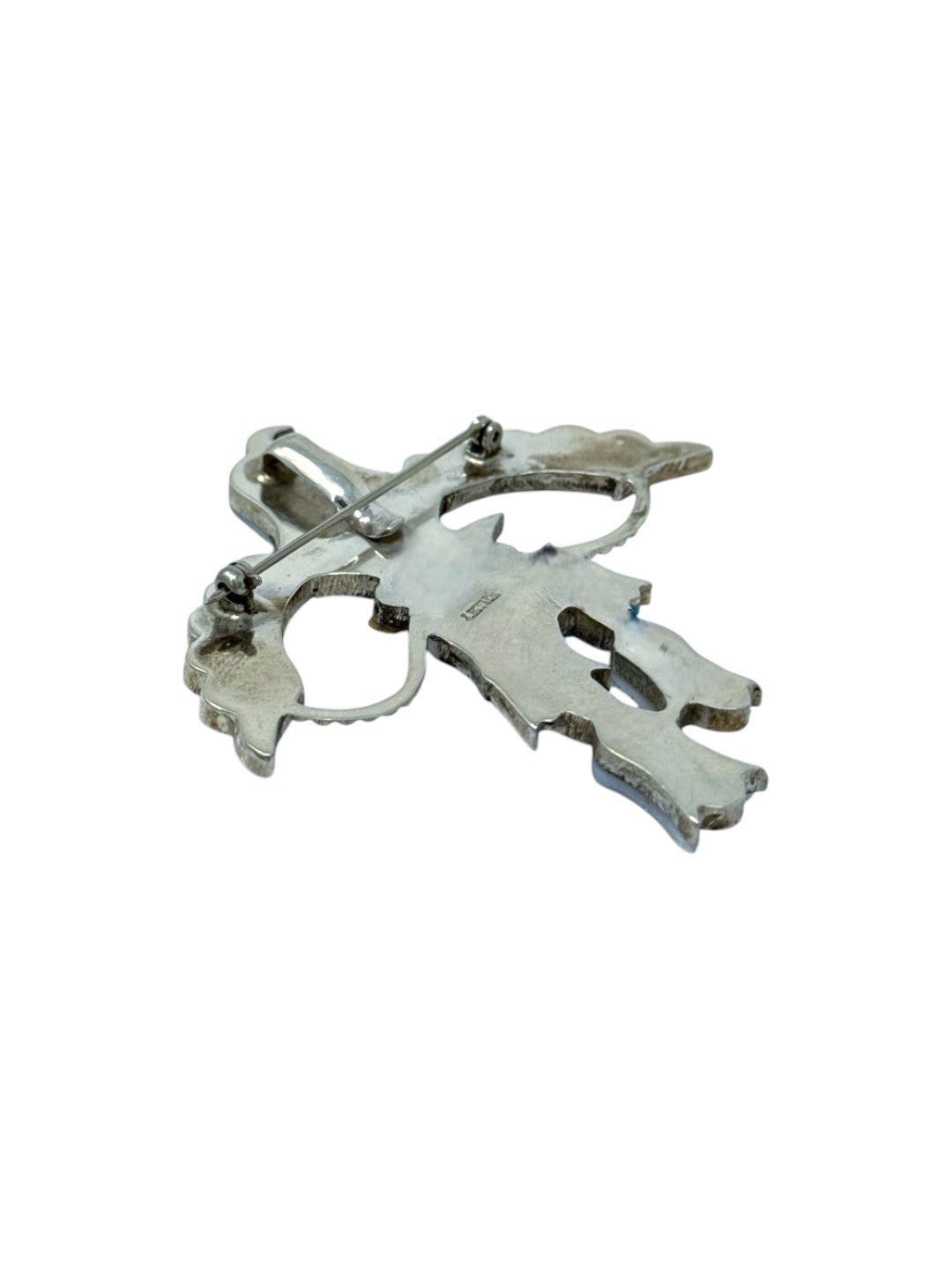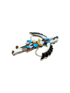 This captivating Eagle Dancer pin and pendant by renowned Zuni artist Jonathan Beyuka is a stunning tribute to traditional dance and Indigenous artistry. Handmade from sterling silver and inlaid with multi-stone materials such as turquoise, jet, coral, shell, and mother of pearl, the piece depicts a dancer in full ceremonial regalia with widespread eagle wings. Each stone is intricately hand cut and precisely set to form a vivid, detailed figure in motion. The dancer’s posture and detailed adornments embody the spiritual symbolism of the eagle strength, freedom, and connection to the heavens. The piece is dual purpose, designed to be worn as both a pin and pendant, offering versatility in style. Beyuka’s masterful craftsmanship brings cultural heritage to life with grace and intention. This wearable art is a powerful statement of tradition, spirit, and Zuni pride.