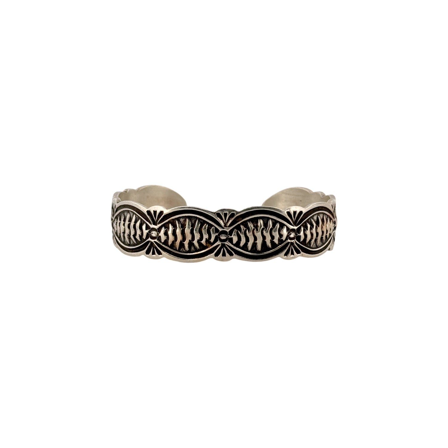 This Arnold Blackgoat bracelet is a refined example of traditional Navajo sterling silver craftsmanship. The cuff features intricate stamp work set within flowing, scalloped borders that create a rhythmic and balanced design. Deeply oxidized details highlight the hand-stamped patterns, adding contrast and dimension to the polished silver surface. The solid construction provides a comfortable yet substantial feel on the wrist, making it ideal for everyday wear or special occasions. Timeless and expertly handcrafted, this piece reflects Arnold Blackgoat’s dedication to classic Navajo silversmithing traditions.