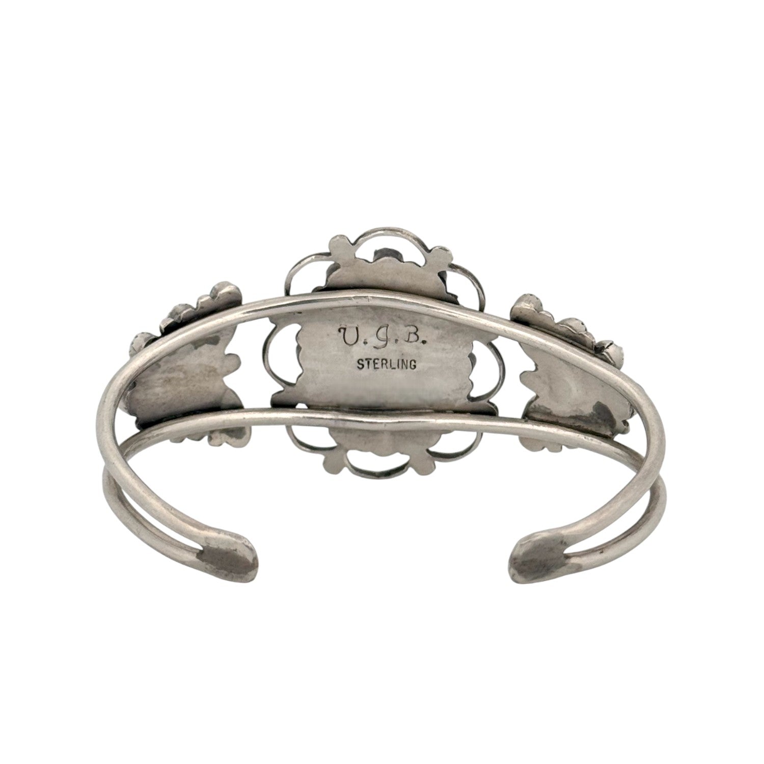 This exquisite Zuni handmade bracelet by Viola and Jacob Bobelu captures the timeless artistry of traditional Zuni cluster work. Handcrafted from sterling silver, it features brilliant Sleeping Beauty Turquoise stones arranged in a radiant floral pattern that reflects precision and balance. Each turquoise stone is hand-cut and set in delicate bezels, framed by silver beads and twisted wire for added texture and depth. The split-shank cuff enhances the design’s symmetry and provides a comfortable, elegant fit.