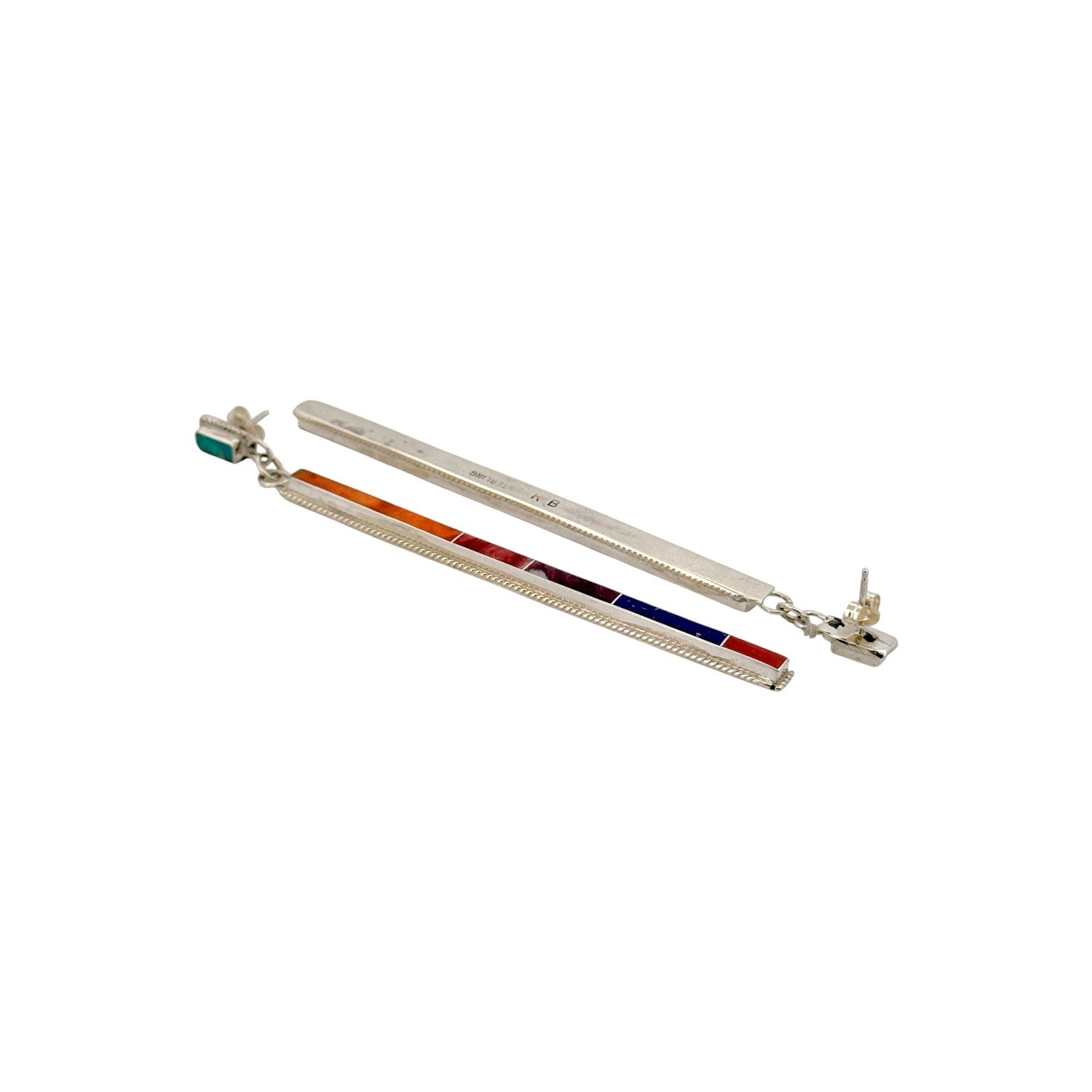 These Ricky Booqua earrings are a striking example of Zuni handmade inlay artistry set in sterling silver. Designed in a sleek, elongated silhouette, each earring features vibrant Kingman turquoise at the top, followed by carefully arranged segments of orange spiny oyster shell, red spiny oyster shell, purple spiny oyster, lapis lazuli, and coral. The bold color blocking creates a stunning vertical mosaic that showcases precise stone-to-stone inlay craftsmanship. Delicate silver borders frame each section, adding definition and highlighting the clean geometric design. Contemporary yet rooted in tradition, these earrings reflect Ricky Booqua’s mastery of color, balance, and classic Zuni stonework.