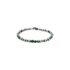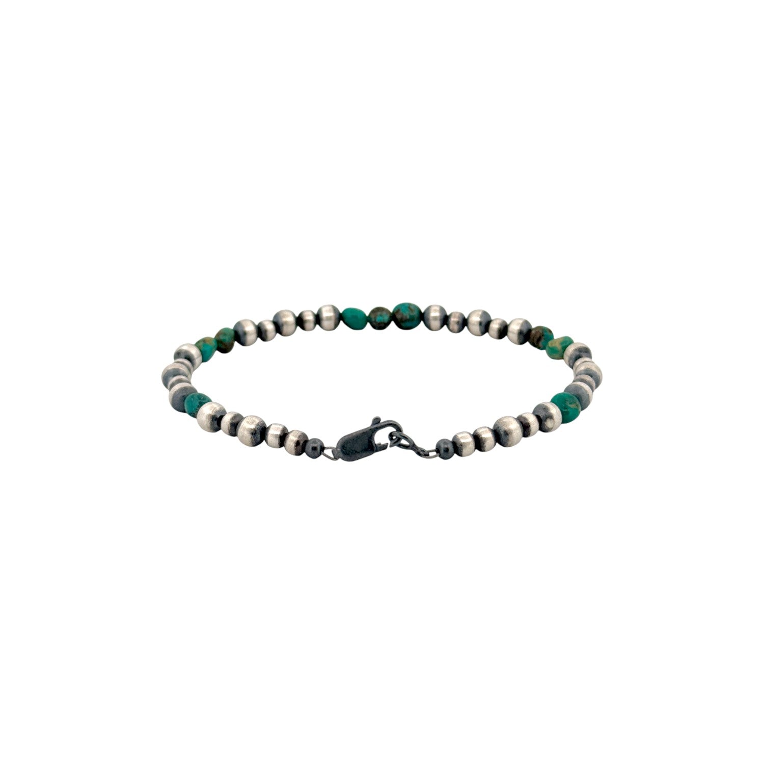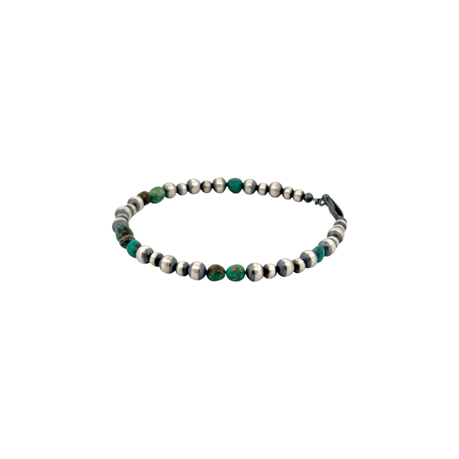This refined bracelet features machine-made silver pearls accented with vibrant Kingman turquoise, creating a timeless blend of texture and color. Each bead is hand-strung by a local Native artisan, reflecting generations of tradition, precision, and artistry. The natural turquoise stones add a rich pop of blue-green hues that beautifully complement the depth of the oxidized sterling silver. Lightweight and comfortable, this piece is perfect for everyday wear while maintaining an elevated, polished look. With its harmonious balance of heritage and modern style, this bracelet is a stunning addition to any jewelry collection.