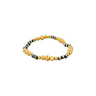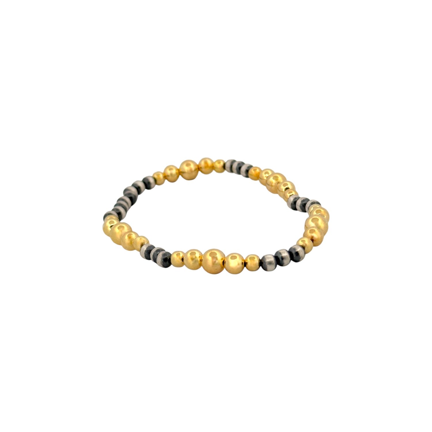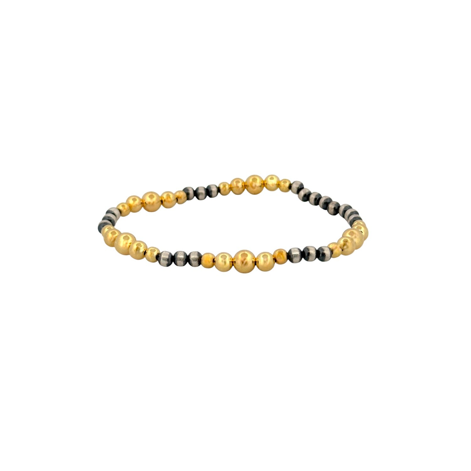 This radiant bracelet features a refined blend of machine-made silver pearls and brilliant gold-plated beads, creating a striking contrast of light and depth. Every bead is hand-strung by a local Native artisan, honoring a legacy of meticulous craftsmanship and cultural tradition. The warm golden tones pair beautifully with the oxidized sterling silver, offering a sophisticated balance of modern shine and classic Southwestern character. Designed with comfort and versatility in mind, it adds effortless elegance to both casual and elevated looks. Timeless and artfully crafted, this bracelet brings an elevated touch of heritage-inspired style to any jewelry collection.