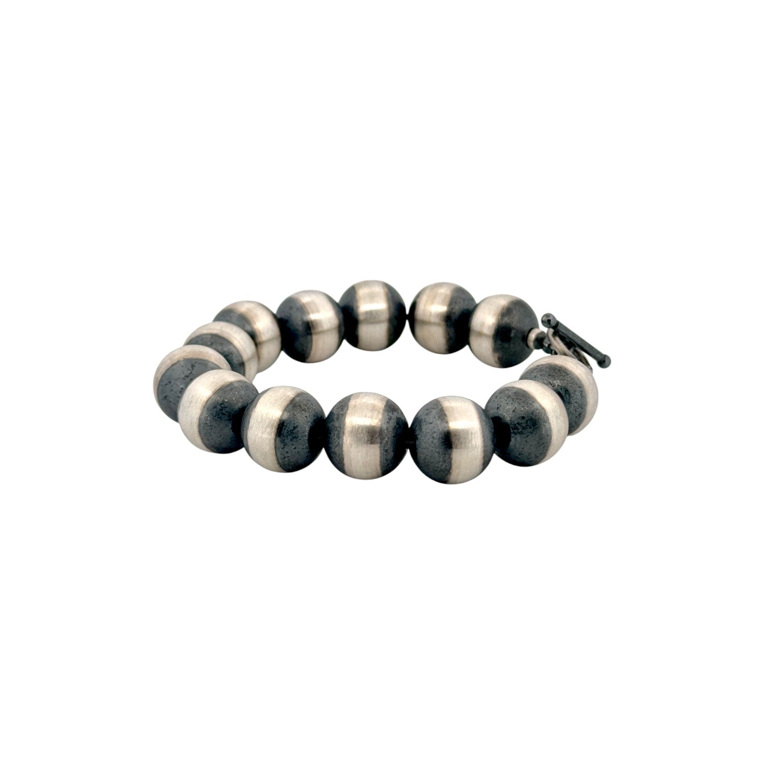 This bold bracelet features large machine-made silver pearls that showcase a striking blend of oxidized and satin-finished sterling silver. Each bead is hand-strung by a local Native artisan, honoring generations of craftsmanship and attention to detail. The weight and presence of the pearls give the piece a luxurious feel while maintaining a timeless Southwestern character. Its secure clasp adds both durability and elegance, making it ideal for daily wear or special occasions. With its refined simplicity and artisan touch, this bracelet embodies the perfect balance of tradition and contemporary style.