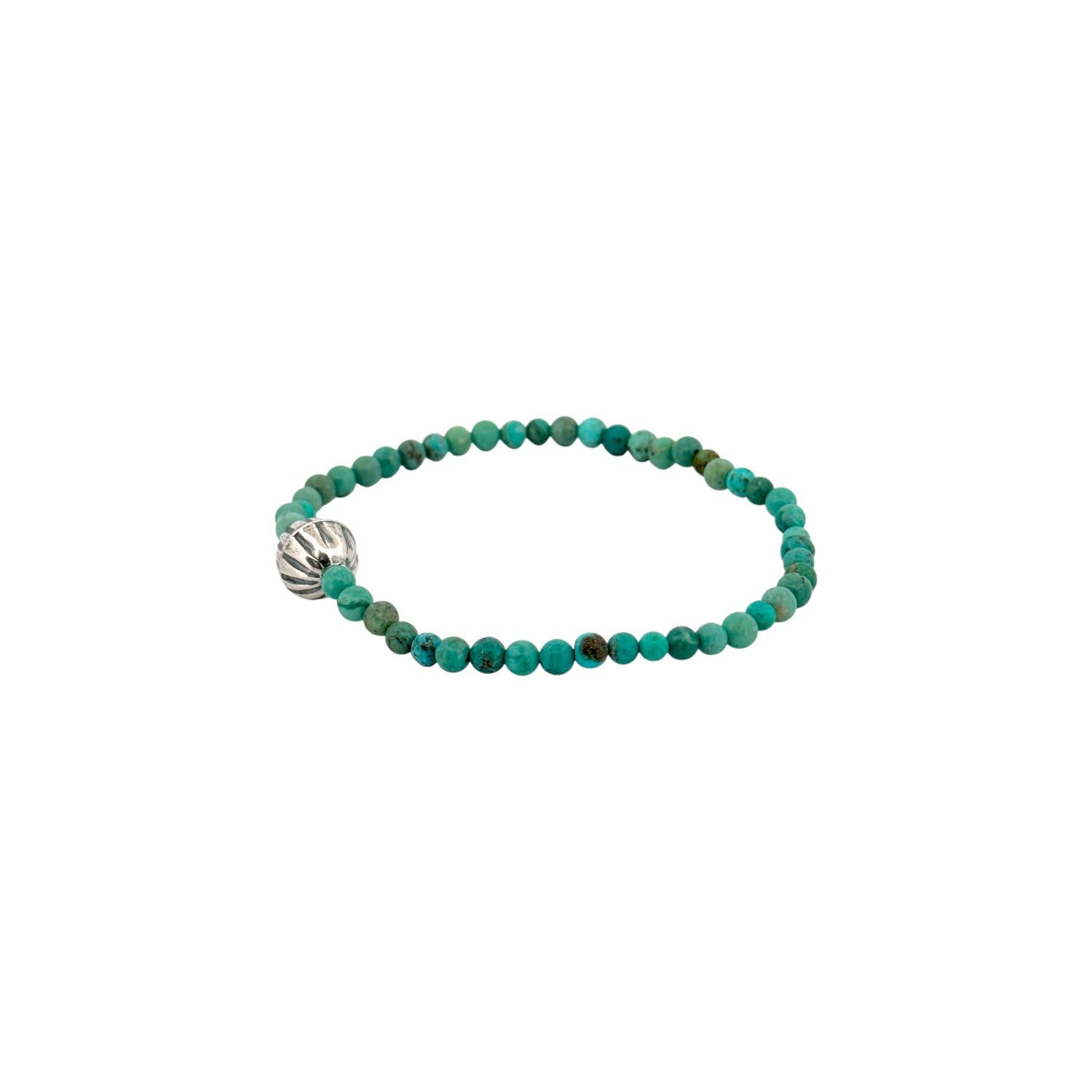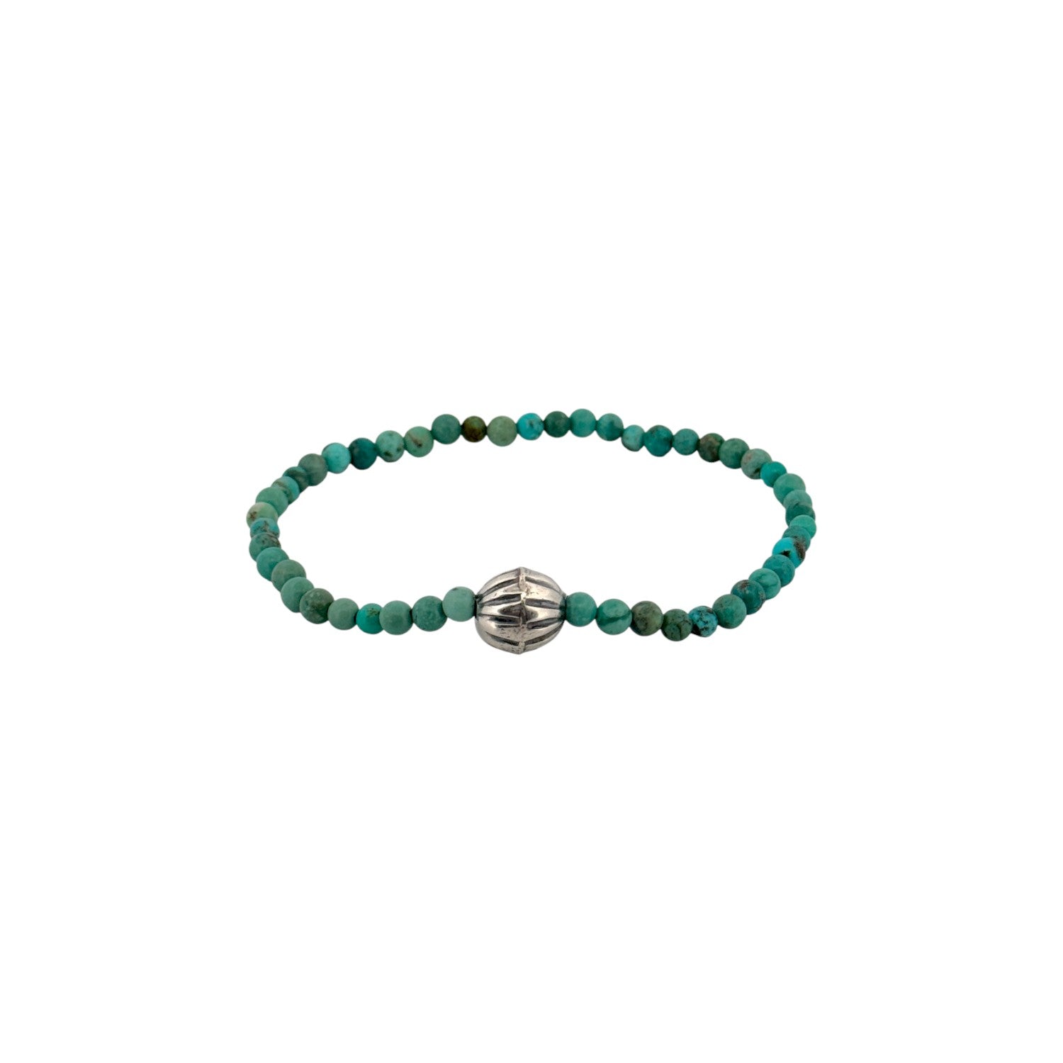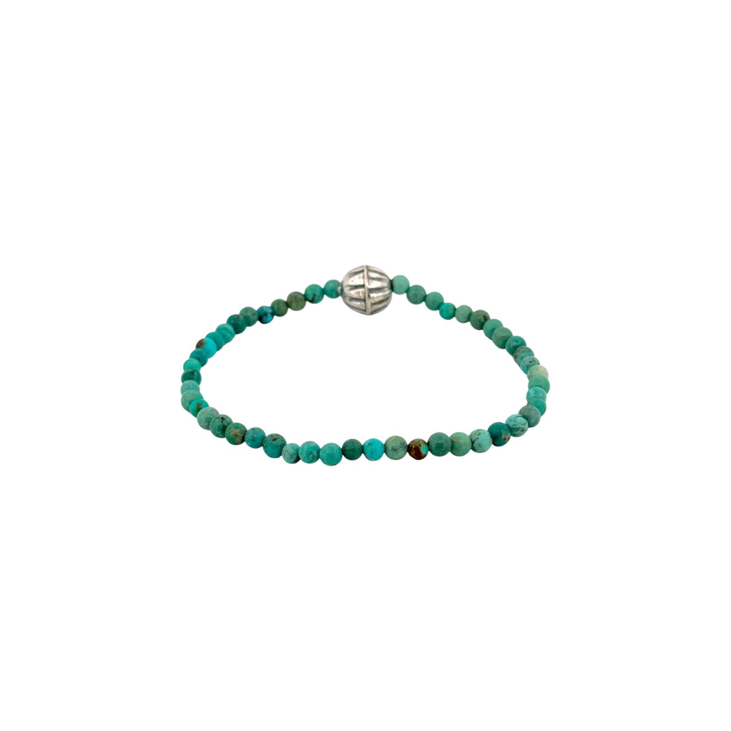 This elegant bracelet features fine Kingman turquoise beads accented by a beautifully detailed machine-made silver pearl at the center. Each bead is hand-strung by a local Native artisan, reflecting generations of refined craftsmanship and cultural tradition. The vibrant turquoise stones offer a refreshing burst of natural color that pairs perfectly with the polished sterling silver focal bead. Lightweight and comfortable, it’s ideal for stacking or wearing alone as a subtle statement of Southwestern elegance. With its timeless design and artisan-made quality, this bracelet brings authenticity and sophistication to any jewelry collection.
