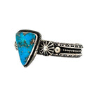 This sterling silver bracelet by Hemerson Brown is a striking example of Navajo handmade artistry. At its center lies a bold triangular Persian Turquoise stone, showcasing vivid blue hues with natural matrix that make it truly one of a kind. The stone is framed with a twisted silver rope bezel, adding depth and texture while drawing the eye to its vibrant color. On each side, stamped silver sunburst conchos and beadwork accents enhance the design, symbolizing light, life, and strength. The split-shank cuff adds balance and durability, making the piece both comfortable and substantial. Hemerson Brown’s craftsmanship reflects the traditions of Navajo silversmithing while highlighting the unique beauty of Persian Turquoise.