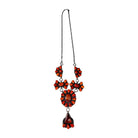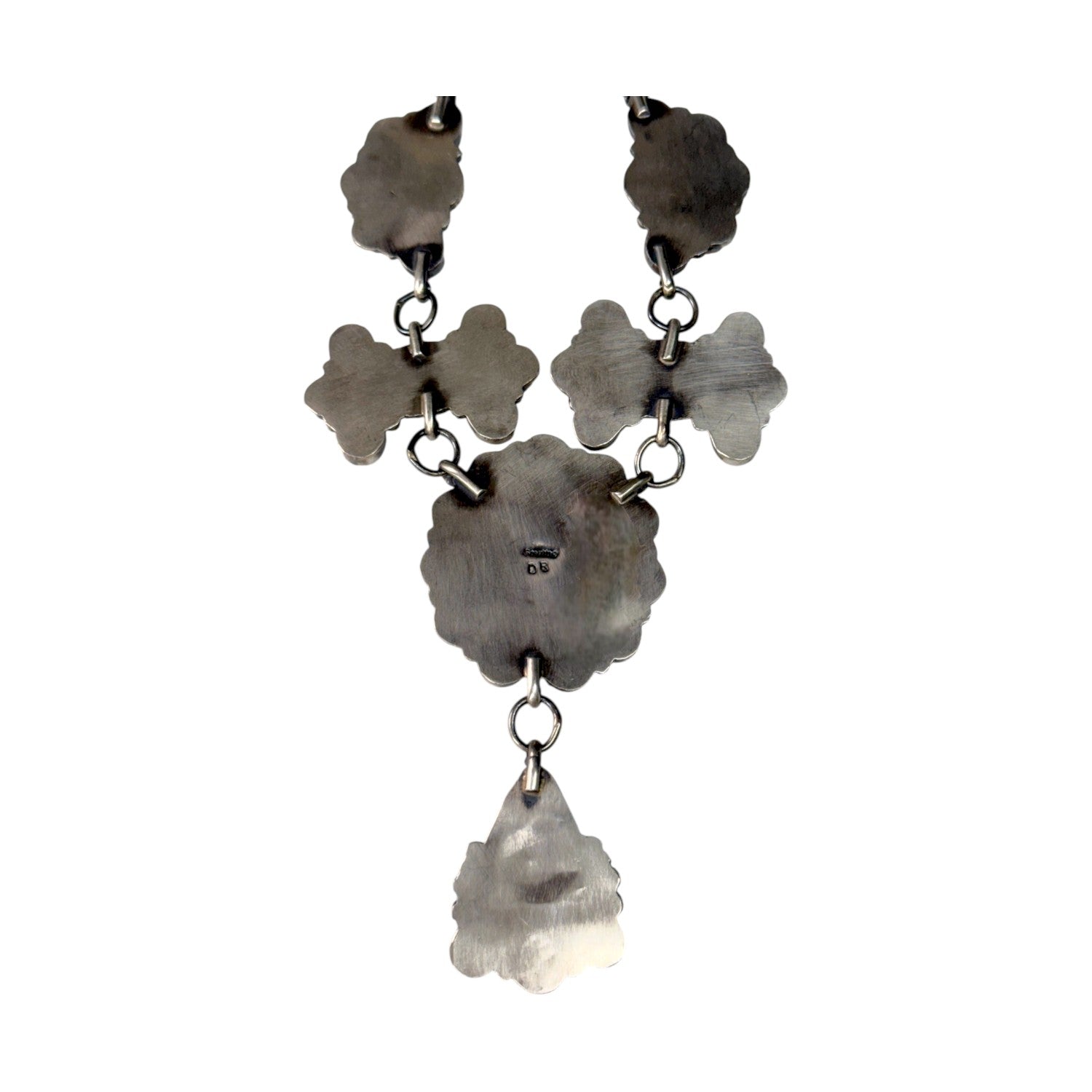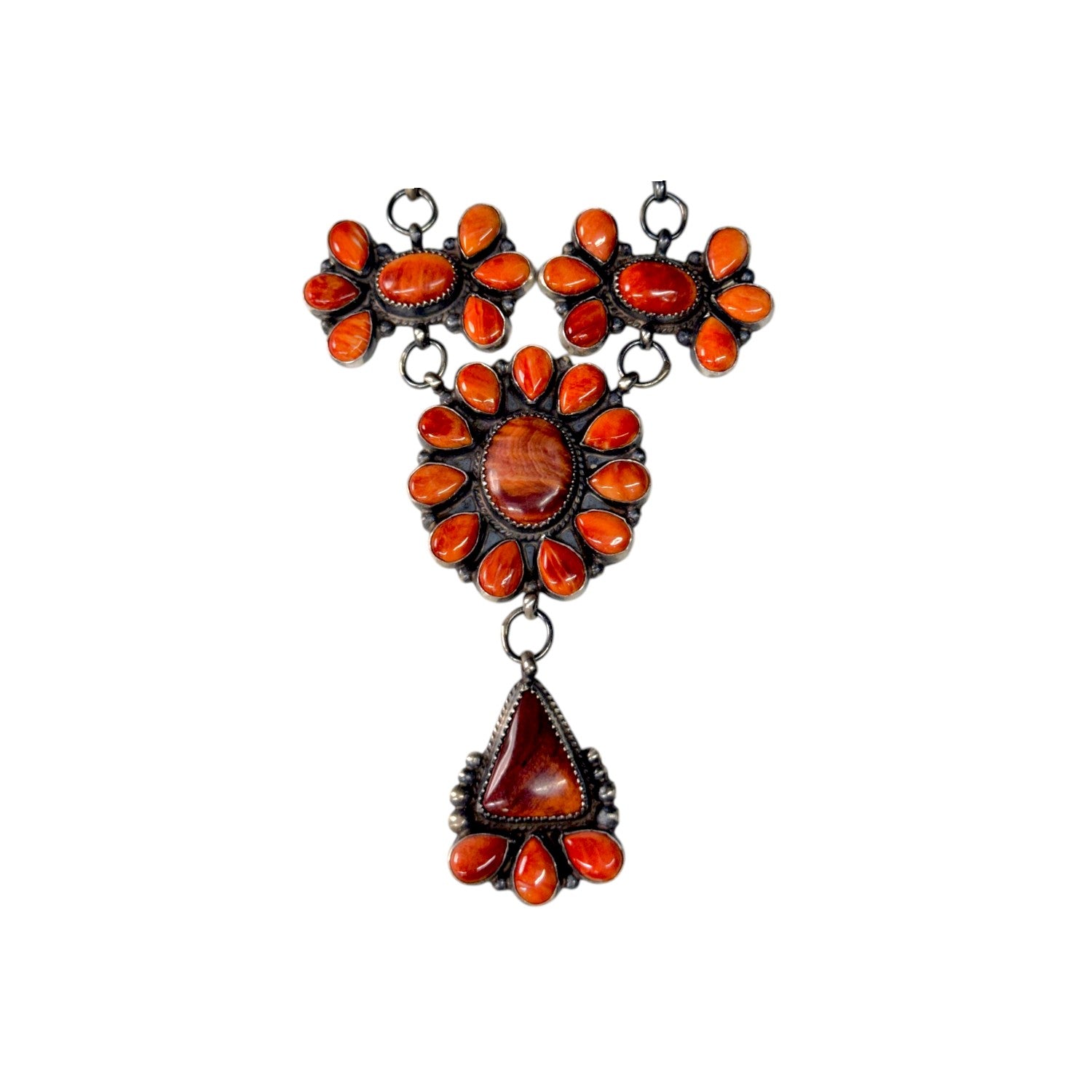 This striking Navajo Handmade necklace by Devin Brown showcases the rich, fiery hues of natural Spiny Oyster Shell set beautifully in sterling silver. The design features a bold floral arrangement of hand-cut shell stones, each carefully bezel-set and accented with traditional silverwork details that highlight the artist’s craftsmanship. A dramatic teardrop dangle anchors the piece, adding graceful movement and balance to the layered cluster design. The warm tones of the Spiny Oyster Shell contrast elegantly against the oxidized sterling silver, creating depth and visual impact. Signed by Navajo artist Devin Brown, this statement necklace embodies both contemporary artistry and timeless Southwestern tradition.