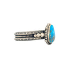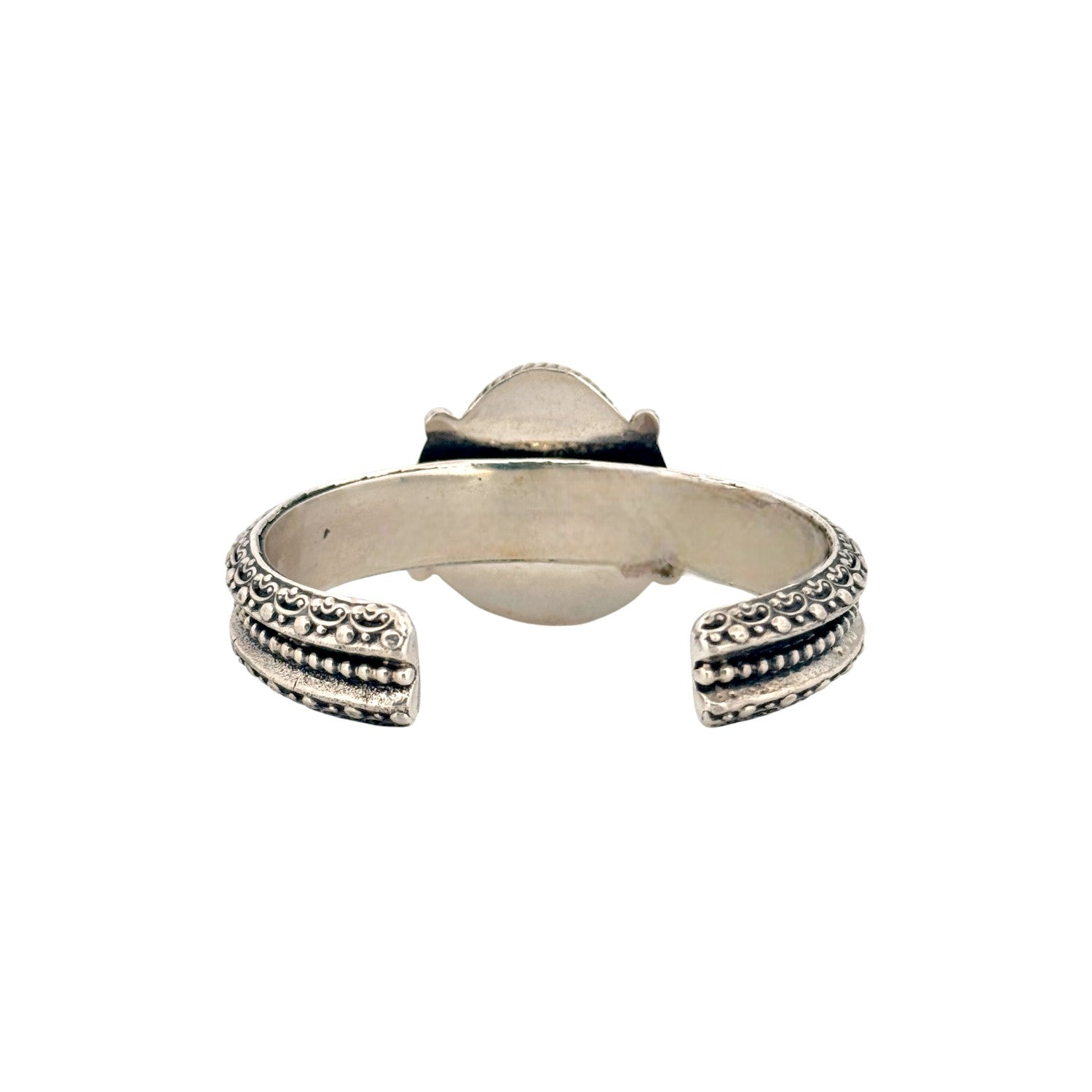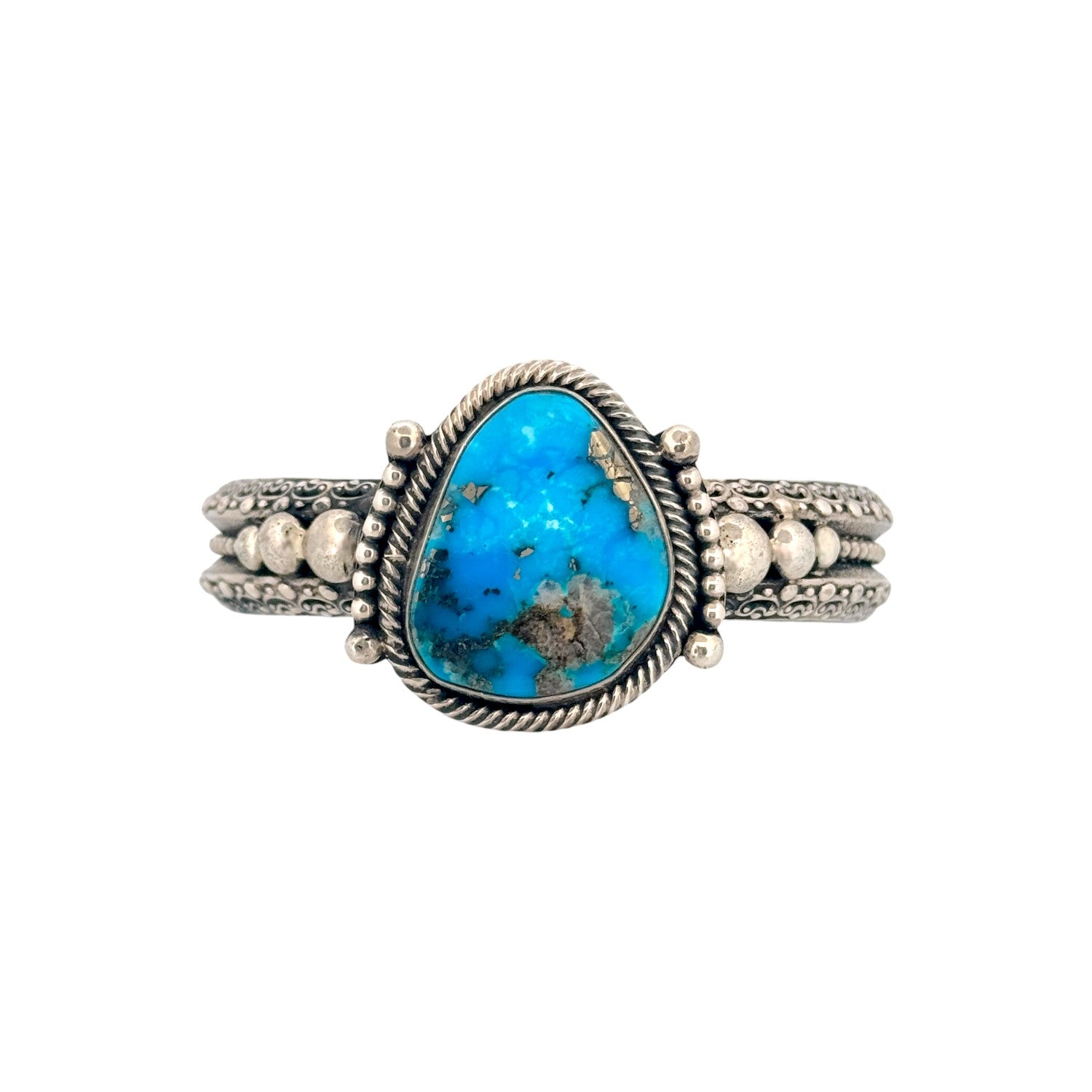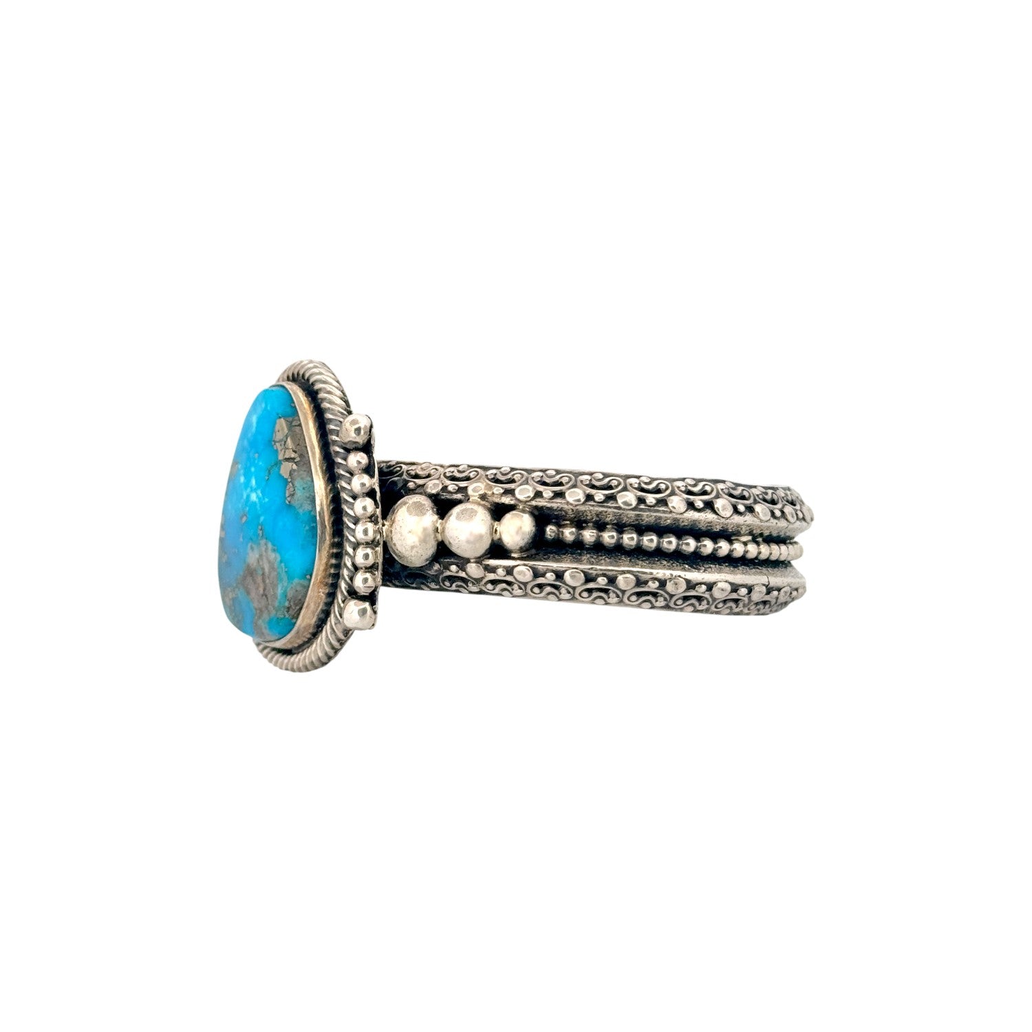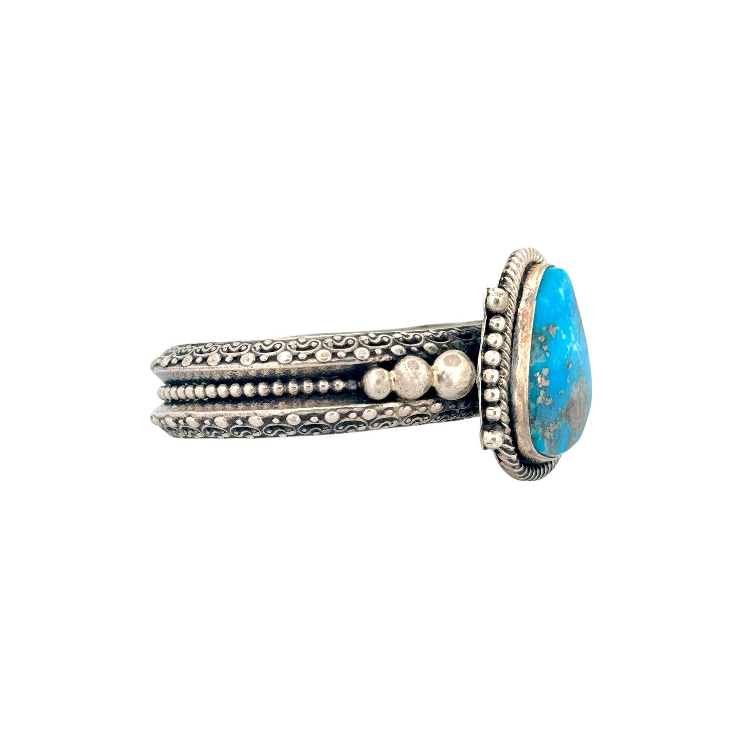 This Navajo handmade bracelet by Hemerson Brown features a beautifully shaped Persian turquoise stone with rich blue color and intricate matrix. The stone is framed by a twisted sterling silver rope bezel and accented with delicate silver beadwork. The multi-band shank showcases detailed stampwork and hand-formed silver drops, creating a bold yet balanced design. Each element is meticulously crafted, reflecting Brown’s strong traditional silversmithing style. Distinctive and vibrant, this bracelet is a striking example of Navajo artistry.
