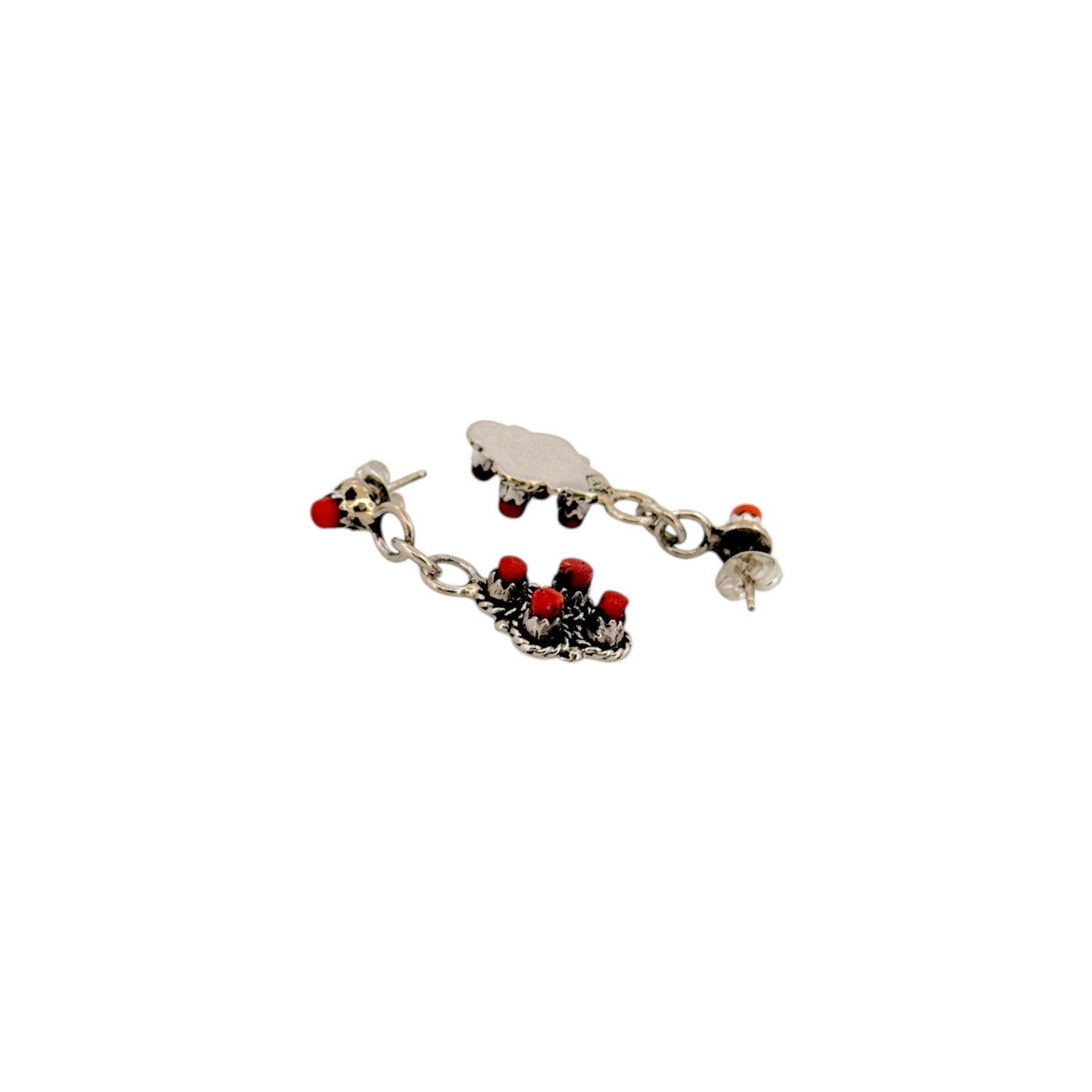 These beautiful Zuni Handmade earrings by Gerard Burns feature vibrant Coral stones set in finely crafted sterling silver. The bright red coral cabochons are arranged in a delicate cluster design that reflects traditional Zuni stonework. Each earring begins with a coral stud top that suspends a sterling silver link, leading to a small coral cluster dangle below. The deep red color of the coral contrasts beautifully with the darkened silver background, highlighting the intricate handcrafted details. These earrings are a charming example of Zuni jewelry artistry, blending classic coral with timeless sterling silver craftsmanship.