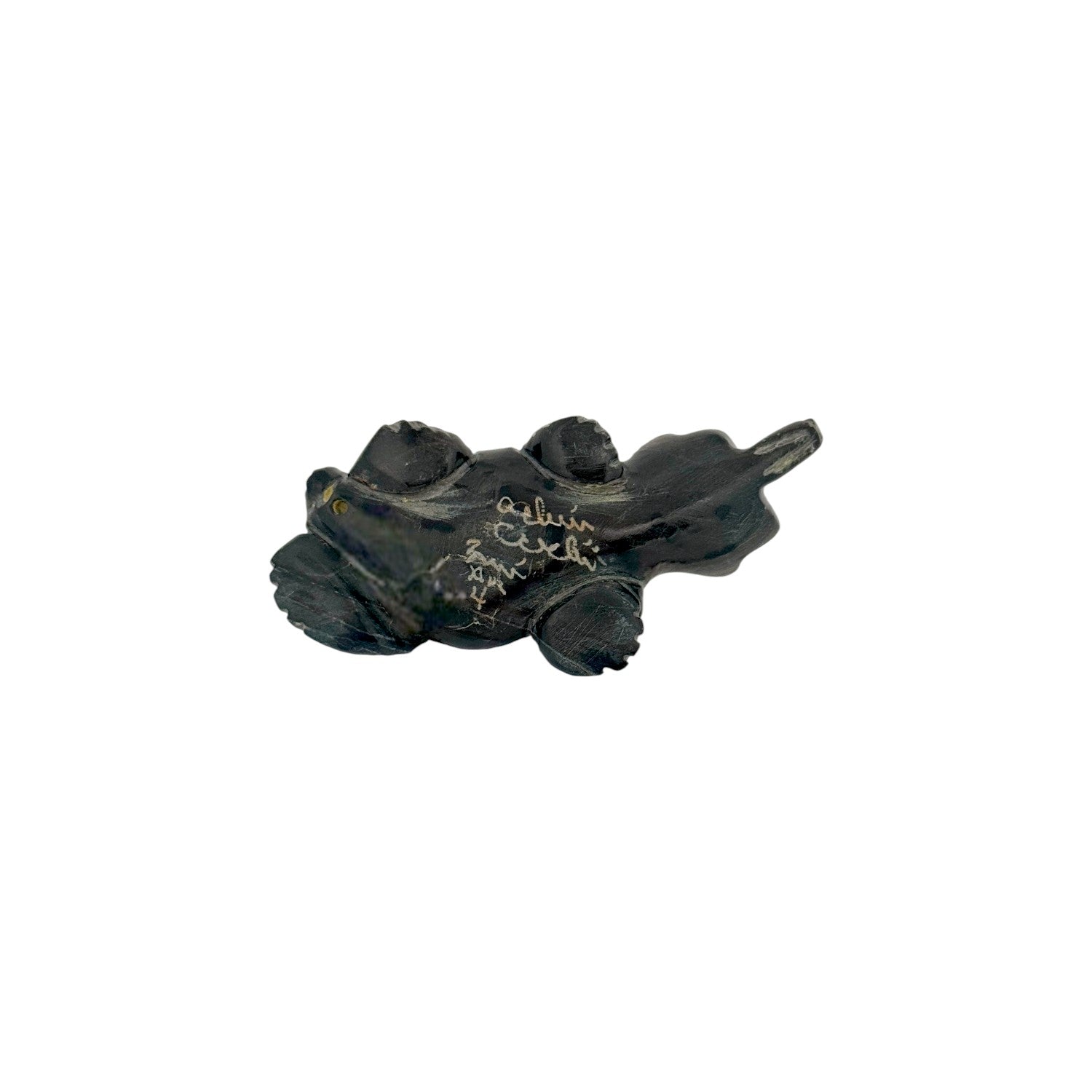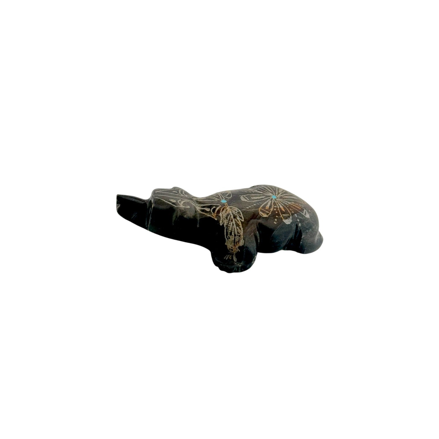 This Zuni hand-carved Bear Fetish by Adrian Cachini is sculpted from deep-toned jasper, its smooth surface providing a rich backdrop for the detailed engraving work. Delicate etched designs adorn the bear’s back, adding visual texture and a distinctive artistic signature to the piece. Inlaid Sleeping Beauty Turquoise eyes offer a vibrant pop of color, beautifully contrasting with the dark stone. The bear’s low, grounded stance conveys strength and quiet confidence, hallmarks of traditional Zuni symbolism. Representing protection, healing, and inner power, this finely crafted carving is a striking example of contemporary Zuni artistry.