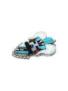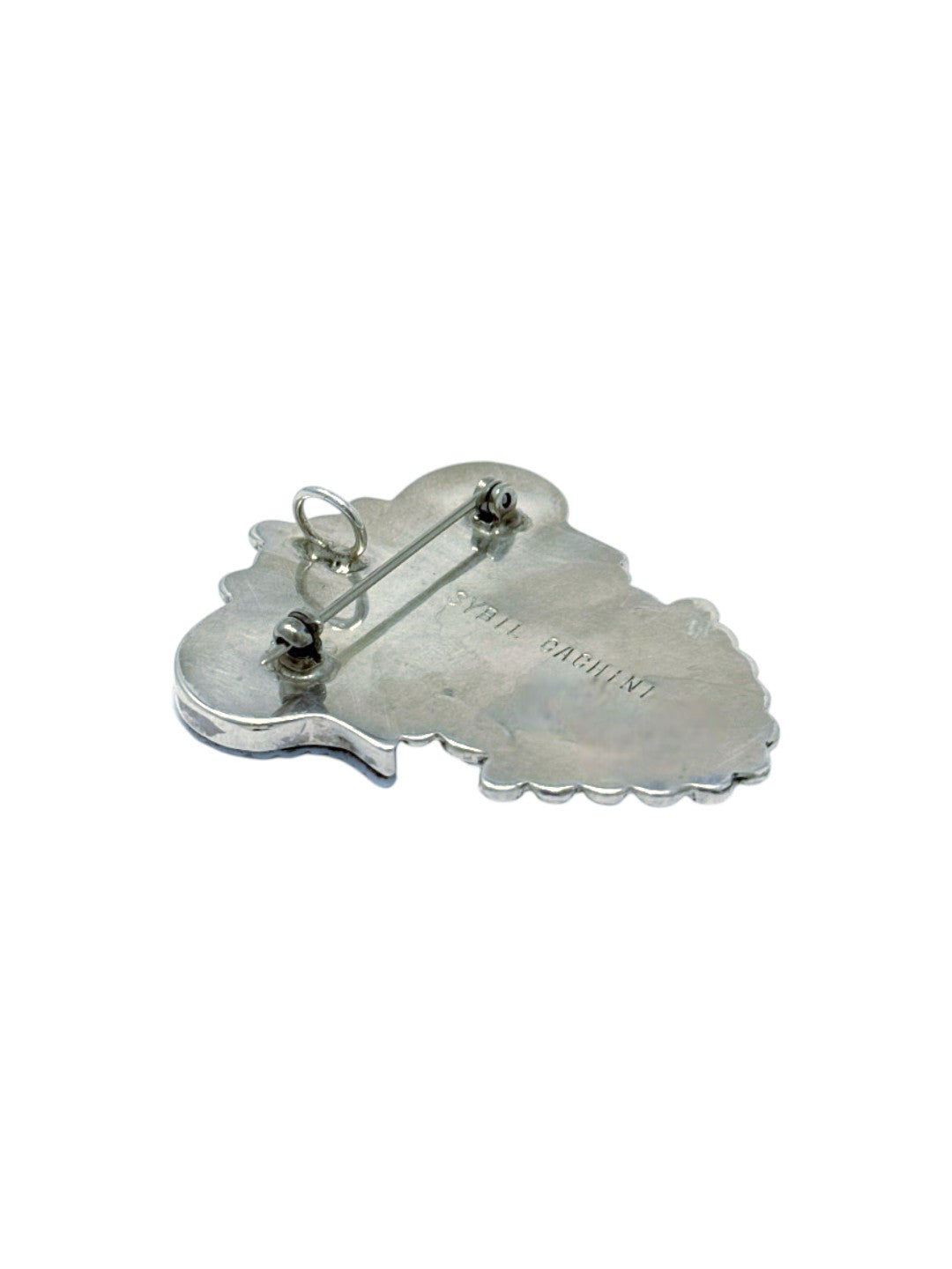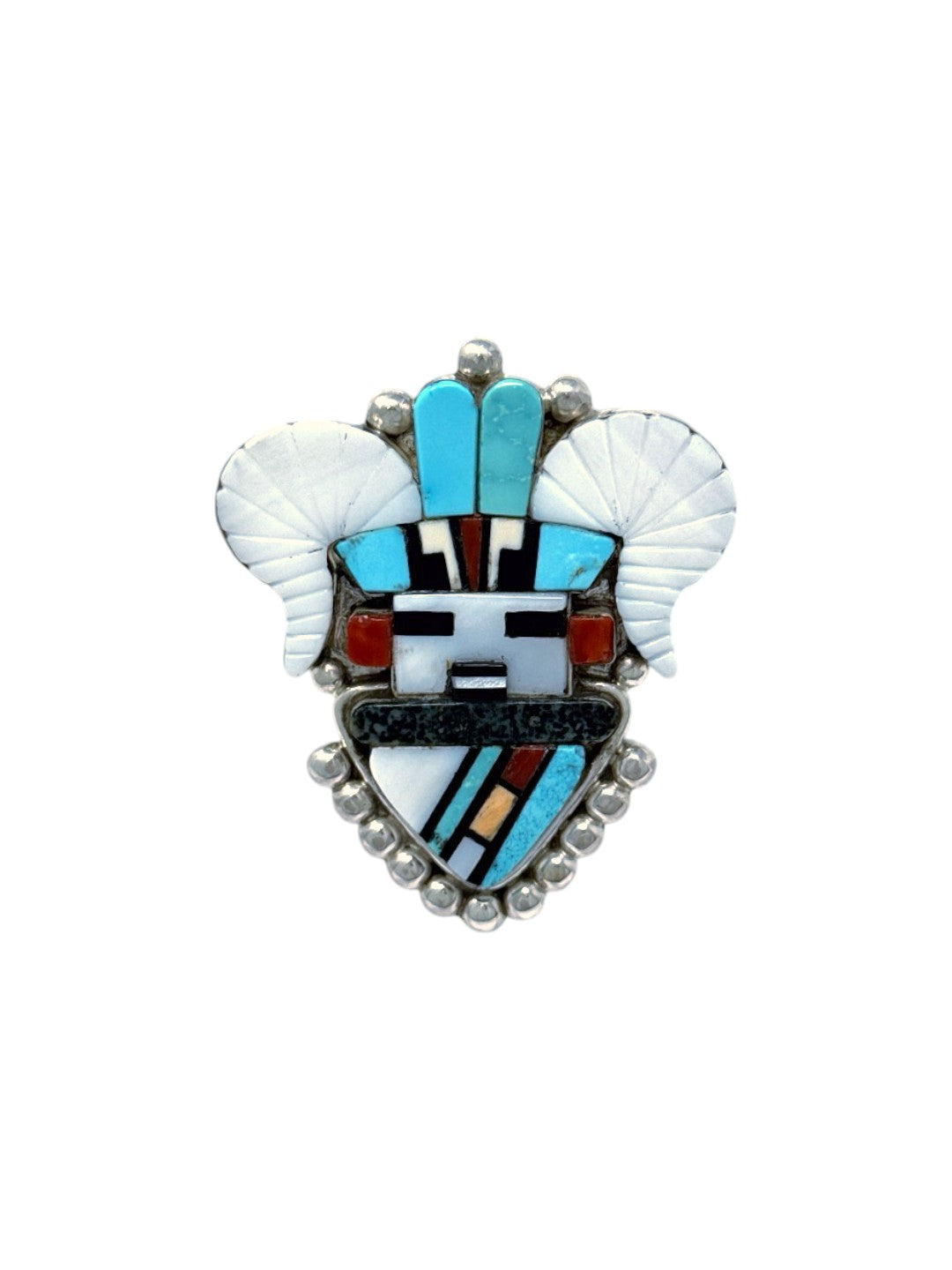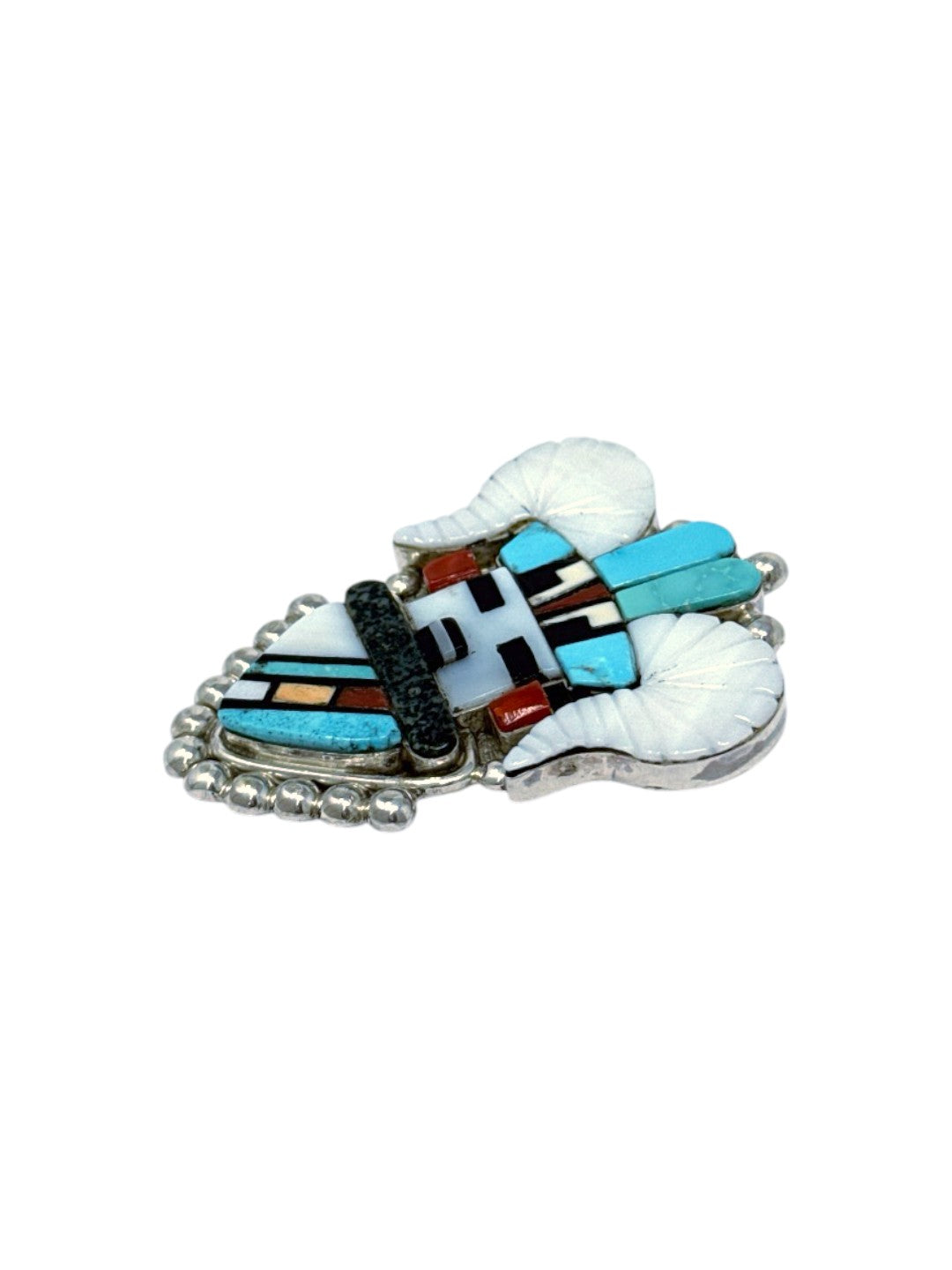 This striking Ram pin and pendant is handcrafted by talented Zuni artist Sybil Cachini, showcasing the timeless beauty of traditional inlay work. Composed of multi-stone materials including turquoise, jet, coral, mother of pearl, and shell, the piece is set in gleaming sterling silver. The design features a stylized ram's head, a powerful symbol of strength, determination, and guardianship in Zuni culture. Intricate hand cut stones form a vibrant mosaic, with delicate silver beading framing the bold composition. This wearable artwork can be styled either as a brooch or pendant, offering versatile elegance and cultural depth. Cachini's craftsmanship reflects generations of Zuni artistry, combining symbolic meaning with aesthetic mastery. A stunning collector’s piece, it honors heritage and spirit with every detail.