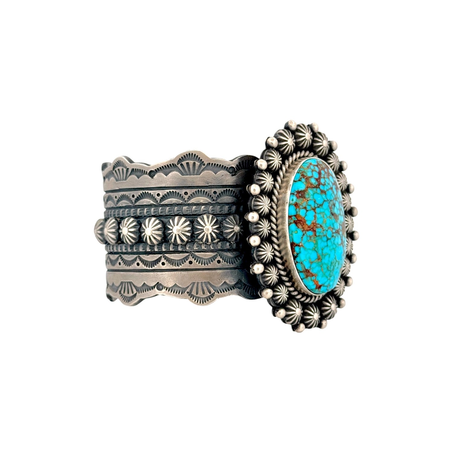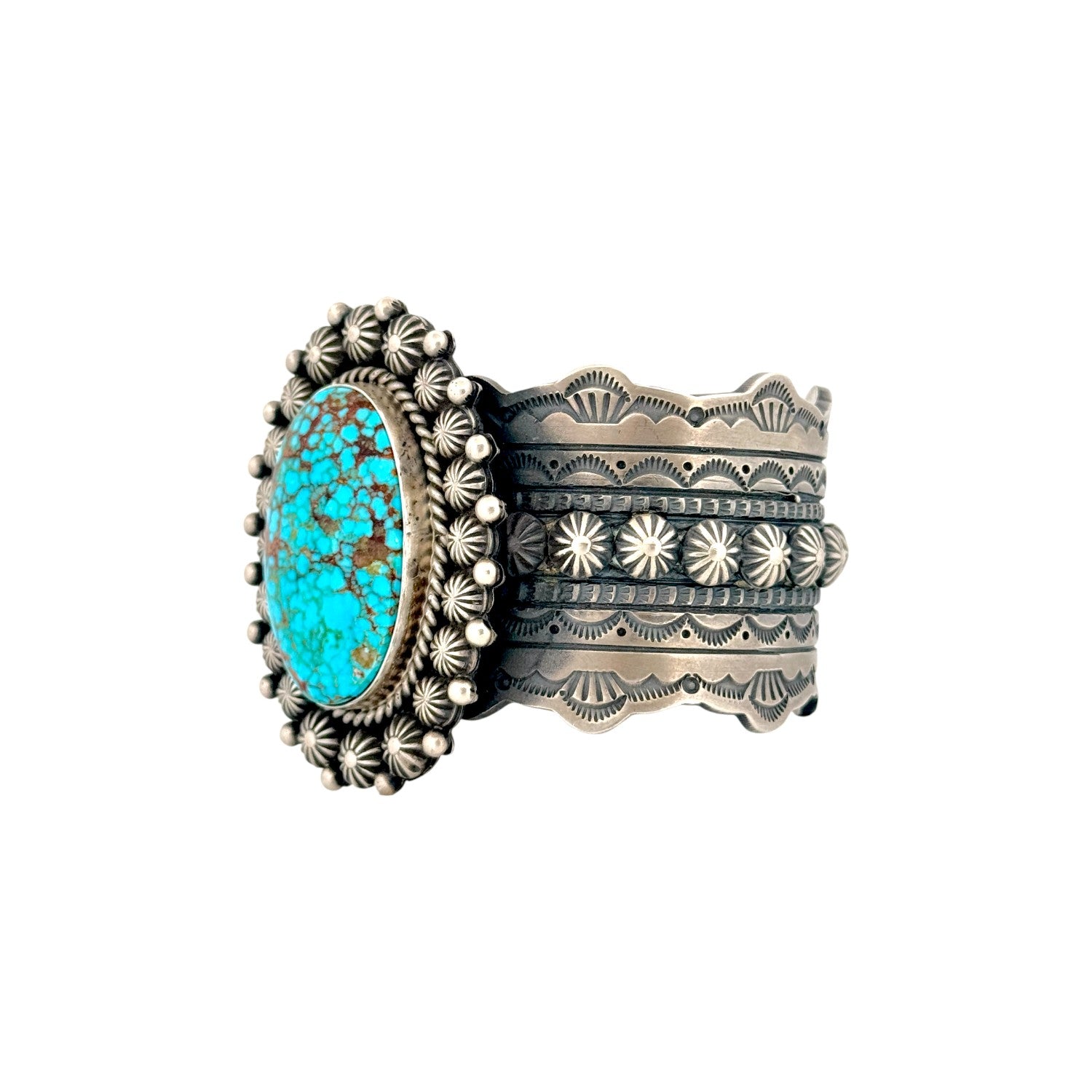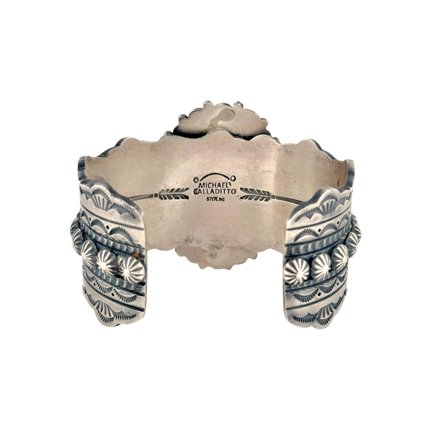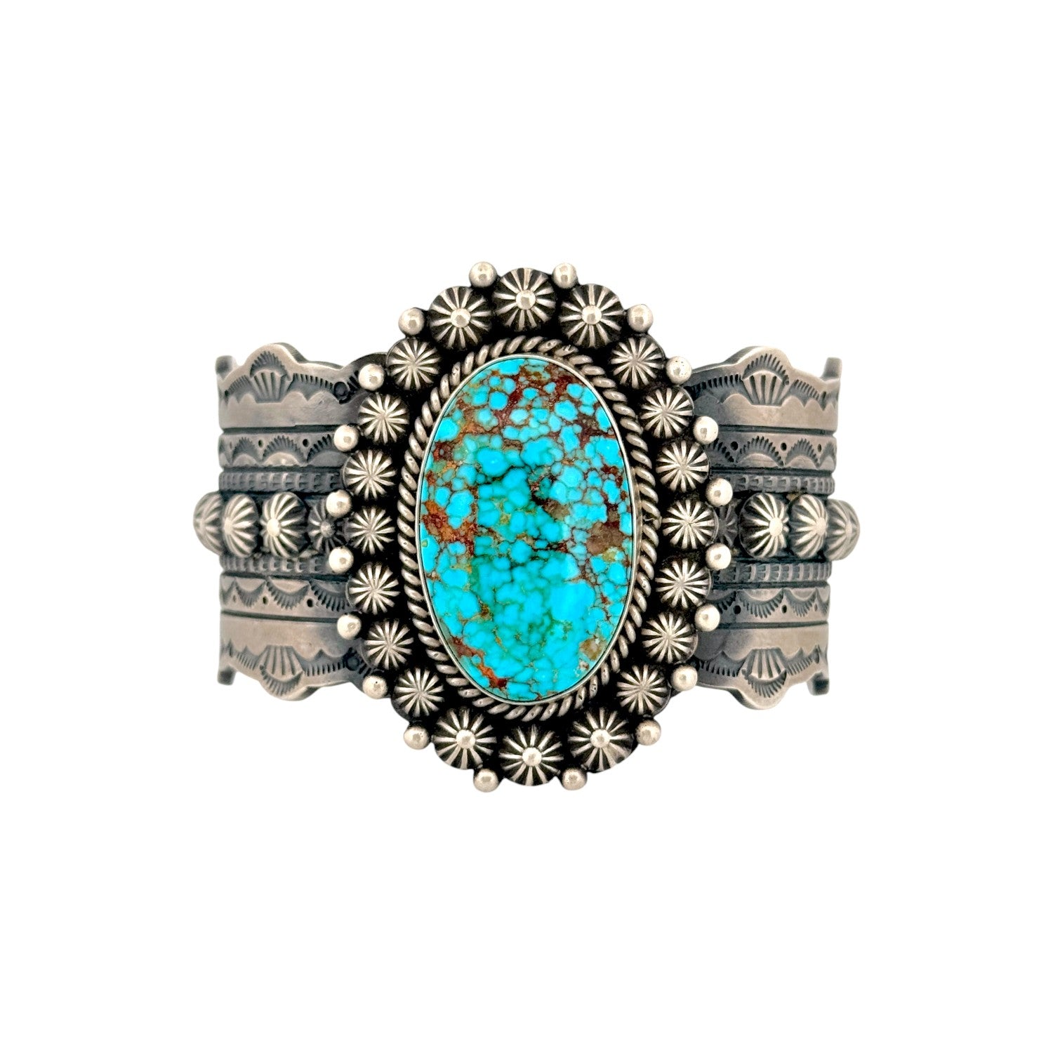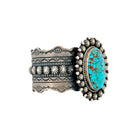 This Michael Calladitto bracelet features a striking Waterweb Kingman turquoise stone, known for its vivid blue color and intricate matrix. The centerpiece is surrounded by finely detailed sterling silver work, including stamped patterns and hand-applied decorative elements. Calladitto’s exceptional Navajo craftsmanship is evident in the balance of bold design and refined silversmithing. The wide cuff style enhances the stone’s presence, giving the piece a strong and elegant profile. This Navajo handmade bracelet is a beautifully executed blend of tradition, artistry, and premium turquoise.