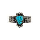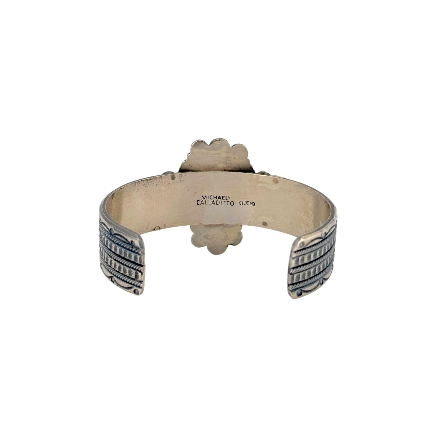 This striking Navajo handmade bracelet by Mike Calladitto features a vibrant Water web Kingman Turquoise stone, known for its vivid blue color and intricate dark matrix. The uniquely shaped cabochon is set in a detailed sterling silver bezel with twisted rope accents that frame the stone beautifully. Surrounding the centerpiece are traditional silver sunburst elements and hand-stamped patterns that add depth and visual interest. The sturdy cuff is adorned with layered silverwork, showcasing the artist’s precision and commitment to classic Navajo design. This bracelet is a bold and timeless piece that highlights the natural beauty of Kingman Turquoise and the enduring artistry of Navajo silversmithing.
