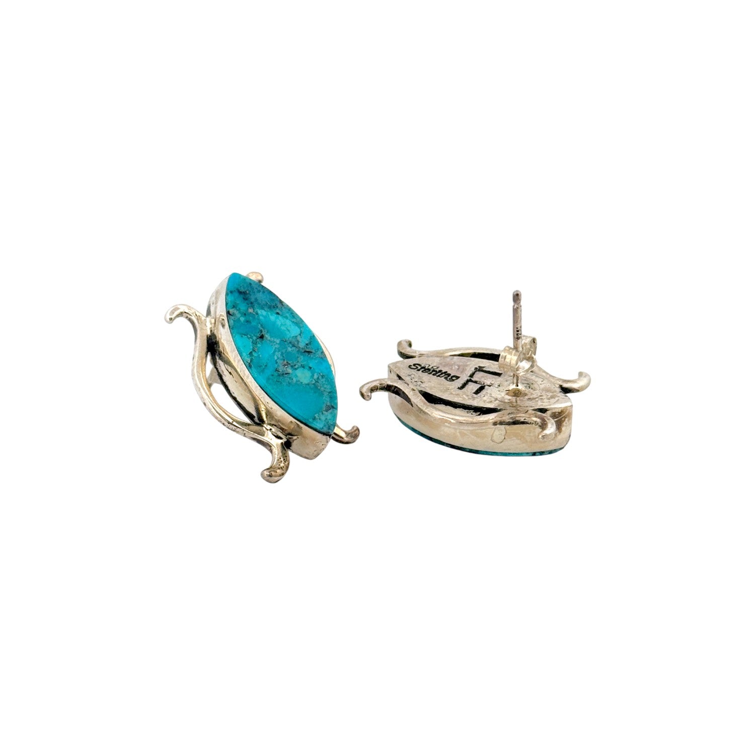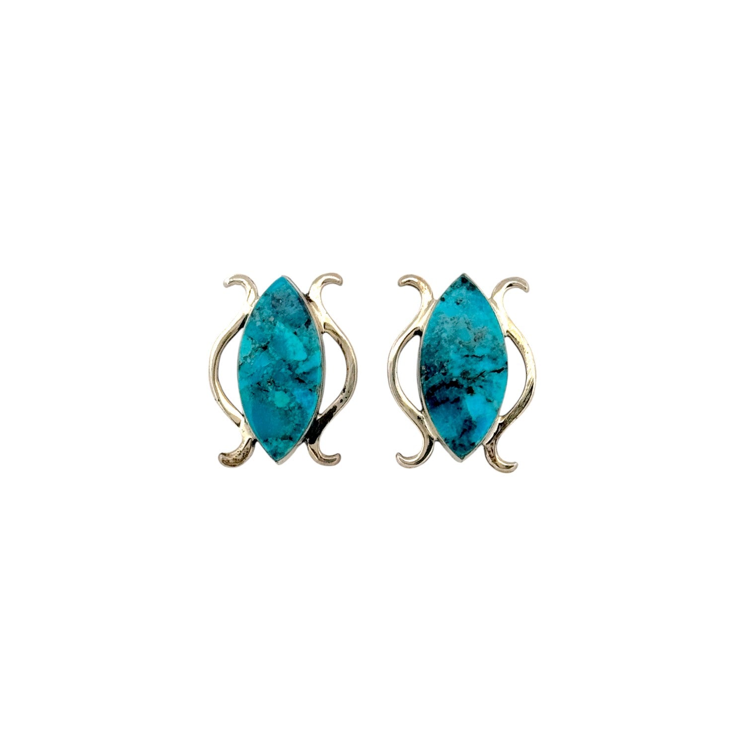 These elegant earrings by Navajo artist Larry Castillo highlight the natural beauty of Kingman Turquoise, prized for its brilliant blue color and intricate black matrix. Each marquise-cut stone is expertly hand-set in sterling silver, framed by gracefully curved silver accents that create a balanced, flowing design. The combination of bold turquoise and sleek silverwork reflects Castillo’s refined craftsmanship and attention to detail. With their modern yet traditional aesthetic, these earrings capture the essence of Navajo artistry; rooted in heritage yet designed for contemporary elegance. Lightweight and comfortable, they are perfect for both daily wear and special occasions.