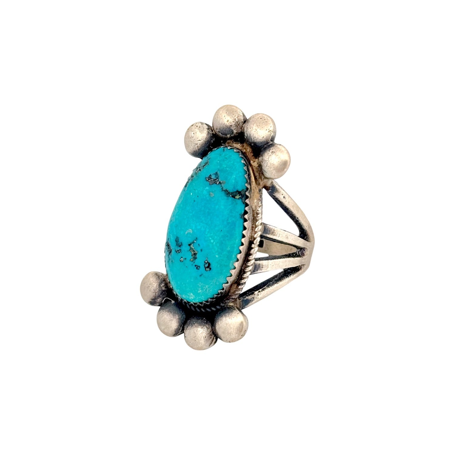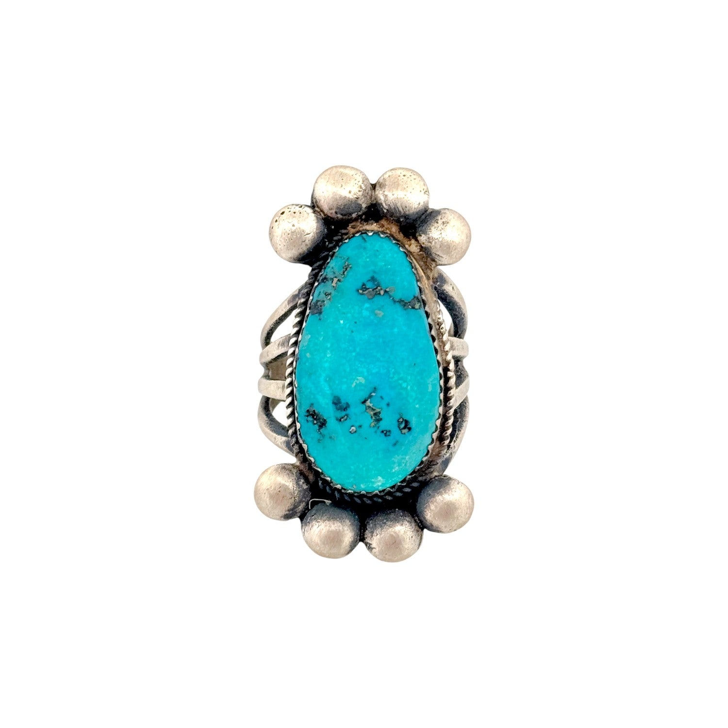 This elegant ring by Navajo artist Mary Cayatineto features a striking Nevada Blue Turquoise stone, celebrated for its brilliant sky-blue hue and natural matrix patterns. The teardrop-shaped turquoise is set in a finely crafted sterling silver bezel, accented by bold silver beads that frame the stone with balance and beauty. Hand-stamped details along the split shank band showcase Cayatineto’s refined silversmithing skill and dedication to traditional Navajo design. The contrast between the polished turquoise and oxidized silver adds depth and character, highlighting the artistry in every detail. This handmade ring carries both cultural meaning and timeless style, reflecting the harmony between nature and craftsmanship.