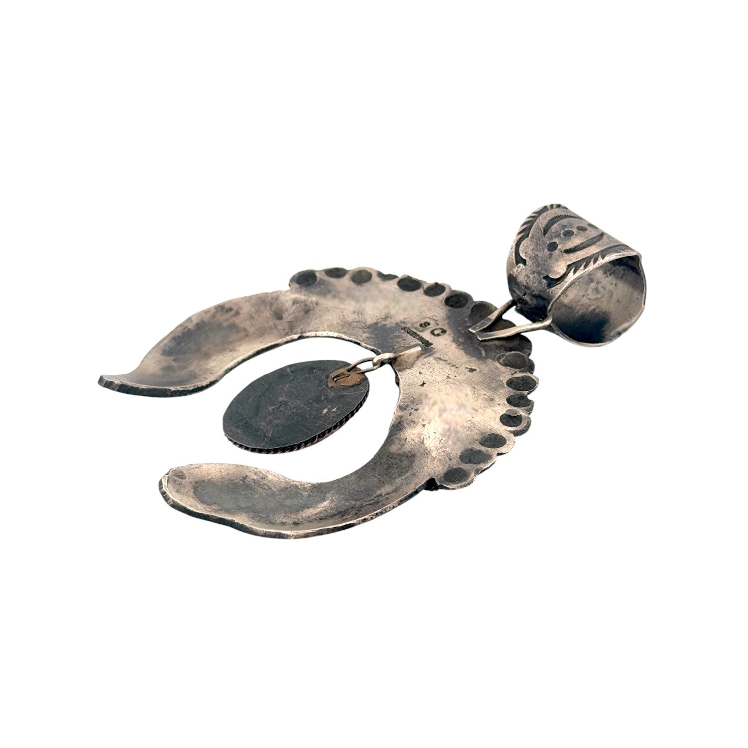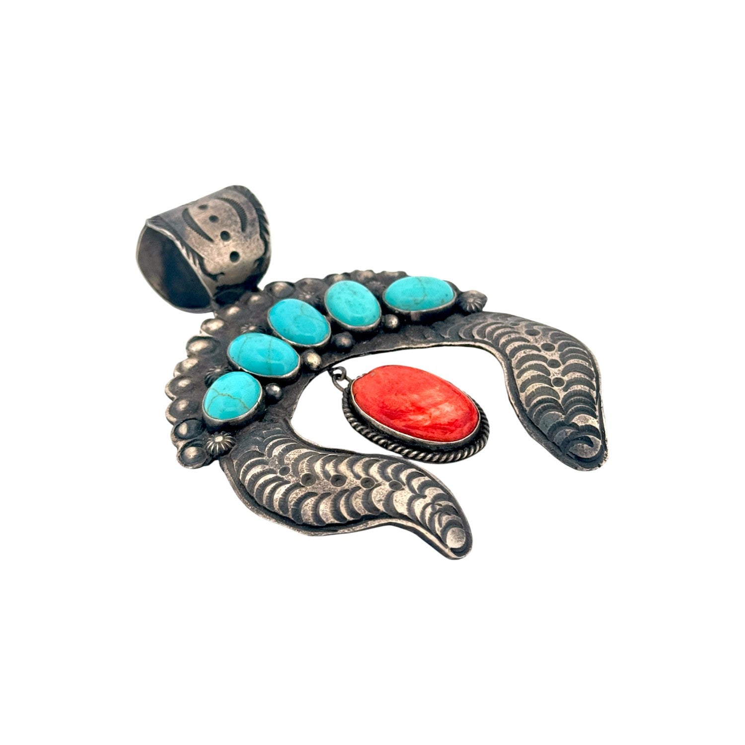 This Navajo handmade pendant by Shawn Cayatineto features bold traditional design crafted in sterling silver. The piece showcases five vibrant Kingman turquoise stones arranged across the top, each framed with careful precision. Below them hangs a striking spiny oyster shell cabochon, adding a rich burst of contrasting color. Deep stampwork, scalloped edges, and dimensional silver accents give the pendant a strong, old-style character. Powerful and eye-catching, this piece highlights Cayatineto’s mastery of Navajo silversmithing.