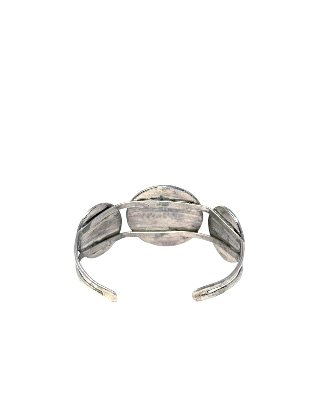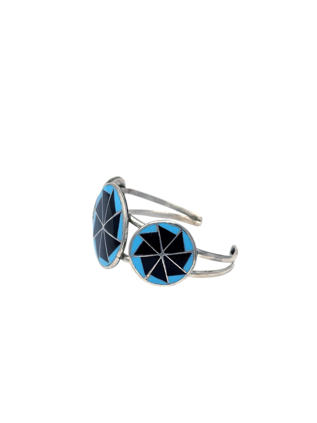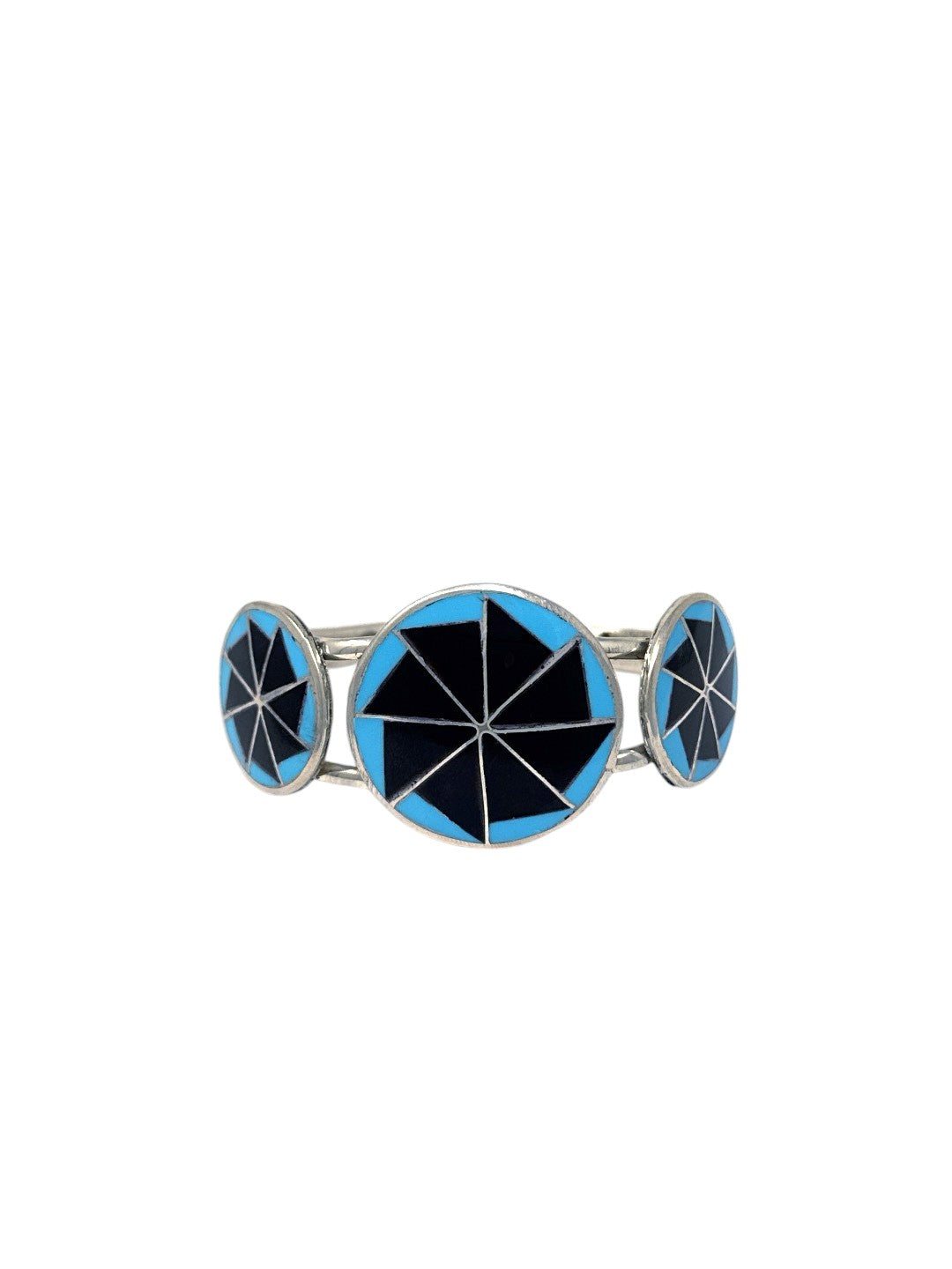 This striking bracelet by Dena Chavez, a talented Zuni artist, features a bold and modern take on traditional inlay work. Handcrafted from sterling silver, the piece showcases twin circular inlays of Sleeping Beauty Turquoise and jet, arranged in a sharp geometric starburst pattern. The vivid blue of the turquoise contrasts beautifully with the deep black jet, creating a visually captivating design full of movement and balance. Set on a lightweight split-band cuff, the bracelet is both comfortable and impactful. Chavez’s precision and eye for symmetry reflect her deep connection to Zuni artistry and craftsmanship.