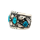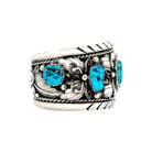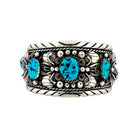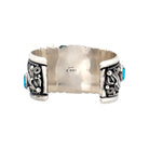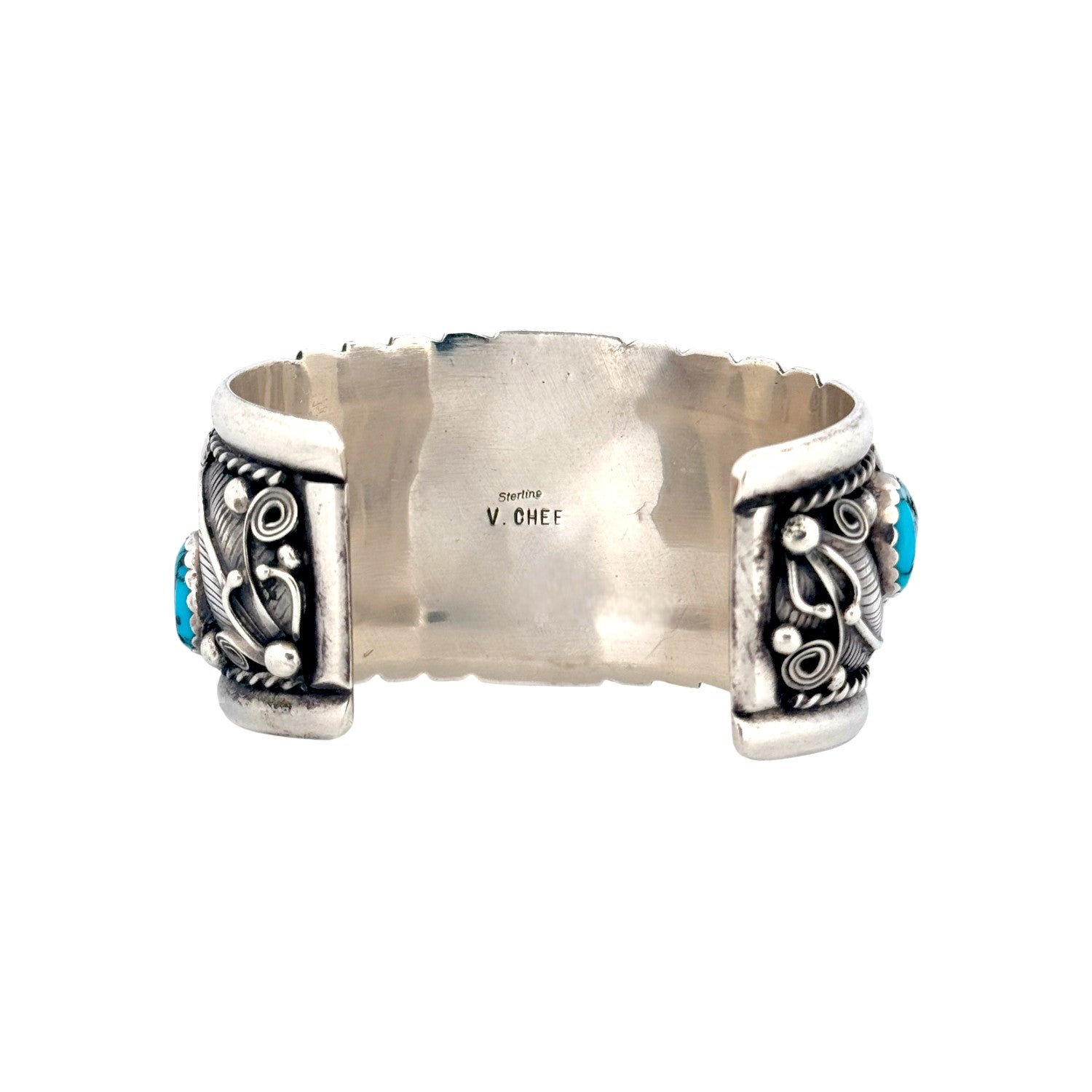 This bold and beautifully detailed bracelet by Navajo silversmith Victor Chee features vibrant Lone Mountain turquoise stones set in rich sterling silver. Each turquoise cabochon displays striking blue tones with intricate black matrix, framed by finely scalloped bezels. Surrounding the stones are elaborate silverwork designs; hand-formed leaves, scrolls, and raindrop beads, arranged with perfect symmetry and depth. The heavy gauge silver construction gives the bracelet a substantial feel, while the intricate detailing highlights Chee’s mastery of traditional Navajo artistry. Twisted wire borders and stamped edges add layers of texture and refinement.