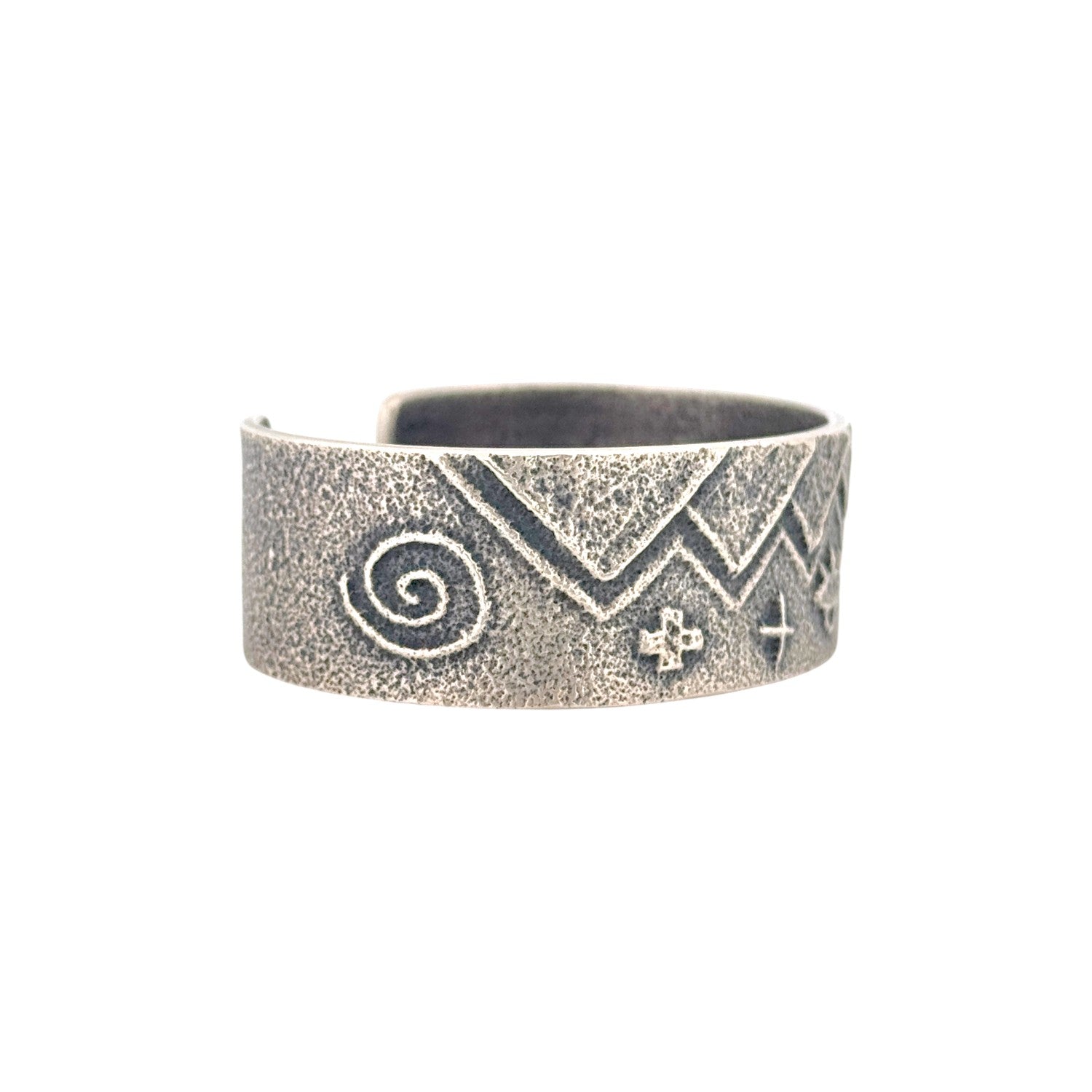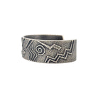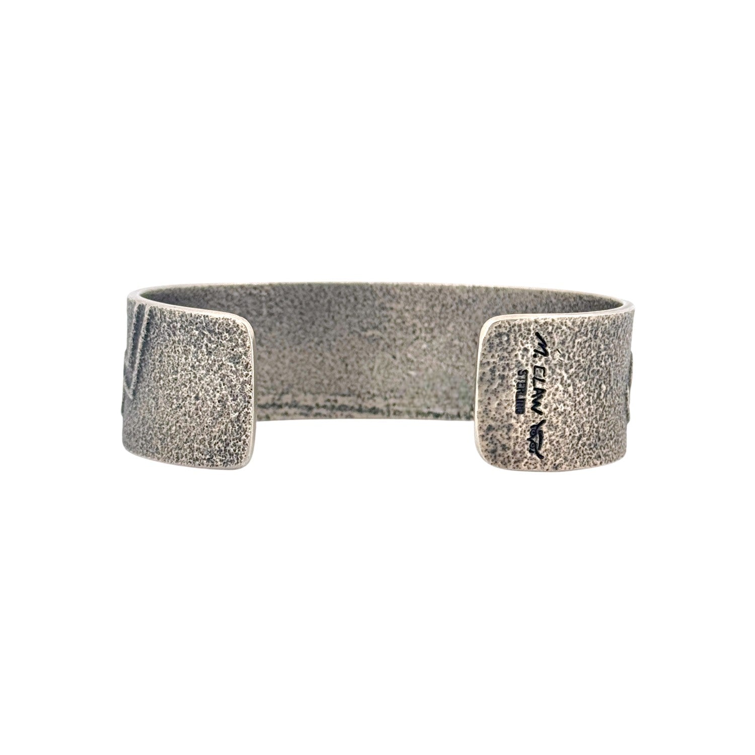 This handcrafted sterling silver bracelet by Navajo artist Monty Claw is a powerful blend of symbolism and artistry. The cuff features intricate hand-etched designs inspired by traditional Navajo imagery—mountains, water, the sun, and sacred life symbols—all carved into a textured silver surface. Each element carries cultural meaning, representing harmony, balance, and connection to nature. Claw’s masterful craftsmanship is evident in the depth and precision of his engraving, enhanced by a subtle oxidized finish that adds contrast and dimension. The bracelet’s matte patina gives it an ancient, timeless quality, while its sturdy form ensures both comfort and durability.