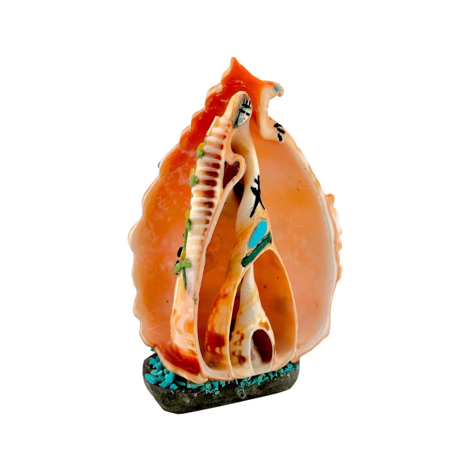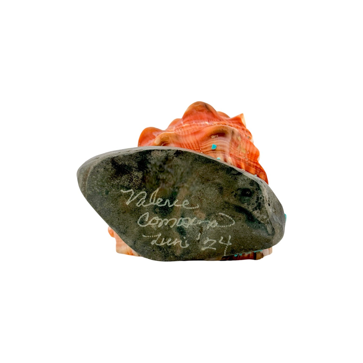 This Zuni hand-carved Corn Maiden Fetish by Valerie Comosona is beautifully created from a natural cowrie shell, honoring the life-giving spirit of corn and feminine strength in Zuni tradition. The warm, glowing tones of the shell provide a graceful backdrop for intricate inlay work that brings the figure to life. Sleeping Beauty Turquoise, jet, variscite, yellow shell, abalone shell, malachite, and garnet accents add vibrant color and symbolic depth throughout the design. The detailed maiden form emerging within the shell reflects themes of growth, abundance, and harmony with nature. Expertly crafted and richly adorned, this piece is a striking example of authentic Zuni artistry and meaningful cultural expression.