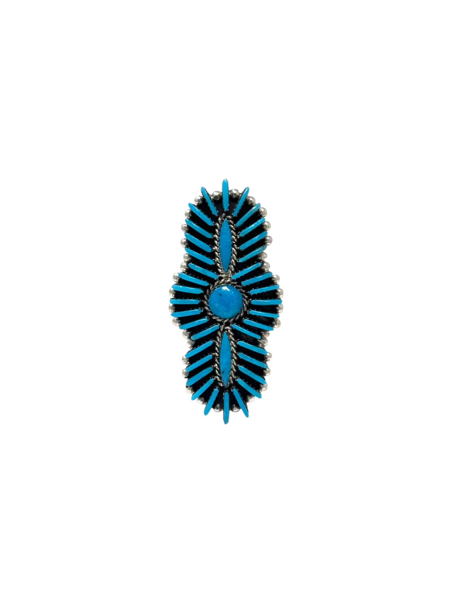 Meticulously handcrafted by Zuni artist Edmund Cooeyate, this stunning ring showcases the intricate art of needle point work with vibrant Nevada Blue Turquoise. Each silver cut stone is precisely hand set in fine sawtooth bezels, forming a radiant vertical motif that captures the eye with its symmetry and brilliance. At the center, a single round cabochon anchors the design, surrounded by rows of needlepoint turquoise arranged like sun rays in sterling silver. The bold silhouette and expert stonework are hallmarks of traditional Zuni craftsmanship, passed down through generations.