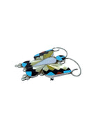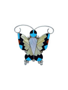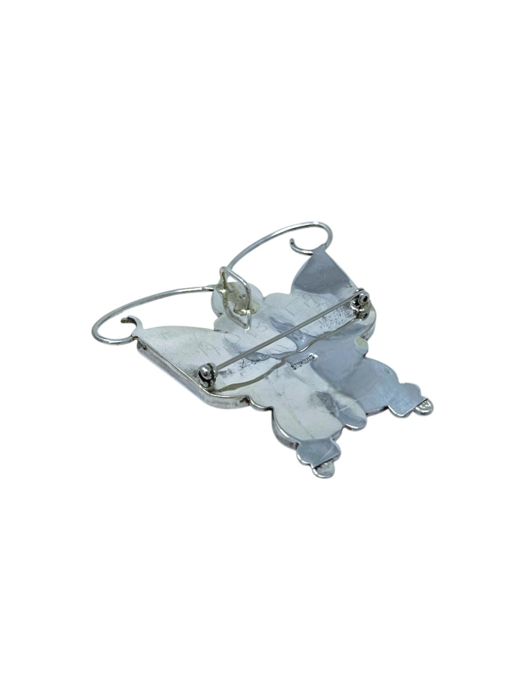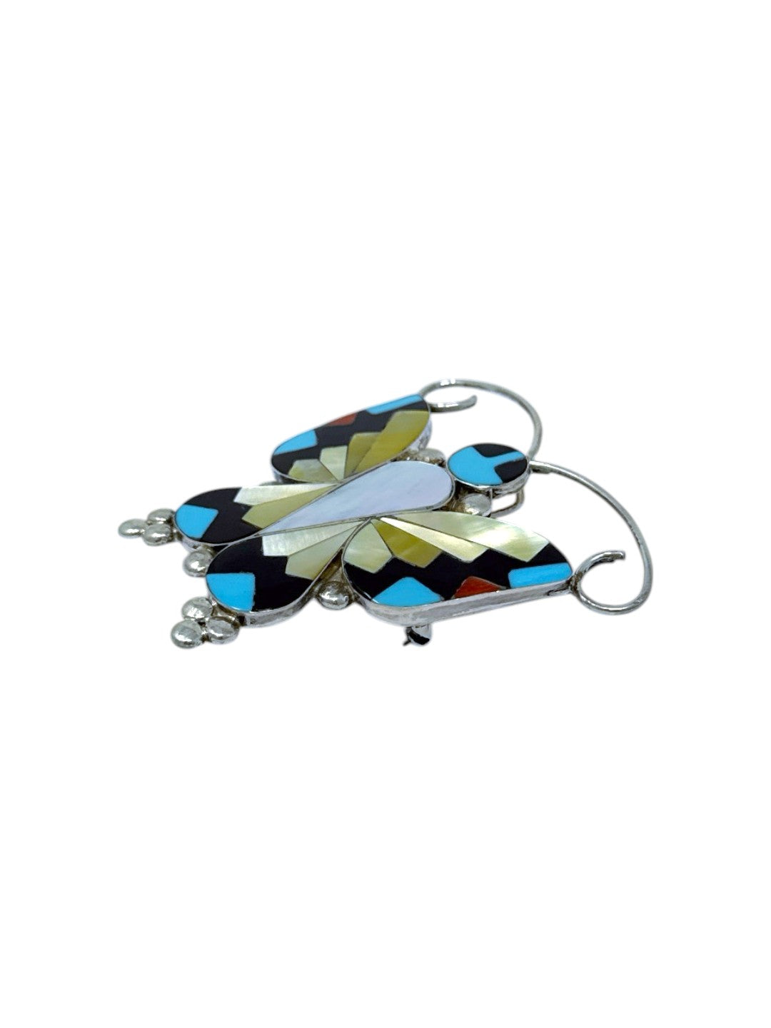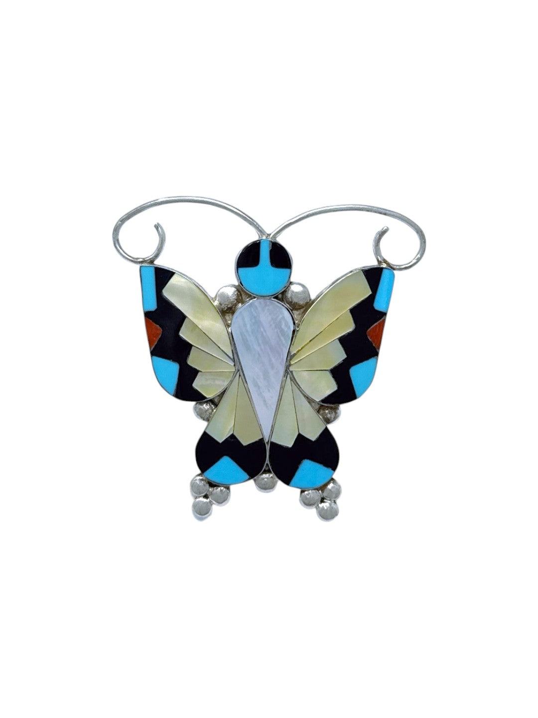 This exquisite pin and pendant by Allison Dishta showcase the whimsical beauty of a butterfly in classic Zuni handmade style. Crafted in sterling silver, the piece is expertly inlaid with a stunning array of multi-stone materials, including turquoise, jet, mother of pearl, coral, and shell. The vibrant color palette and precise symmetry bring the butterfly to life, symbolizing transformation, renewal, and grace. Each wing features a unique geometric pattern, blending soft ivory tones with bold accents of black and blue. Delicate silverwork outlines the wings, and curled antennae add a graceful finishing touch.