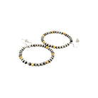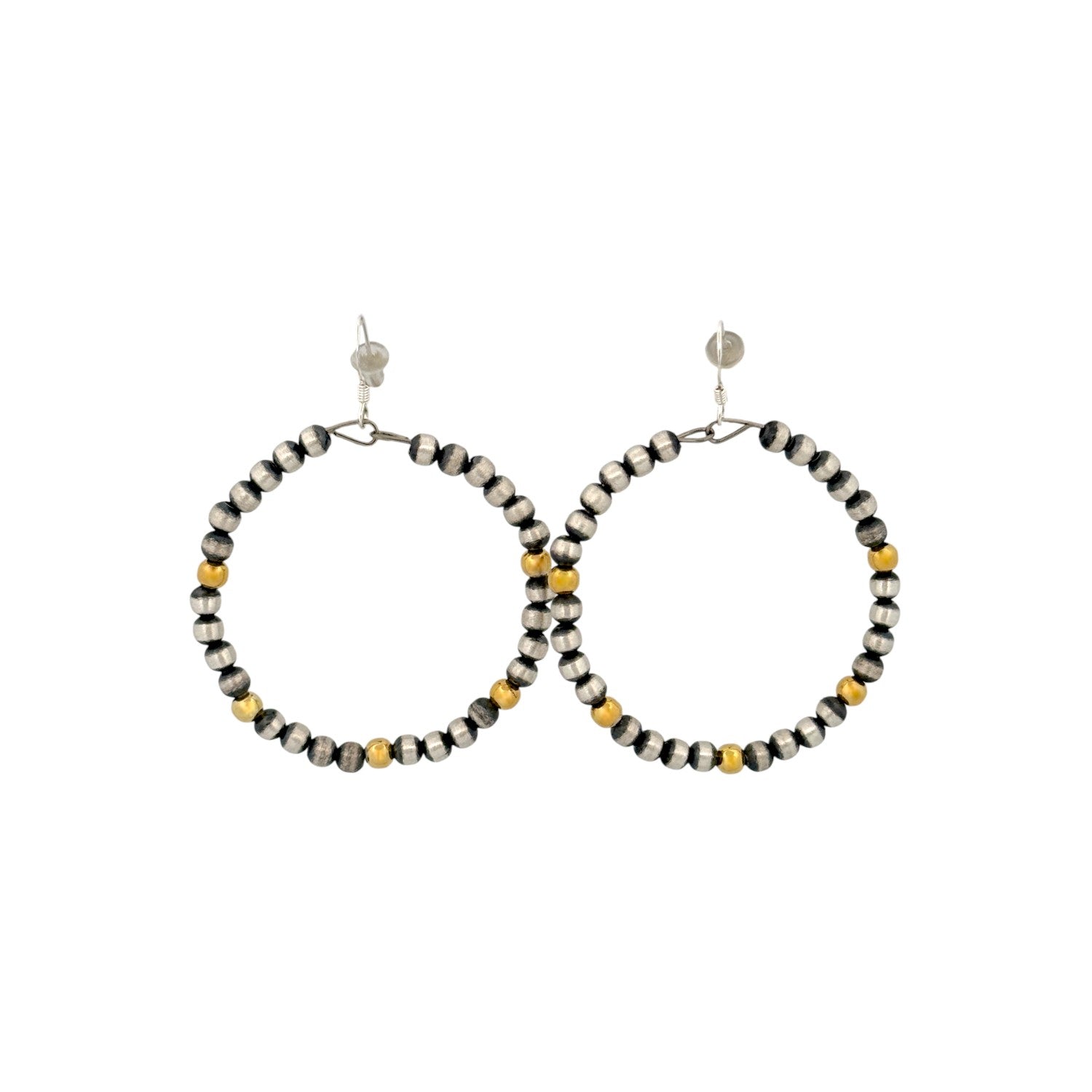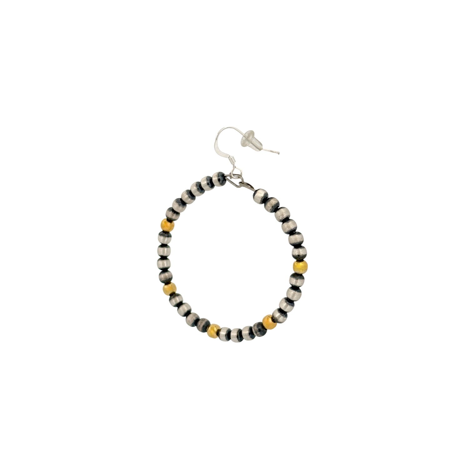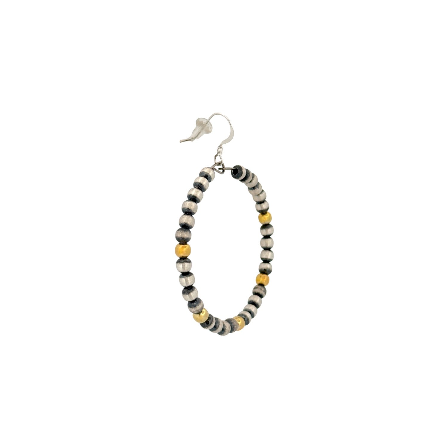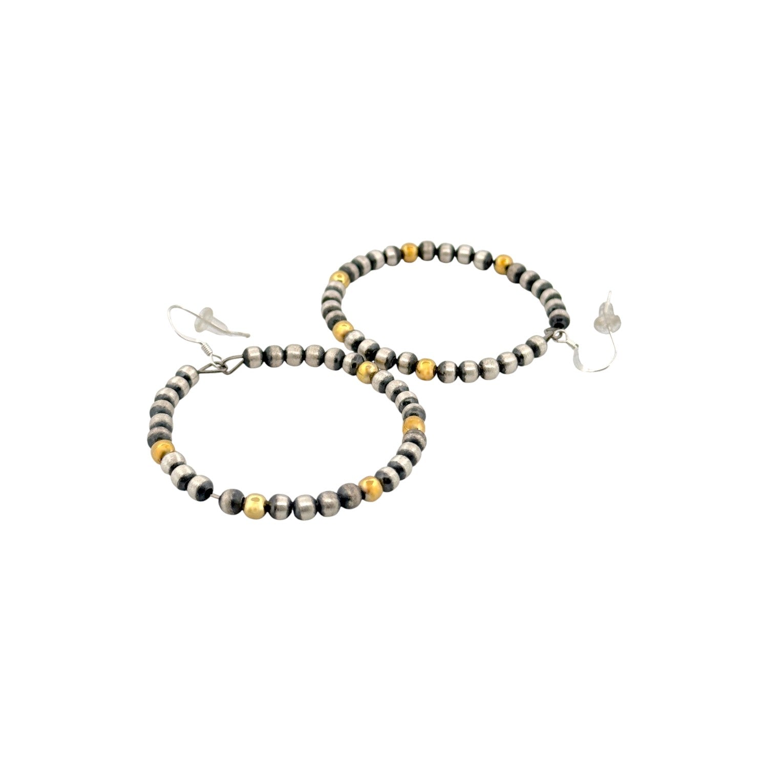 These elegant hoop earrings blend machine-made silver pearls with warm 14k gold-plated beads, creating a refined balance of brilliance and contrast. Each piece is hand-strung by a skilled local Native artisan, preserving the tradition of meticulous craftsmanship. The oxidized sterling silver beads offer depth and texture, enhancing the subtle shimmer of the gold accents. Lightweight yet remarkably striking, these earrings bring a timeless Southwestern sophistication to any ensemble. Designed for everyday wear or elevated occasions, they embody both modern style and cultural artistry.