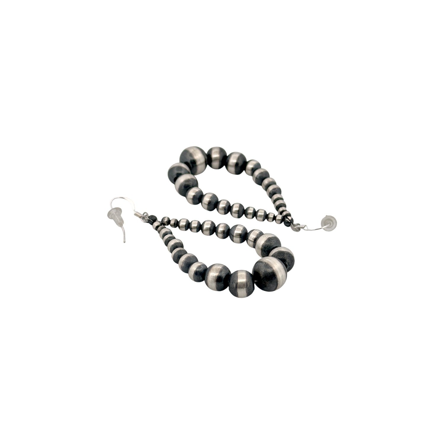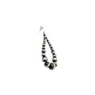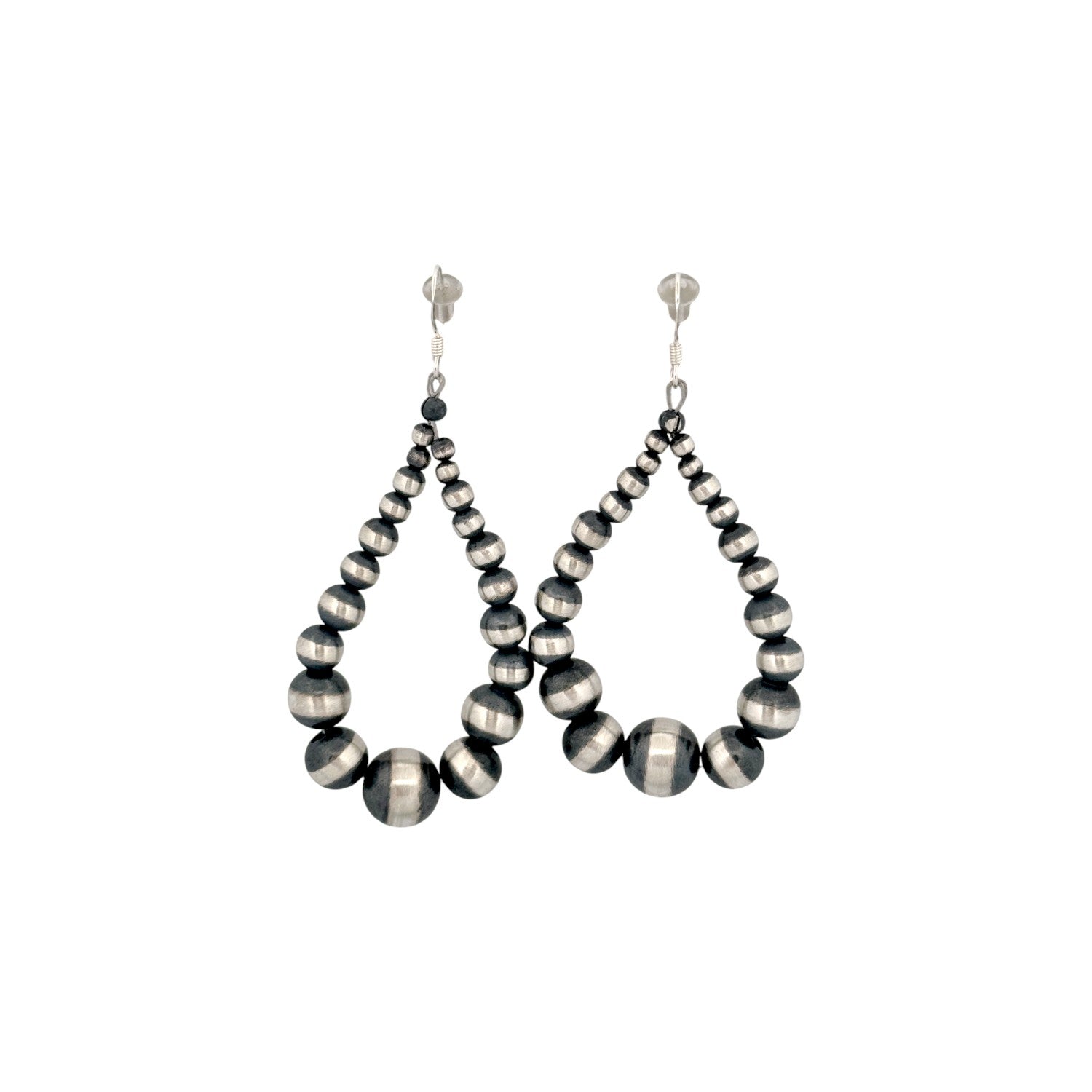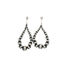 These bold teardrop earrings feature a beautifully graduated line of machine-made silver pearls, creating a striking silhouette with timeless appeal. Hand-strung by a local Native artisan, each pair reflects exceptional craftsmanship rooted in cultural tradition. The oxidized sterling silver beads enhance depth and contrast, allowing the natural sheen of the pearls to stand out elegantly. Lightweight yet visually impactful, they bring a refined Southwestern touch to any look. Perfect for everyday wear or special occasions, these earrings embody authentic artistry with modern sophistication.