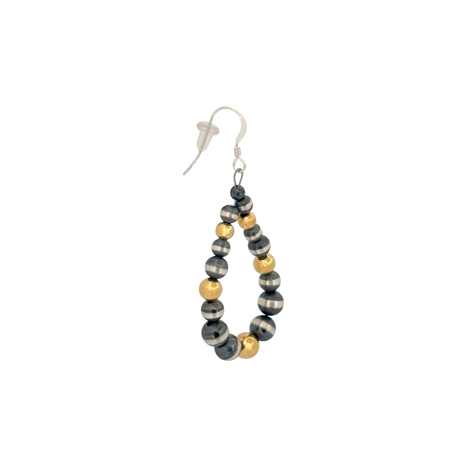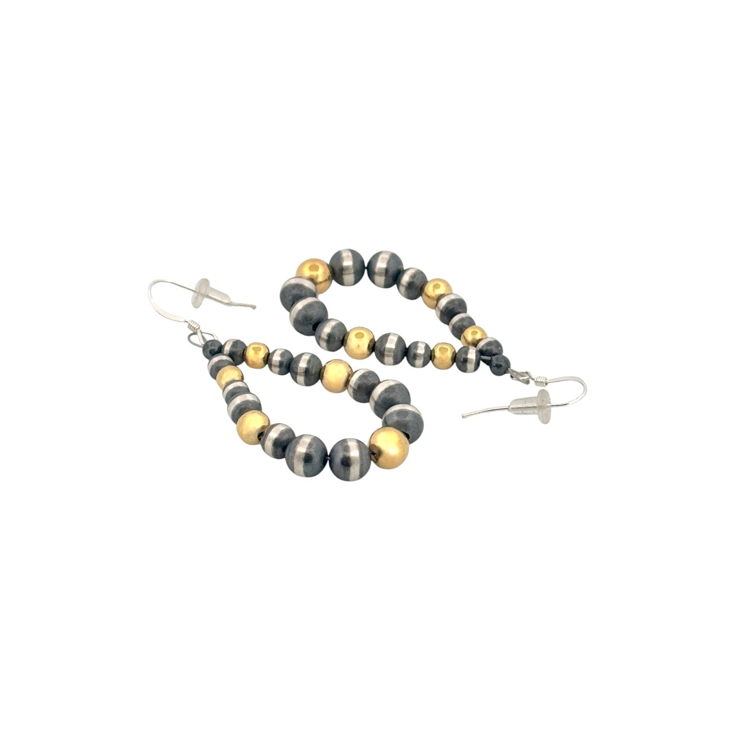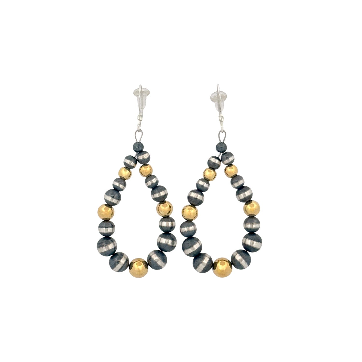 These elegant earrings feature machine-made silver pearl beads paired with radiant gold-plated accents for a beautifully balanced, two-tone design. Hand-strung by a skilled local Native artisan, each pair reflects artistry, intention, and cultural craftsmanship. The teardrop shape adds a graceful silhouette that complements both casual and formal styles. Sterling silver findings ensure durability, comfort, and a high-quality finish. Perfect for everyday wear or special occasions, these earrings bring a refined blend of shine, tradition, and modern Southwestern style.