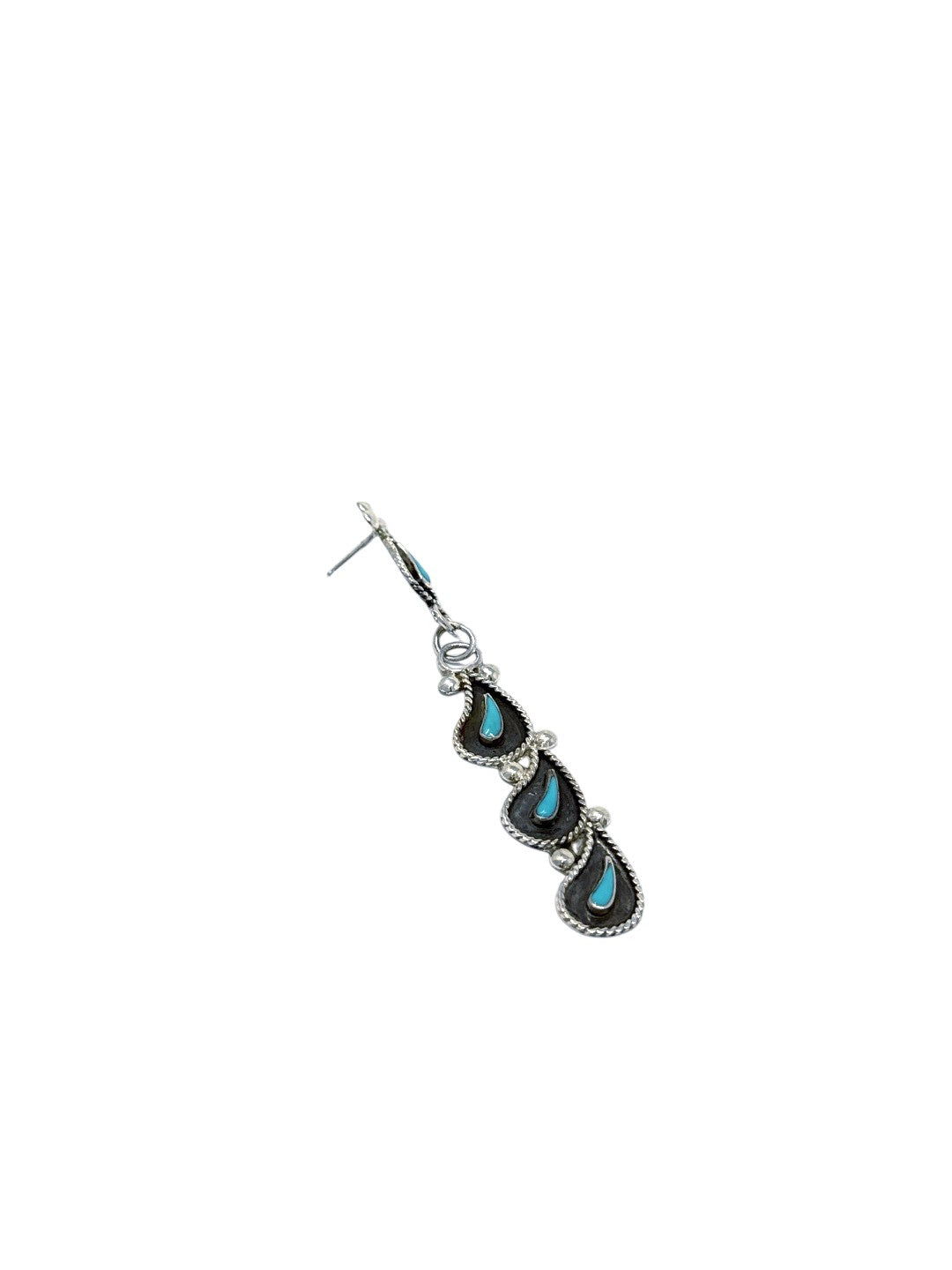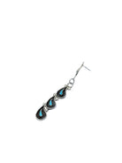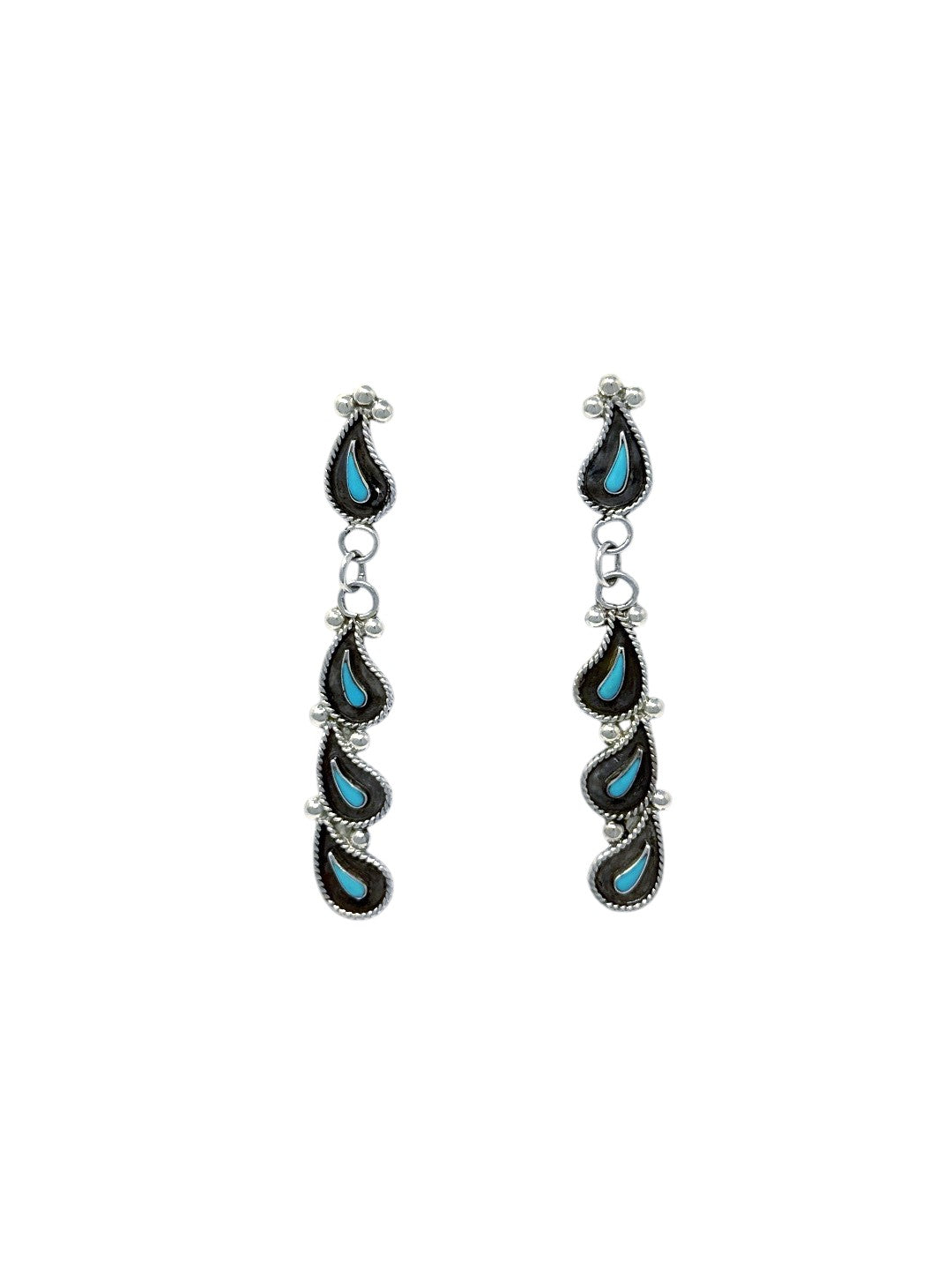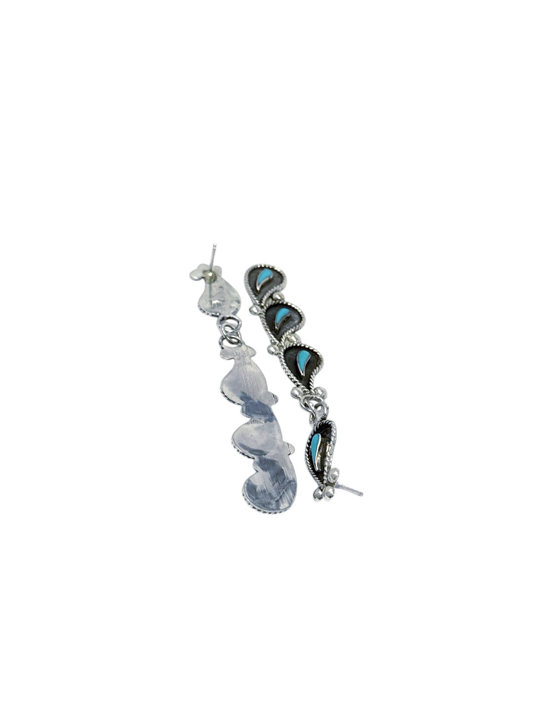 These graceful earrings by Janice Edaakie, a masterful Zuni artisan, highlights the fluid beauty of Nevada Blue Turquoise in a cascading teardrop design. Each stone is precisely inlaid into oxidized sterling silver, framed by delicate twisted wire and accented with fine silver beadwork. The deep, sky-toned turquoise contrasts elegantly against the darkened silver background, emphasizing the teardrop motif, a symbol of renewal and sacred water in many Native traditions. Light yet expressive, the earrings sway gently with movement, offering a timeless elegance that pairs effortlessly with both traditional and contemporary styles. Janice Edaakie’s expert craftsmanship preserves Zuni heritage while delivering refined sophistication. A meaningful and collectible piece for the discerning jewelry enthusiast.