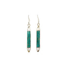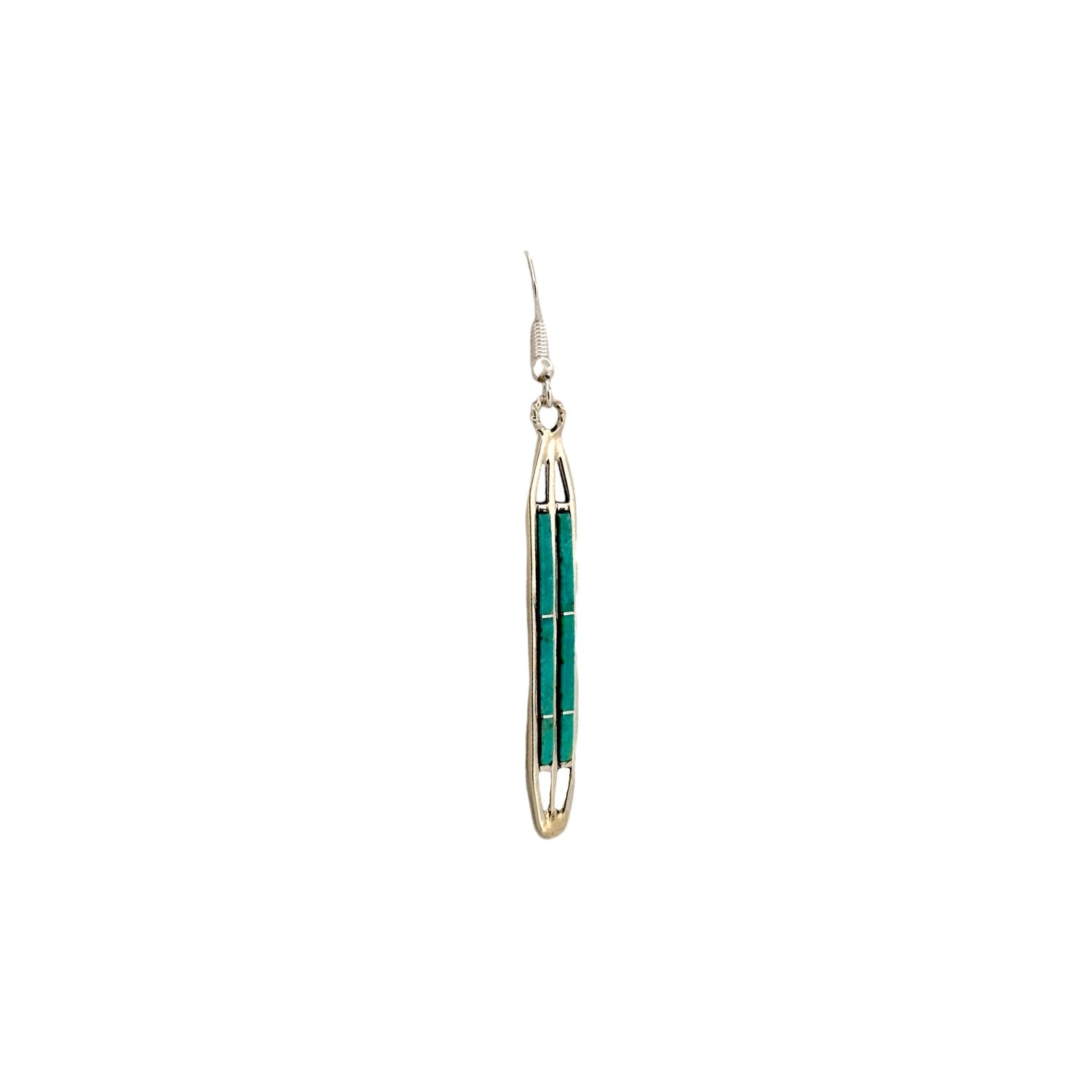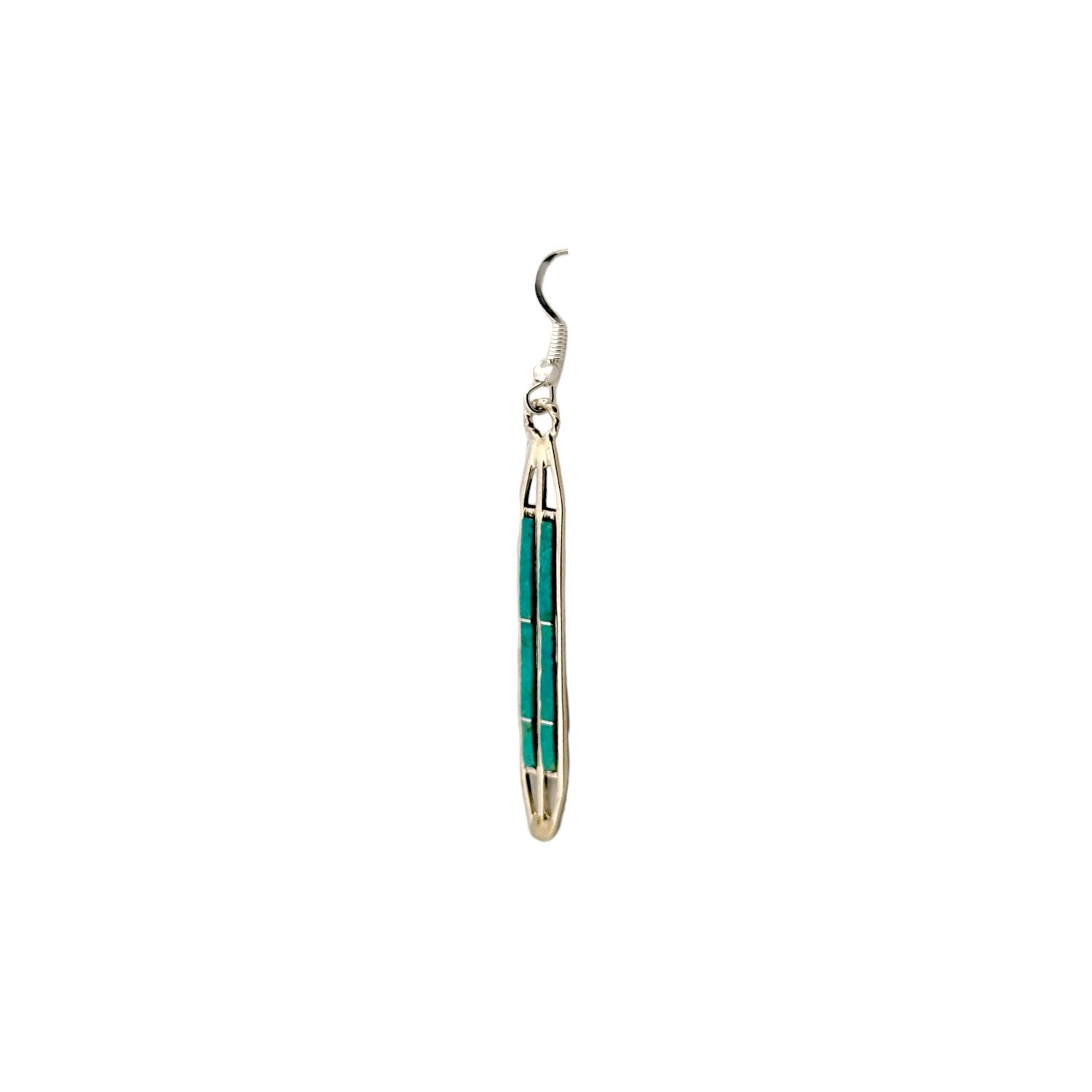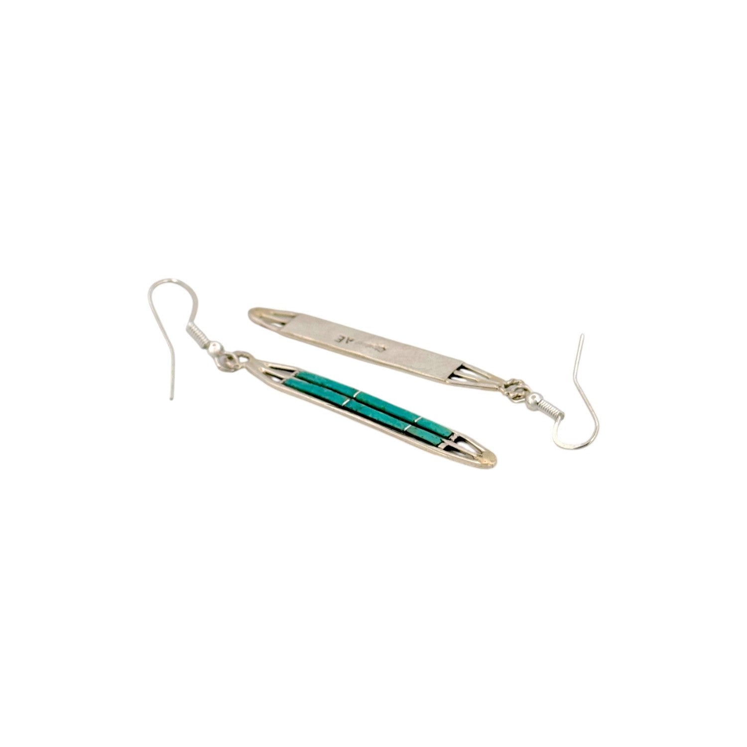 These elegant Zuni Handmade earrings by Andrew Enrico feature striking Kingman Turquoise inlaid within finely crafted sterling silver. The long, slender design showcases carefully cut turquoise stones set in a vertical channel inlay style, highlighting the artist’s precision and craftsmanship. The vibrant blue-green tones of the Kingman Turquoise create a beautiful contrast against the polished silver framework. Their elongated shape offers a graceful, modern silhouette while still reflecting traditional Zuni inlay techniques. These earrings are a refined example of Zuni jewelry artistry, blending classic turquoise with sleek sterling silver design.