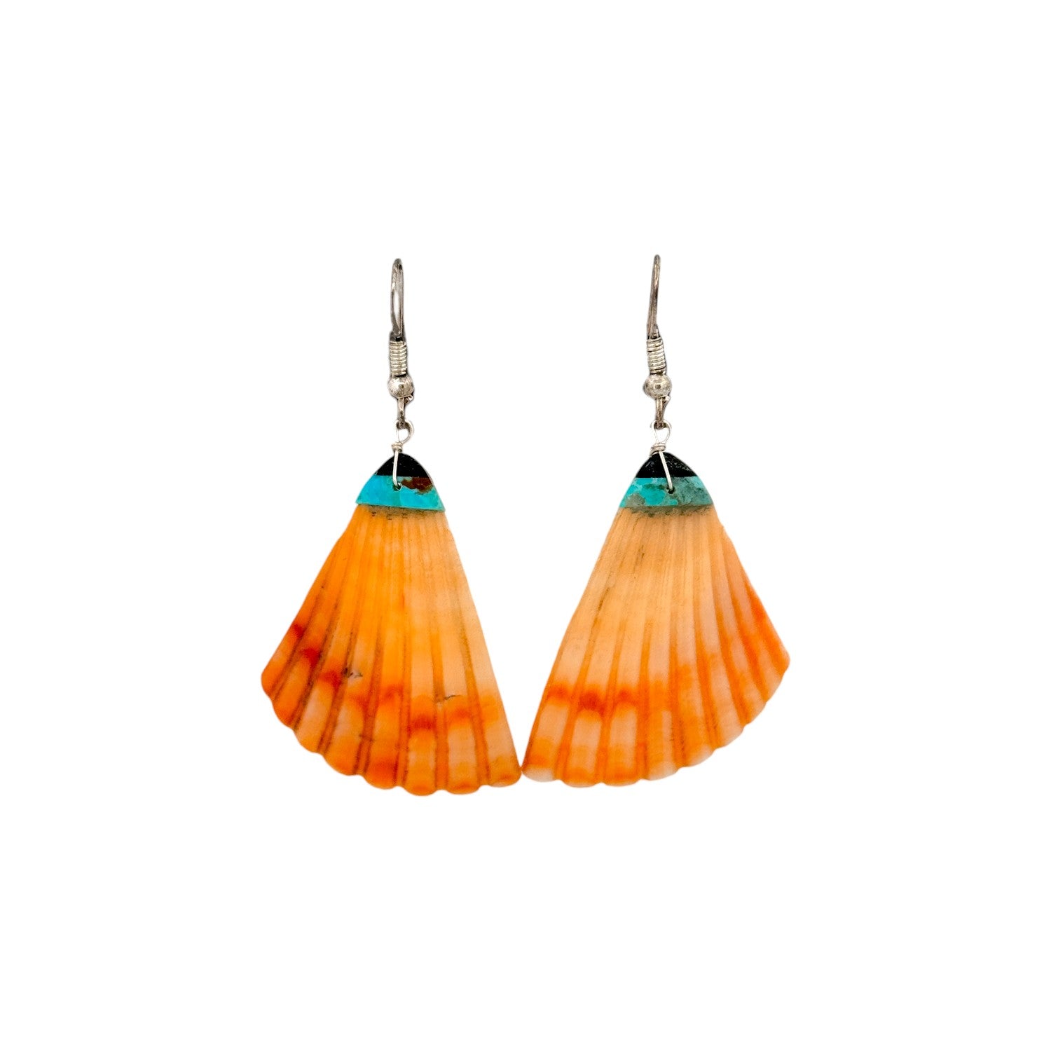 Jesus Espino Zuni handmade earrings feature vibrant spiny oyster shell paired with Kingman turquoise and jet, set in sterling silver. The fan-shaped spiny oyster shell displays warm shades of orange with natural striations that create a bold, sunlit glow. At the top, a striking inlay of bright Kingman turquoise and deep black jet adds contrast and visual balance. Suspended from sterling silver hooks, the earrings offer graceful movement and a lightweight feel. Rich in color and tradition, these earrings beautifully reflect the artistry and dynamic design of Zuni craftsmanship.