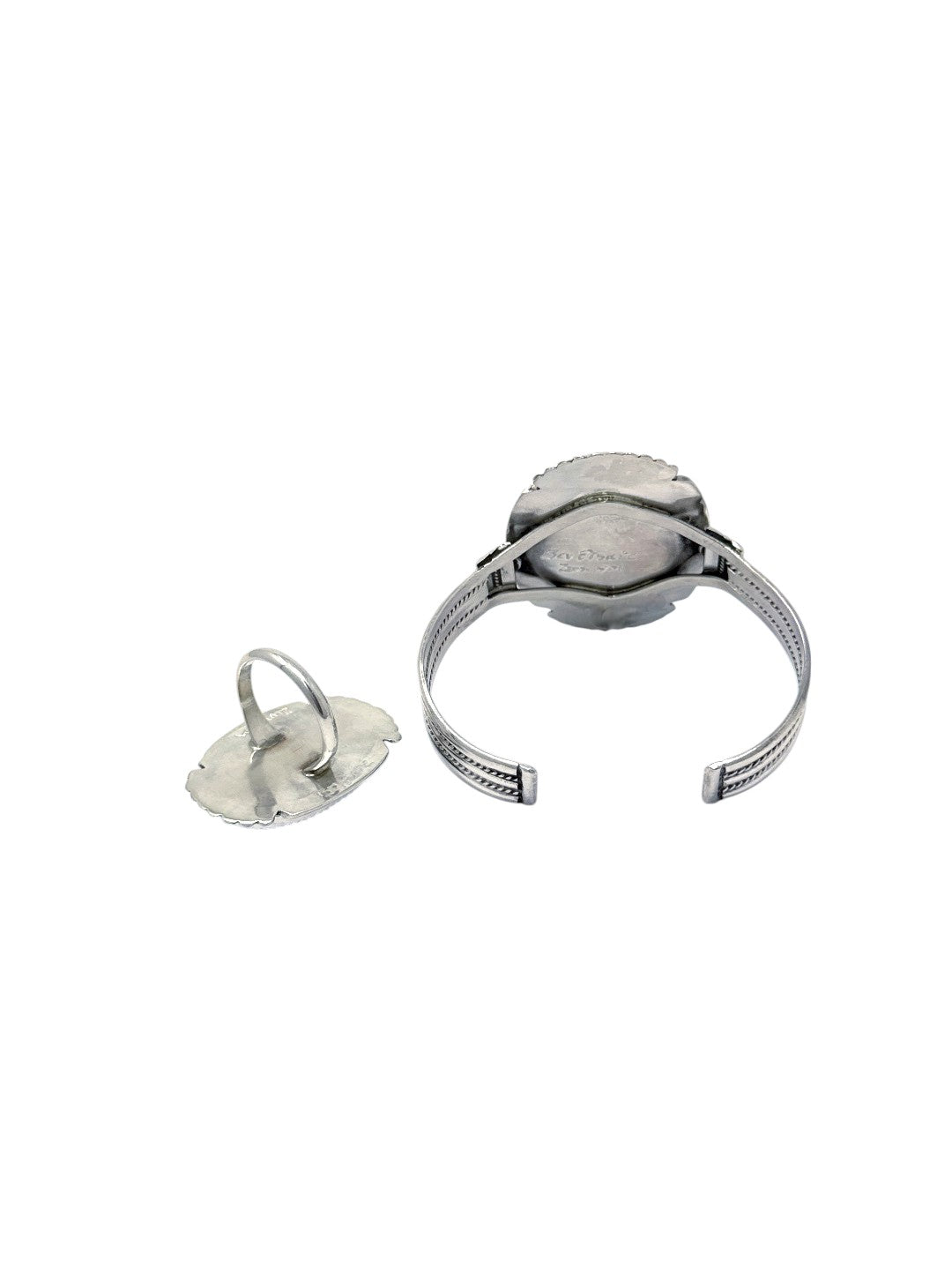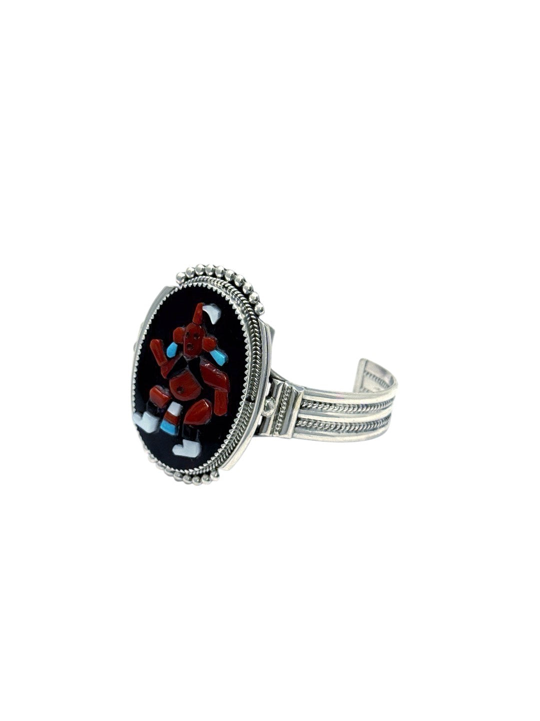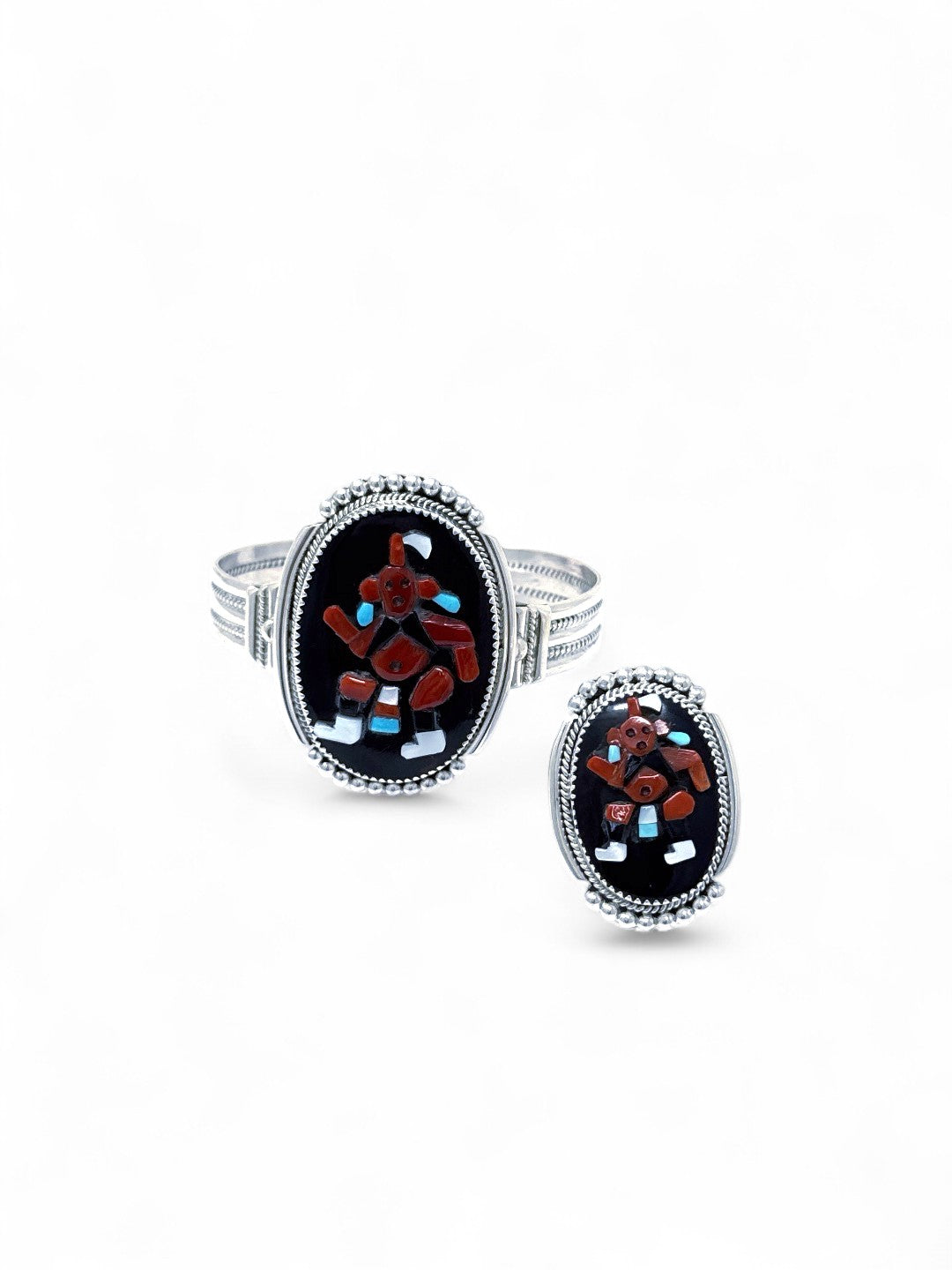 This striking bracelet and ring set by Zuni artisan Beverly Etsate is a masterclass in traditional stone craftsmanship. Handcrafted in sterling silver, both pieces feature detailed mosaic work using multi-stone materials including turquoise, coral, jet, and shell, forming the image of a traditional Zuni mudhead kachina. The stones are set against a sleek black background, which adds dramatic contrast and depth to the vibrant stones. Framed with fine silver beading and silver work, the set is both elegant and full of cultural significance. Each piece is a testament to Etsate’s precision, artistry, and dedication to preserving Zuni storytelling through jewelry. A rare and collectible set for those who value wearable art rooted in heritage.