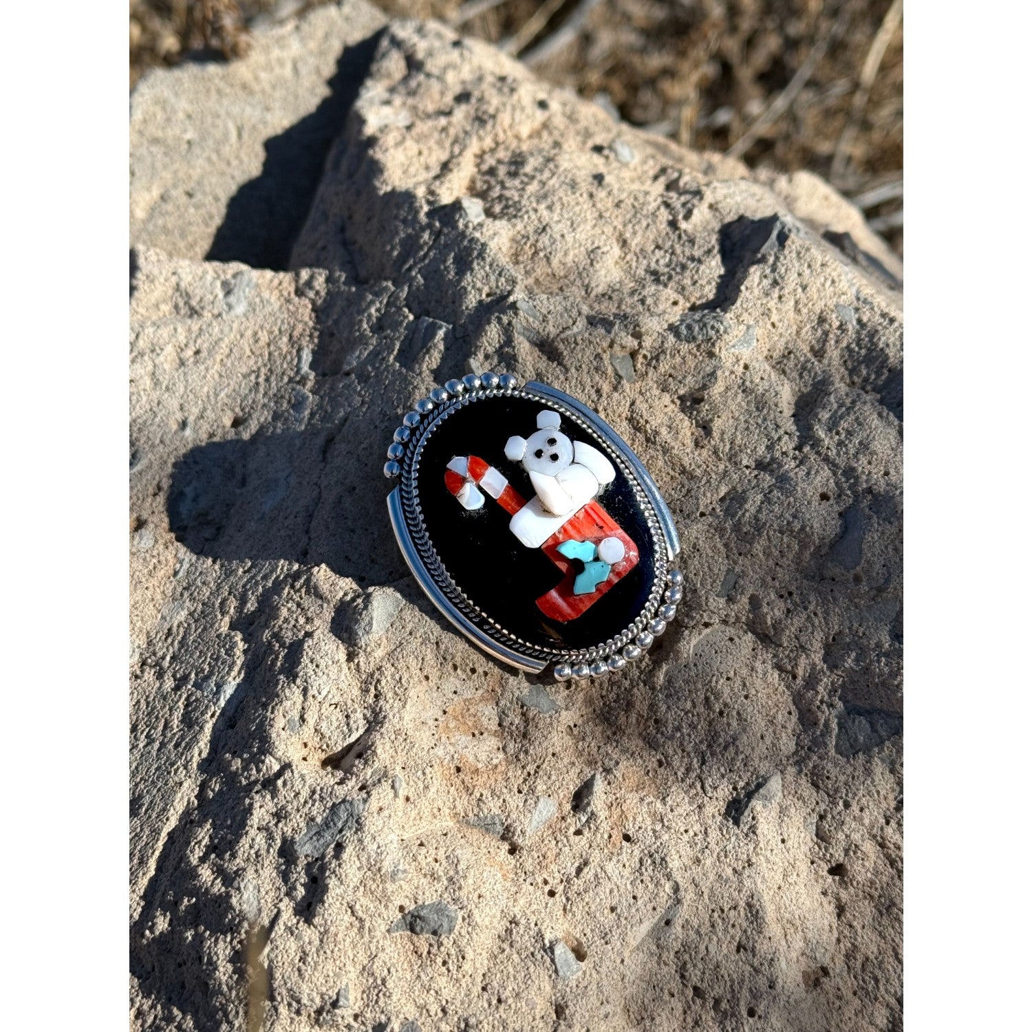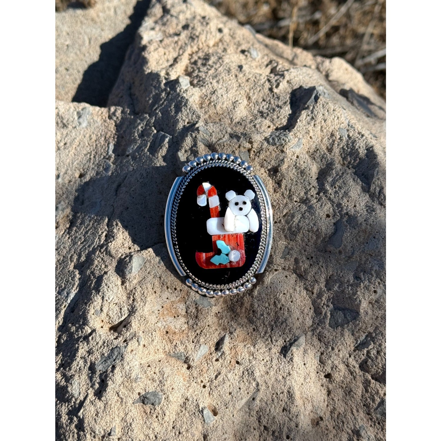 This charming Zuni handmade pendant–pin by Bev Etsate features a playful holiday stocking scene crafted with exceptional stone inlay skill. Set against a smooth jet background, the design incorporates mother of pearl, coral, spiny oyster shell, and Sleeping Beauty turquoise to form a festive stocking, candy cane, and delightful bear figure. Each tiny stone is expertly shaped and fitted, showcasing the precision and artistry for which Zuni lapidaries are known. The piece is framed in finely crafted sterling silver with delicate beadwork that enhances its classic elegance. Wearable as either a pendant or pin, this collectible artwork brings together whimsy, tradition, and masterful craftsmanship.