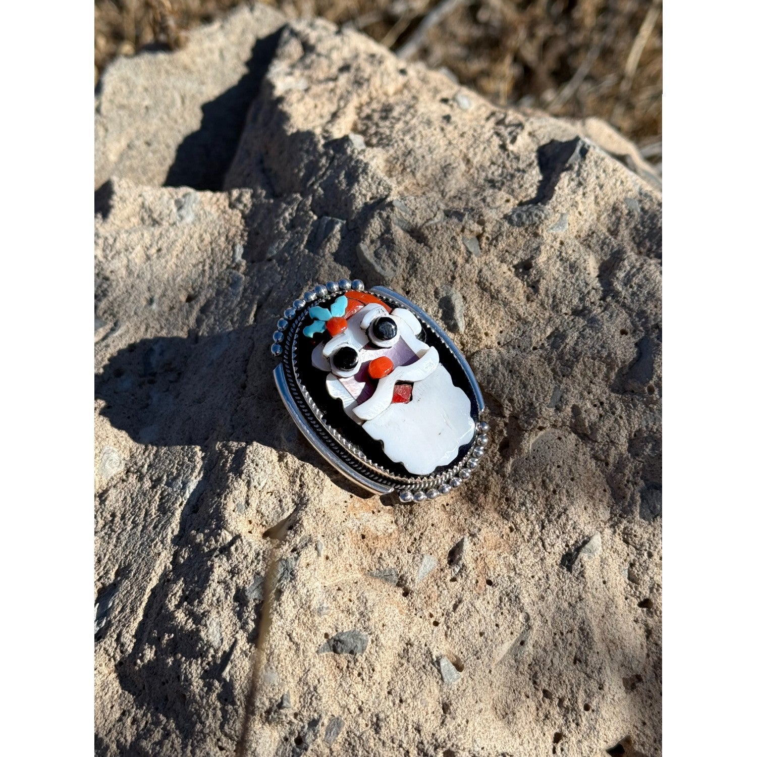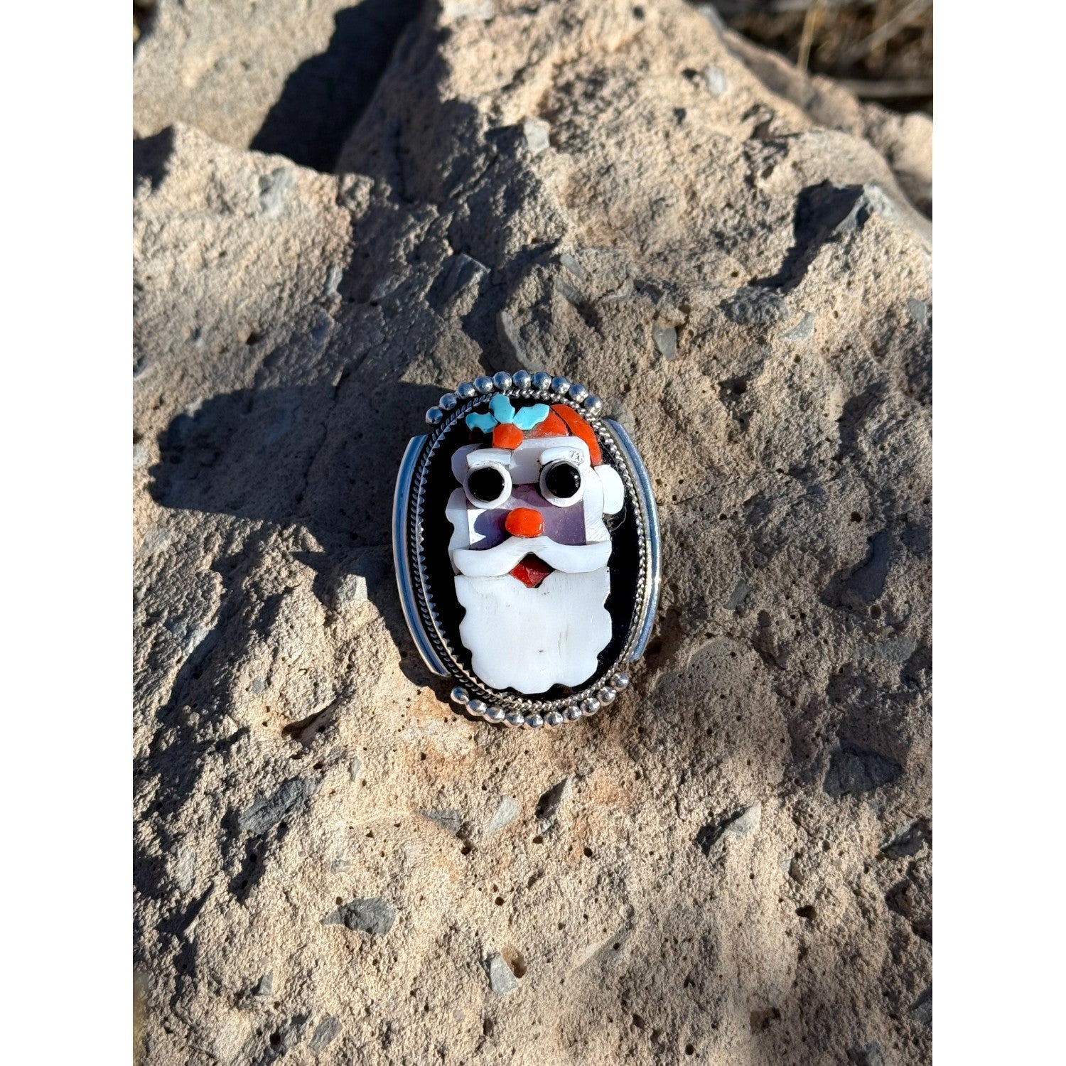 This playful Zuni handmade pendant–pin by Bev Etsate features a beautifully inlaid Santa Claus rendered with charming character and remarkable stonework detail. Set on a glossy jet background, the face and beard are crafted from luminous mother of pearl, while accents of pink shell, vibrant coral, and bright Sleeping Beauty turquoise bring his hat and features to life. Each stone is expertly shaped and fitted, creating expressive eyes, a joyful smile, and festive color contrasts. The piece is framed in finely crafted sterling silver with traditional beadwork that enhances its classic Zuni aesthetic. Wearable as both a pendant and pin, this unique artwork captures holiday cheer through masterful Indigenous craftsmanship.