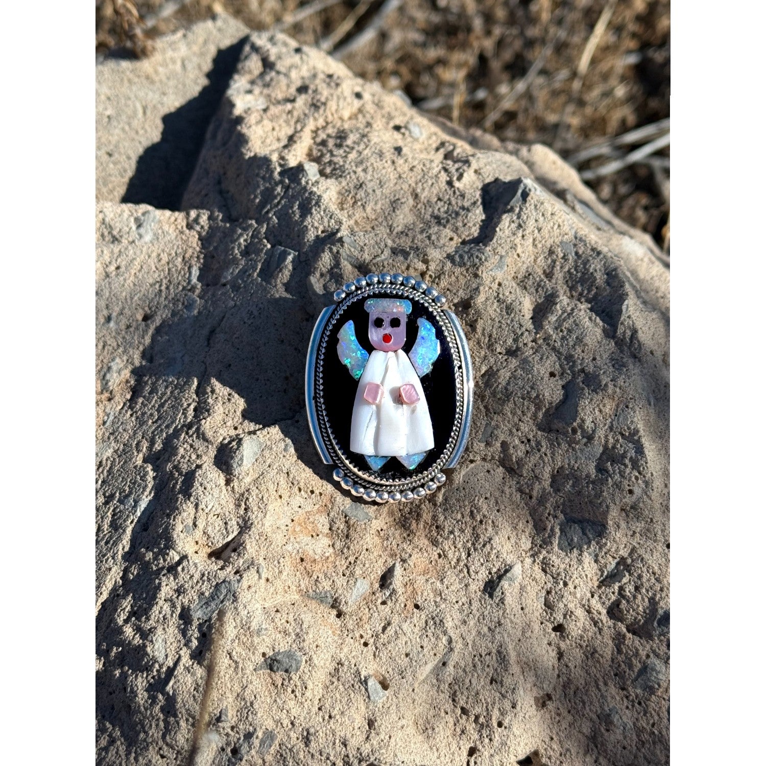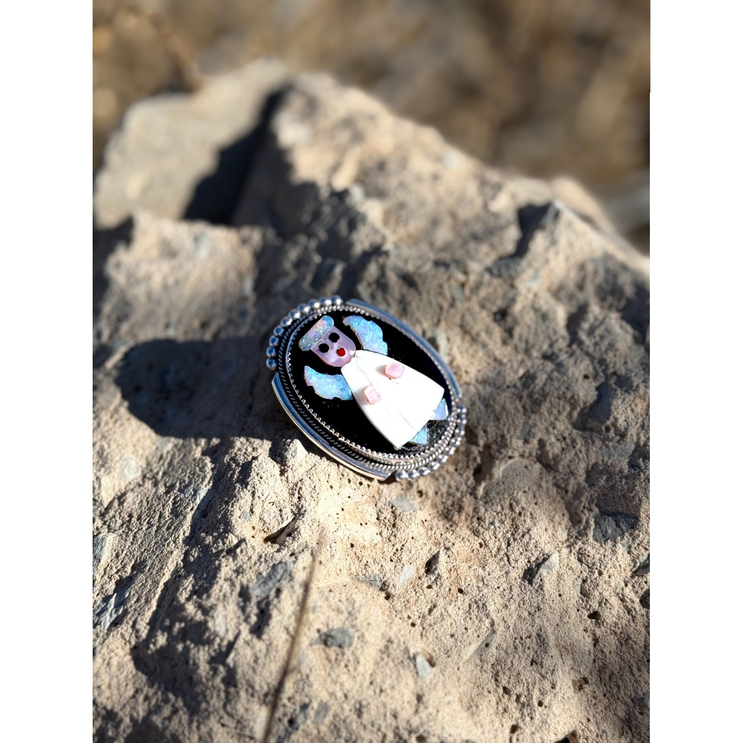 This graceful Zuni handmade pendant–pin by Bev Etsate features a beautifully inlaid angel, created with exceptional detail and traditional stonework artistry. Set against a polished jet background, the angel’s gown and face are formed from luminous mother of pearl, while shimmering opal wings add a radiant, ethereal glow. Accents of pink shell and coral bring gentle color to the angel’s features, enhancing its warm and uplifting expression. The piece is framed in finely crafted sterling silver, complete with delicate beadwork that highlights its classic Zuni style. Wearable as both a pendant and pin, this enchanting artwork embodies elegance, spirituality, and masterful Indigenous craftsmanship.