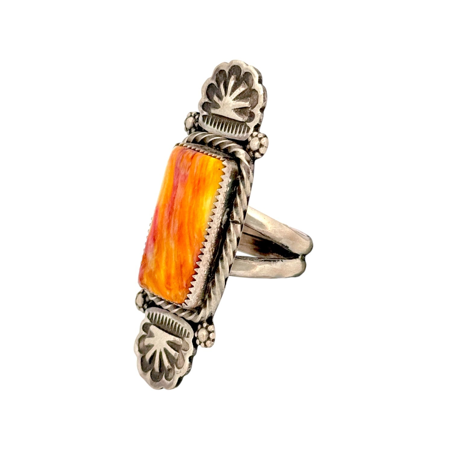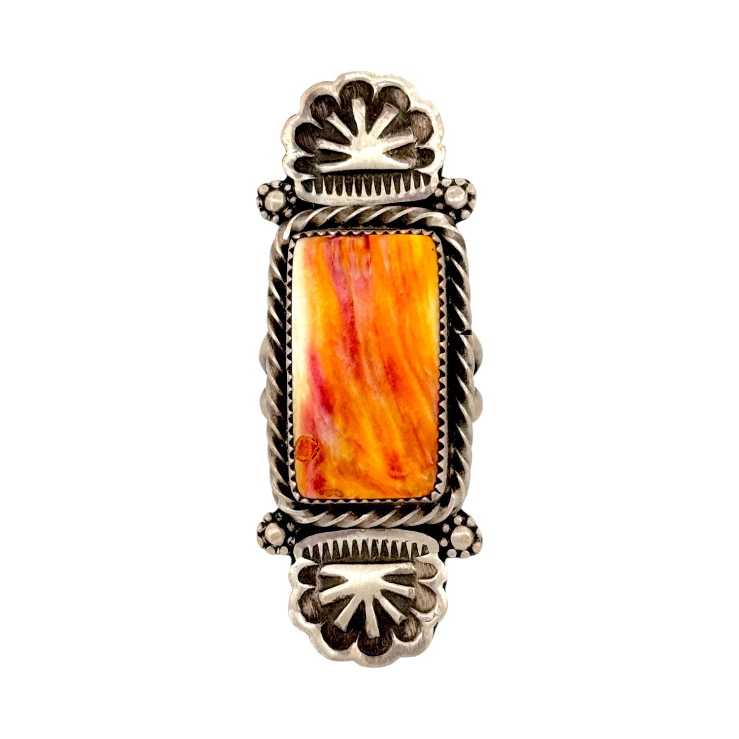 This handcrafted ring by Navajo artist Chris Etsitty captures the vibrant beauty of spiny oyster shell in a bold, rectangular design. The stone radiates with a fiery blend of orange, coral, and subtle purple hues, evoking the warm tones of a desert sunset. Etsitty sets the shell in a finely detailed sterling silver bezel, surrounded by a hand-twisted rope border and framed with traditional stamped fans and beadwork. The balance of symmetry and texture reflects the artist’s mastery of Navajo silversmithing. Each detail, carefully shaped and polished, adds depth and dimension to the ring’s overall presence.