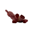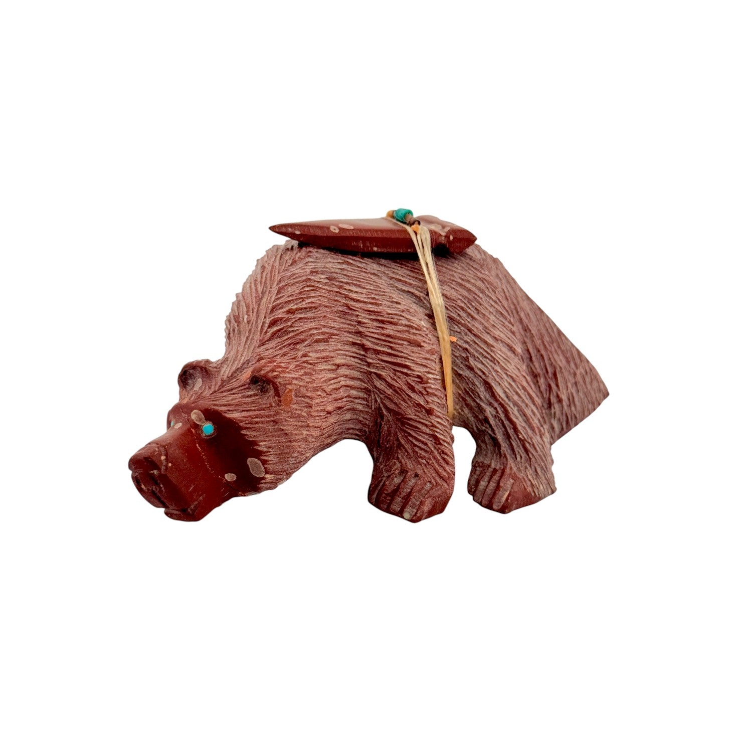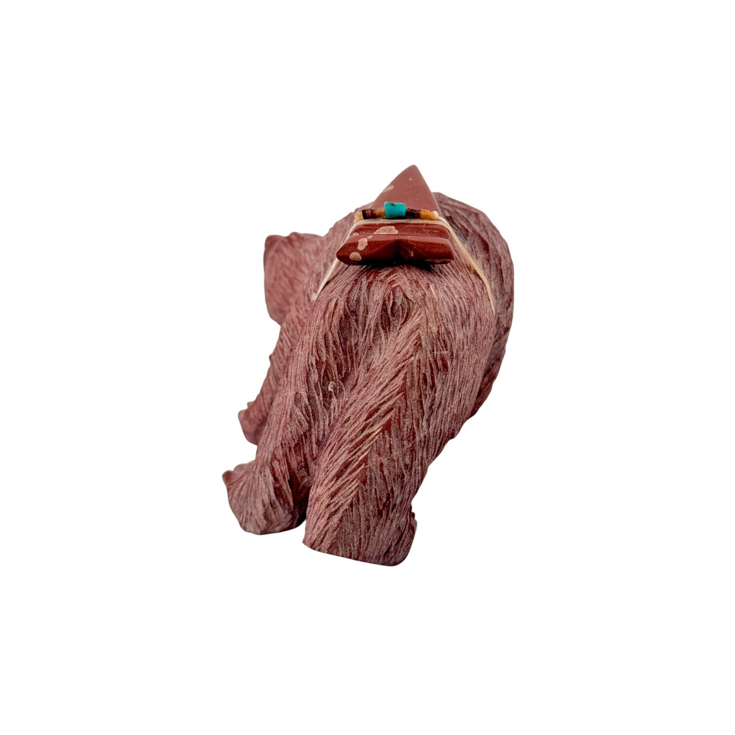 This Zuni hand-carved Bear Fetish by Albert Eustace is sculpted from rich red pipestone, its warm earthy tones beautifully highlighting the finely incised fur details. The bear’s powerful stance and lowered head convey strength, protection, and quiet determination; qualities traditionally associated with the bear in Zuni culture. Inlaid Kingman Turquoise accents bring a vibrant touch of blue, offering striking contrast against the deep red stone. The piece is adorned with a carved pin shell bundle, secured with natural sinew, adding both texture and symbolic significance. Expertly shaped and carefully polished, this carving reflects Eustace’s skilled craftsmanship and the enduring spirit of Zuni hand-carved artistry.