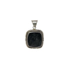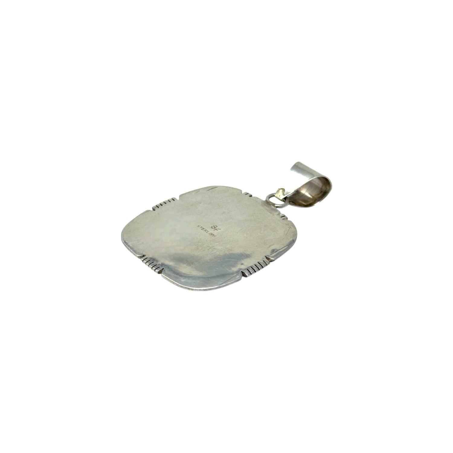This Navajo handmade pendant by Steve Francisco exudes quiet strength and elemental elegance. Featuring a polished slab of deep black obsidian, the stone radiates a subtle luster that echoes the mystery of volcanic origins. Set in a sterling silver bezel, the frame is accented with finely twisted rope detailing and traditional stamp work, reflecting the artist’s mastery of silversmithing. Obsidian, revered for its protective qualities and grounding energy, lends this pendant a spiritual dimension beyond its bold aesthetic. Francisco’s work balances clean lines with cultural symbolism, resulting in a piece that feels both modern and deeply rooted in Navajo tradition.