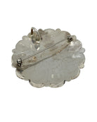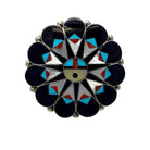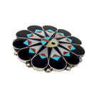Zuni artist Delwin Gasper specializes in Sunface creations. You will find he designs Surfaces into pendants, pins, bolos, concho belts and amazing rings. Delwin combines jet, mother of pearl, coral, and turquoise stones to create this mosaic inlay piece. You will find the stones are surrounded by a mirror shined sterling silver and finished with an easy wearing pin/pendant attachment. This decent size piece will look great on.