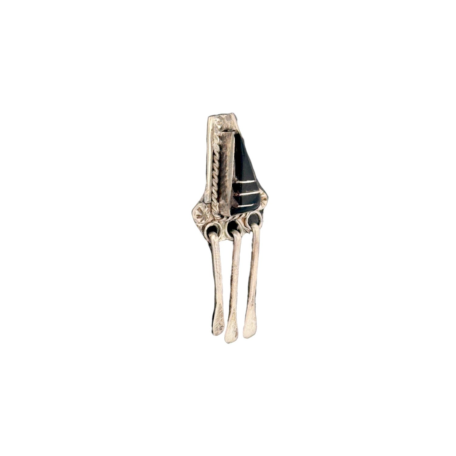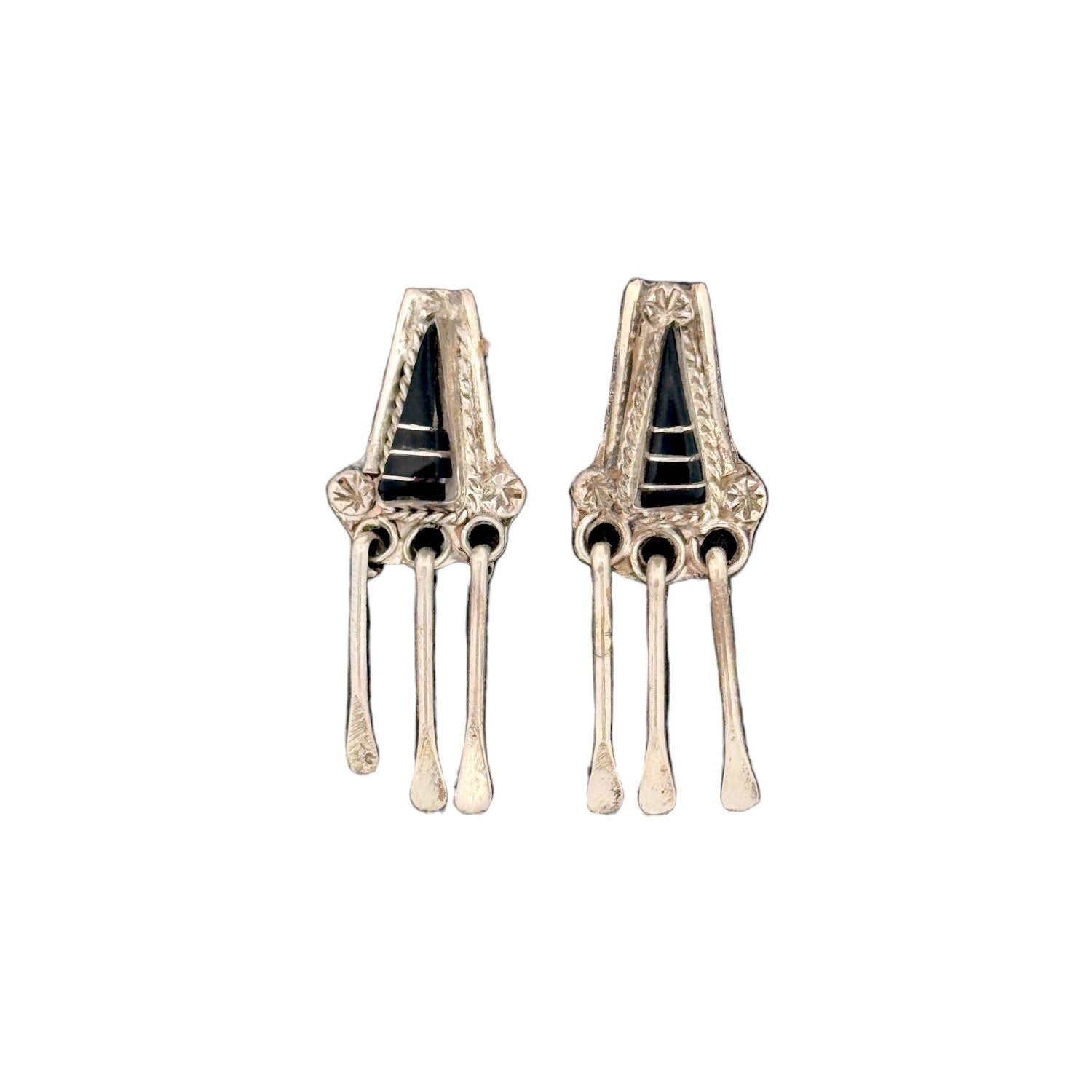 These striking earrings by Zuni artist Willie Gia feature the sleek, timeless elegance of Black Onyx, skillfully inlaid in a geometric triangular design. The deep black stones are complemented by fine sterling silver borders etched with intricate stamp work, adding both texture and character. Three silver dangles hang gracefully from each earring, creating gentle movement and a touch of traditional Zuni charm. The combination of bold stonework and delicate metal detailing showcases exceptional craftsmanship and balance. Lightweight yet eye-catching, these earrings blend modern sophistication with classic Zuni artistry.