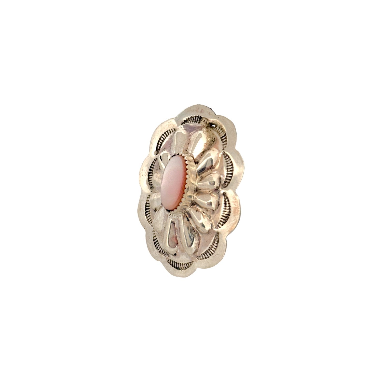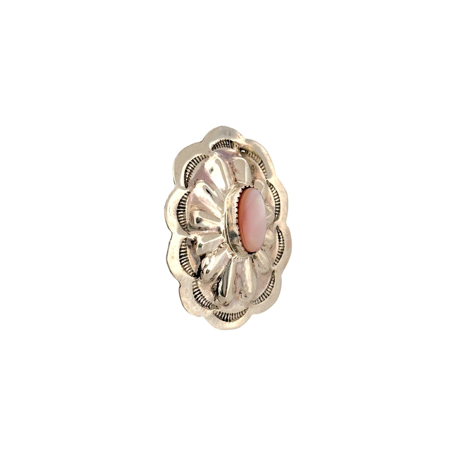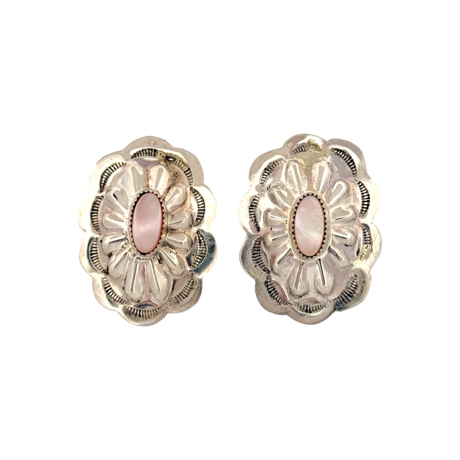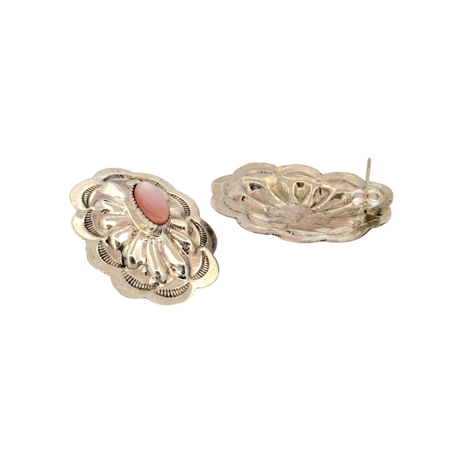 These beautiful earrings by Navajo artist Betty Gilmore feature soft, radiant pink shell stones that bring a gentle touch of color and elegance. Each oval stone is set in finely polished sterling silver, surrounded by intricate hand-stamped Concho-style detailing that reflects classic Navajo design. The scalloped edges and raised repoussé work give these earrings depth and dimension, highlighting Gilmore’s attention to detail and skilled craftsmanship. The subtle sheen of the pink shell pairs perfectly with the bright silver, creating a look that is both feminine and timeless. Lightweight and comfortable, they are ideal for everyday wear or special occasions.