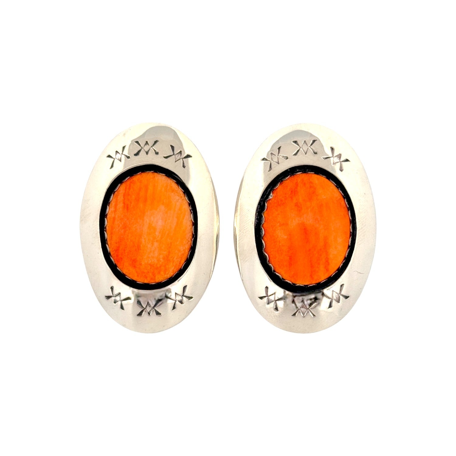 These radiant earrings by Navajo artist Lyanne Goodluck feature the glowing warmth of spiny oyster shell, beautifully contrasted against hand-polished sterling silver. Each oval stone displays vivid shades of orange with natural marbling, symbolizing vitality and connection to the earth. The stones are set in finely crafted bezels, surrounded by detailed stampwork and oxidized accents that enhance the traditional Navajo aesthetic. Goodluck’s artistry balances elegance and heritage, bringing out the organic beauty of the shell while showcasing her skill in silverwork. These earrings are lightweight, versatile, and perfect for adding a bold Southwestern touch to any outfit.