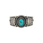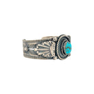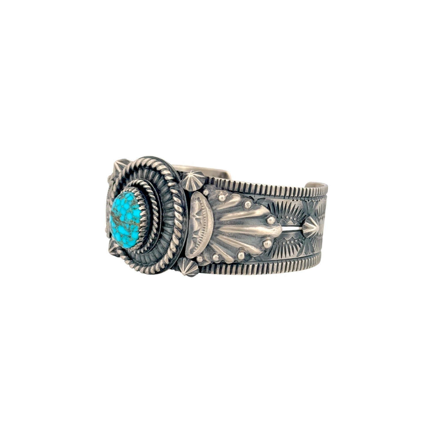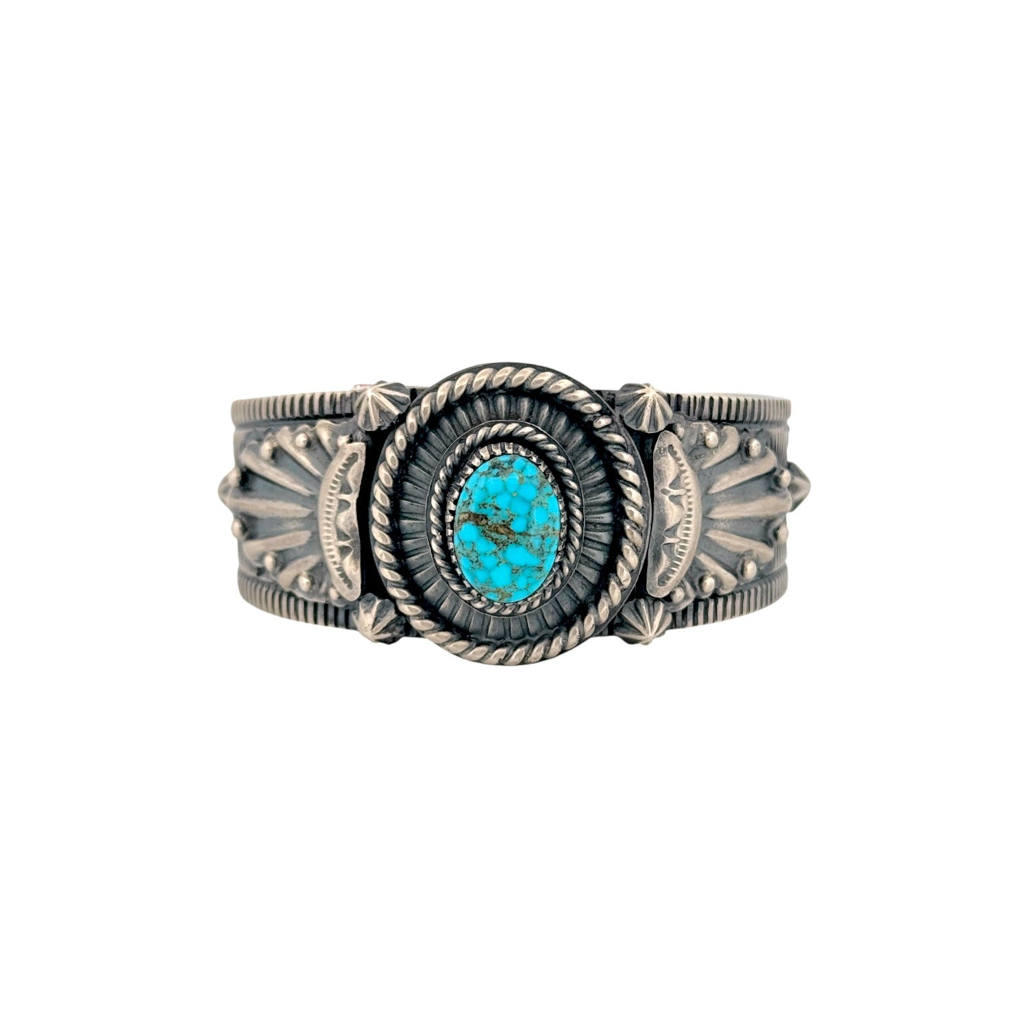This Andrew Gordon bracelet centers on a beautifully patterned Waterweb Kingman turquoise stone, rich in blue tones and intricate matrix. The stone is framed by a bold sterling silver bezel with twisted wire detailing that enhances its natural character. Gordon’s Navajo craftsmanship is showcased through deep stamp work, domed accents, and carefully balanced symmetry across the cuff. The oxidized finish adds depth, highlighting each hand-stamped design element. This Navajo handmade bracelet is a powerful blend of traditional silversmithing and premium turquoise artistry.