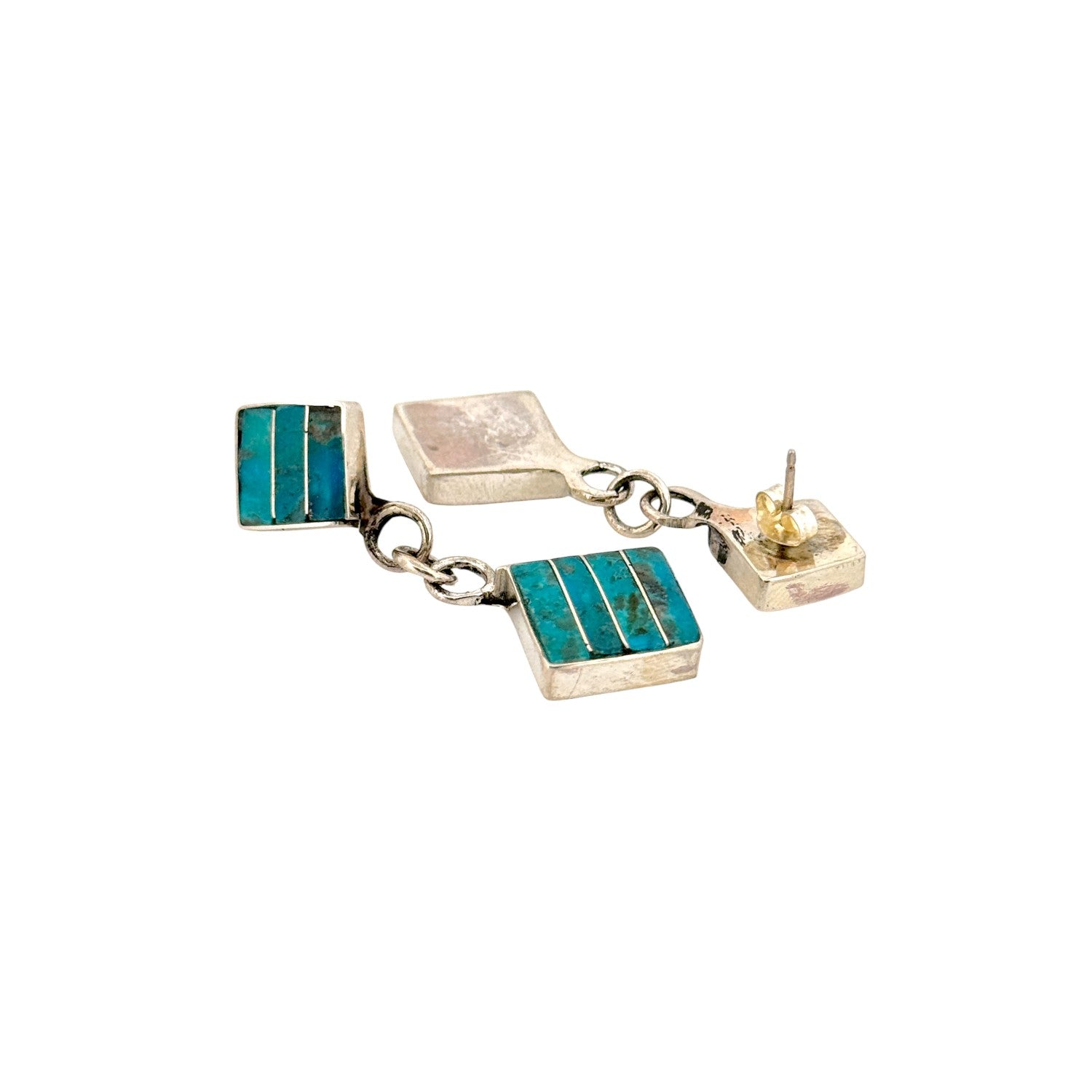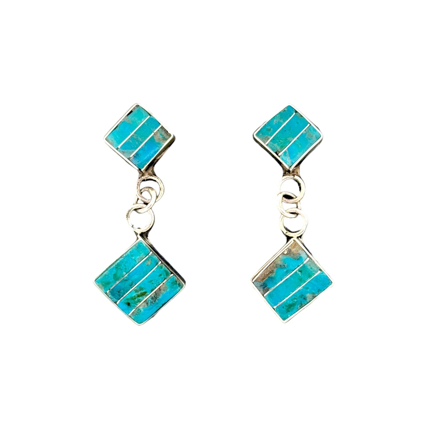 These graceful earrings by Zuni artist Michelle Halou feature two articulated diamond-shaped stations of vibrant Kingman Turquoise in each earring. The stones are finely inlaid in horizontal channels of turquoise, displaying the natural matrix and sky-blue tones for which Kingman is known. Linked with small sterling silver rings, the pieces have gentle movement that catches the light and showcases the craftsmanship. The clean geometric design reflects classic Zuni lapidary work; precise, balanced, and elegant.