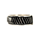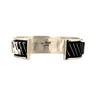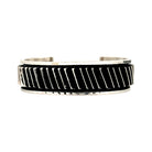 This striking bracelet by Navajo silversmith Tom Hank is a bold example of traditional craftsmanship blended with modern design. Hand-forged from sterling silver, the cuff features a deeply oxidized background that sets off the clean, diagonal line work carved across its surface. The strong geometric pattern creates a sense of movement and balance, giving the piece a refined yet rugged presence. Its darkened recesses contrast beautifully with the polished silver ridges, highlighting the artisan’s precision. The bracelet’s weight and texture speak to durability, while its open cuff design ensures a comfortable, adjustable fit. Both timeless and contemporary, this handmade piece embodies the artistry and heritage of Navajo silversmithing.