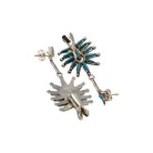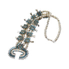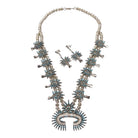 This stunning necklace and earring set by Virginia & Norman Hooee is a masterful expression of traditional Zuni craftsmanship, featuring radiant Sleeping Beauty turquoise in intricate cluster work. Set in sterling silver, each turquoise stone is precisely hand cut and arranged into classic sunburst patterns, reflecting the duo’s renowned attention to detail and symmetry. The necklace features a bold naja centerpiece, a hallmark of Southwestern design, surrounded by a double strand of squash blossom motifs. The accompanying earrings mirror the same elegant cluster arrangement, offering a perfectly matched and wearable complement to the necklace. Each component is handcrafted, highlighting the artisans’ expertise in lapidary and silverwork. Lightweight and beautifully balanced, this set merges elegance with cultural significance.