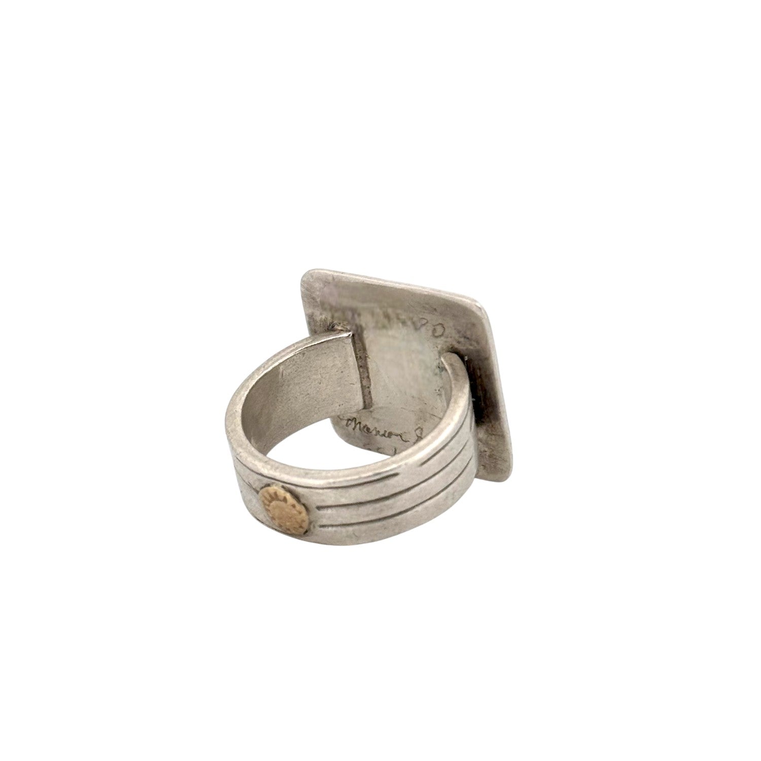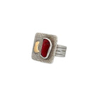 This striking Navajo handmade ring beautifully blends tradition with contemporary elegance. The bold red coral stone, rich in natural color and energy, is set against a textured sterling silver background that enhances its organic beauty. A touch of 14K gold adds warmth and sophistication, symbolizing harmony between earth and sun. The handcrafted design features clean lines and a modern rectangular form, giving it a distinctive Southwest flair.