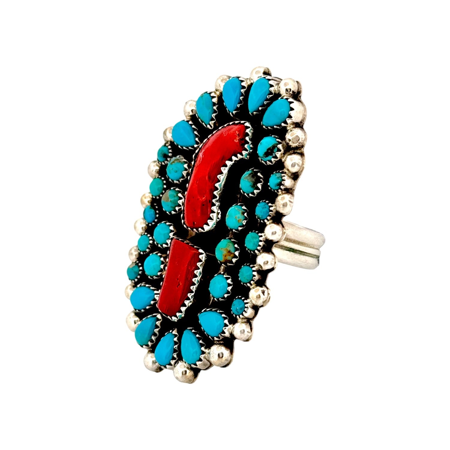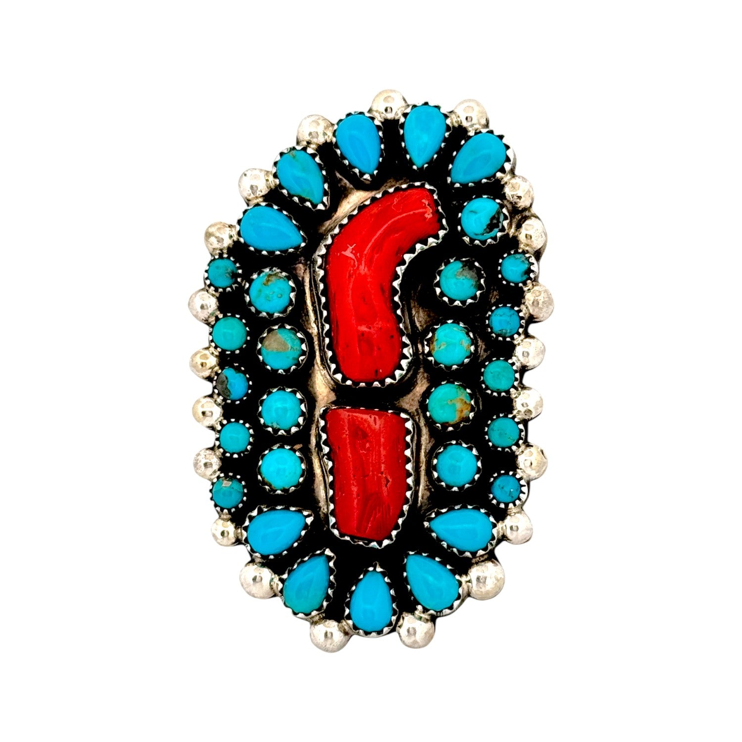This vibrant ring by renowned Navajo silversmith Tommy Jackson showcases a dynamic pairing of Kingman turquoise and deep red coral. The bold coral stones form the centerpiece, their organic shapes framed by a radiant cluster of bright turquoise cabochons. Each gem is hand-set in fine sterling silver with serrated bezels, accented by silver drops that add texture and brilliance. Jackson’s masterful craftsmanship reflects the perfect balance between traditional Navajo design and contemporary flair. The contrast of vivid red and sky blue evokes the striking colors of the Southwest landscape; earth and sky in harmony.